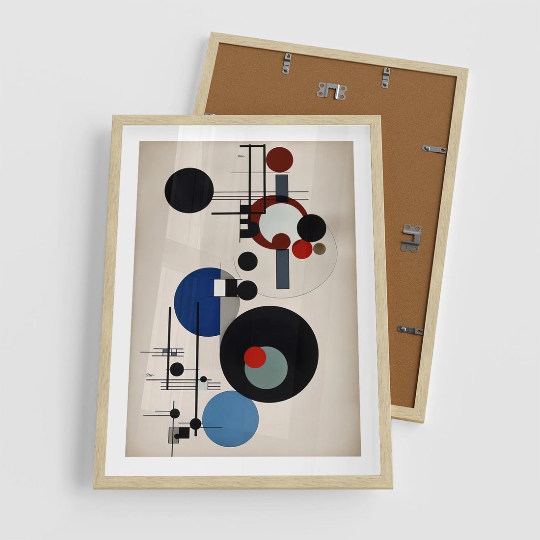 Ta abstrakcyjna geometryczna kompozycja inspirowana stylem Wassily'ego Kandinsky'ego połącza dynamiczne koła i linie w harmonijną całość. Zaskakujące połączenia kształtów tworzą fascynującą podróż wzrokową, podobnie jak w dziełach mistrza abstrakcji. To wyjątkowe dzieło sztuki emanuje energią i pasją, oddając hołd twórczości Kandinsky'ego w nowoczesnym kontekście.