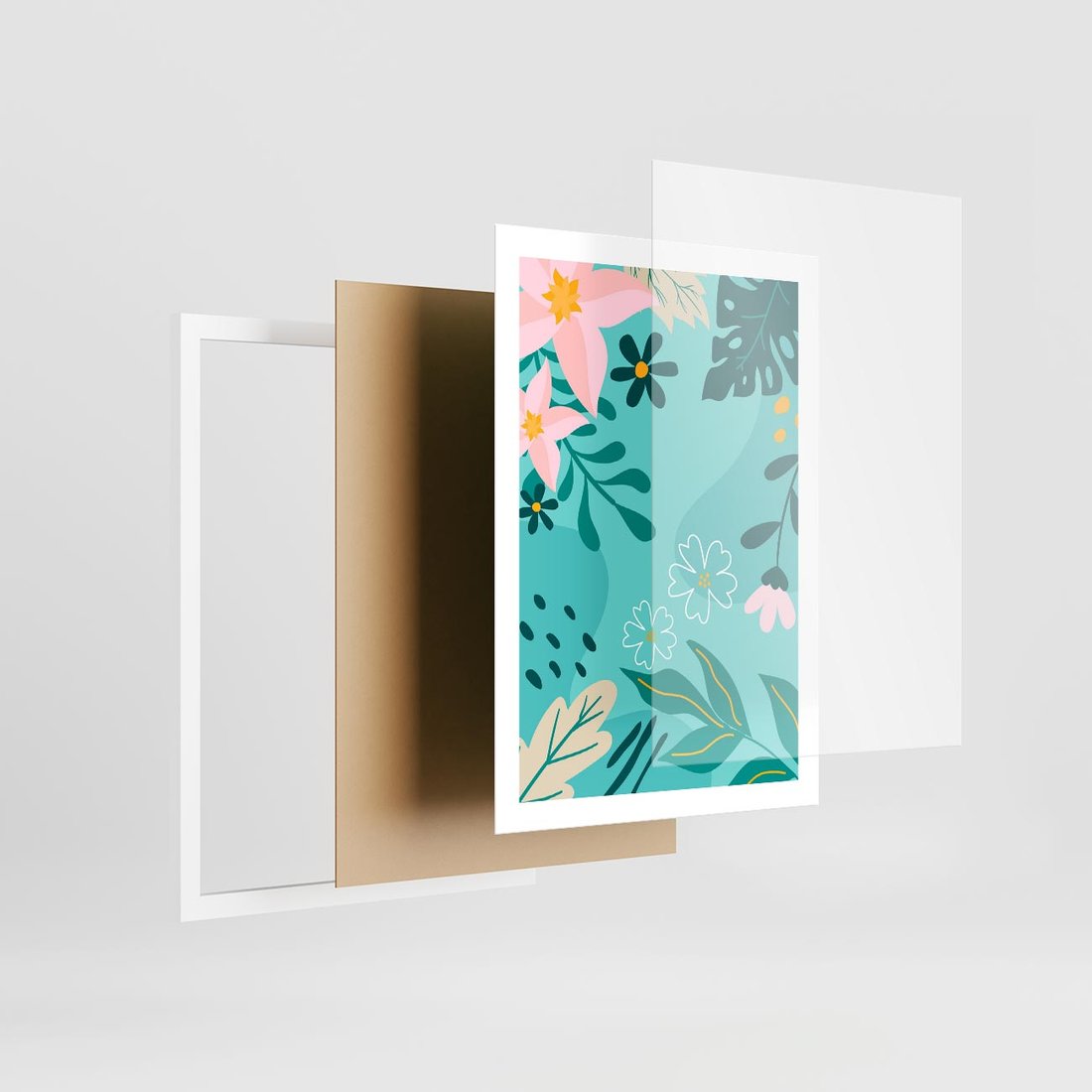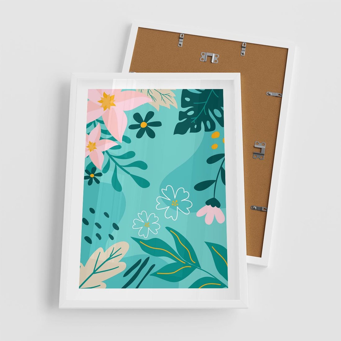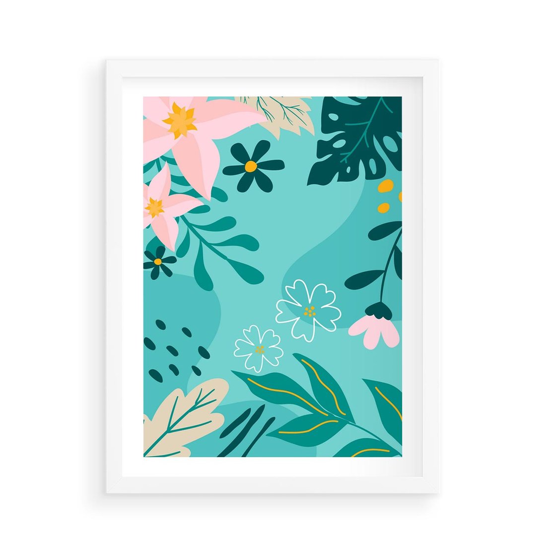 Pastelowa kompozycja ożywiona tropikalnymi kwiatami i liśćmi. Delikatne odcienie turkusu i różu tworzą wizualne radosne piękno, przywołując atmosferę egzotycznej harmonii.