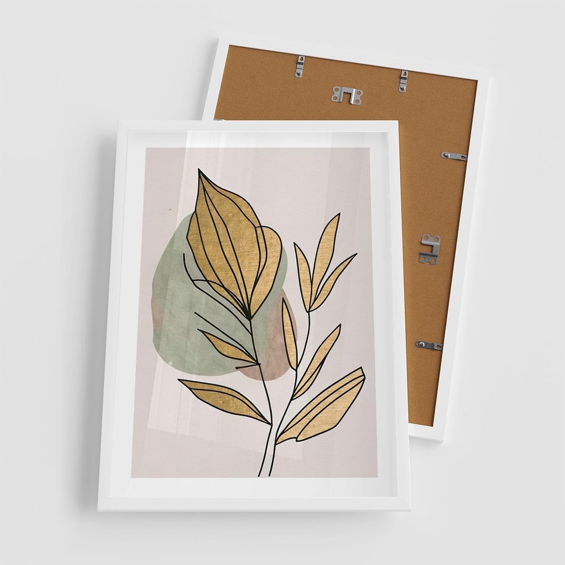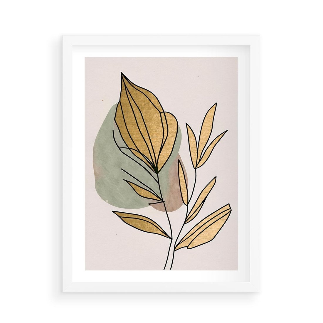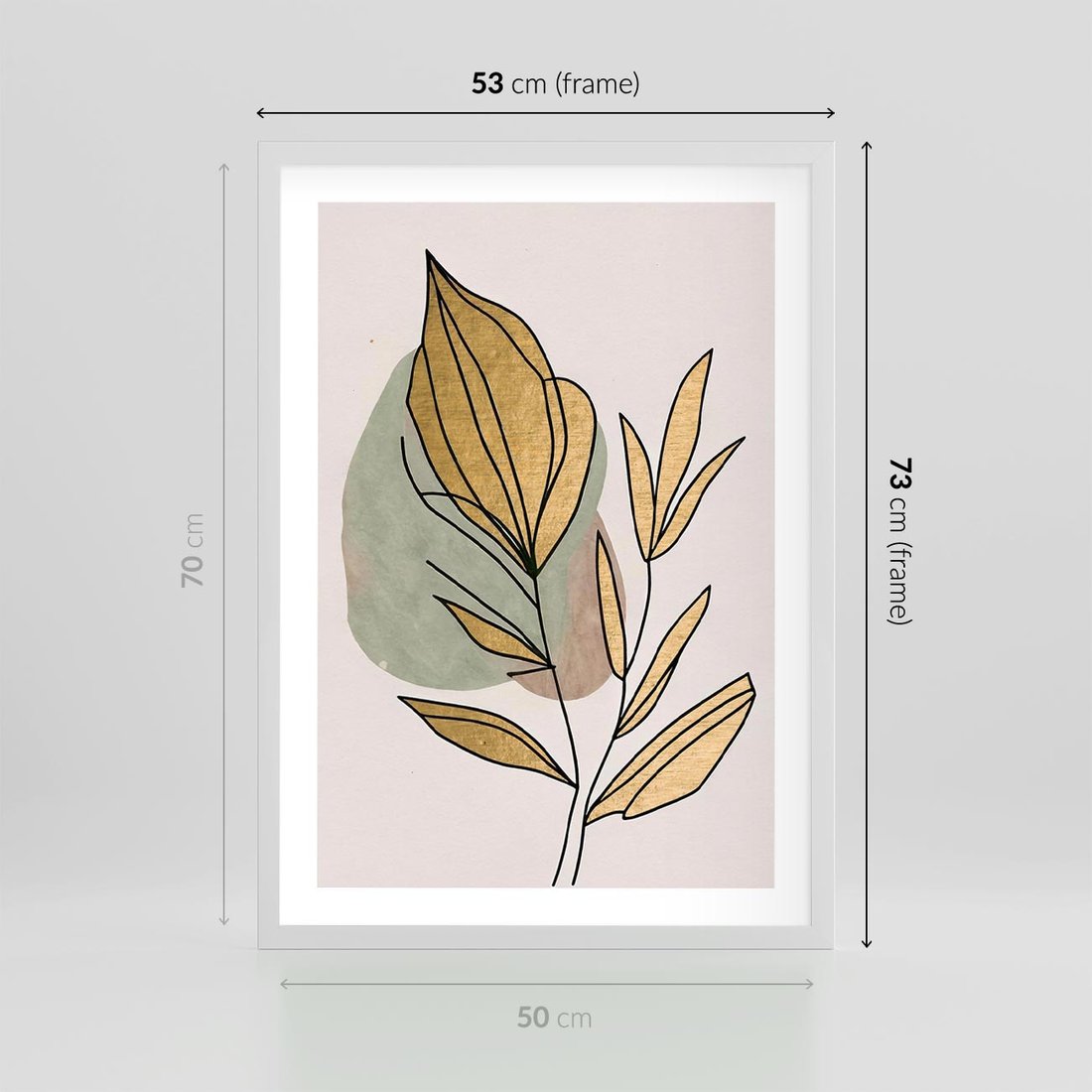 Ten abstrakcyjny obraz w stylu boho jest prawdziwym dziełem sztuki, gdzie liście łączą się z delikatnymi złotymi elementami, tworząc piękny kontrast i harmonię. Złote liście dodają elegancji i blasku, podkreślając naturalne piękno roślin. Kompozycja emanuje subtelnym urokiem i przytulnością, idealnie pasując do różnych wnętrz i dodając im wyjątkowego charakteru.