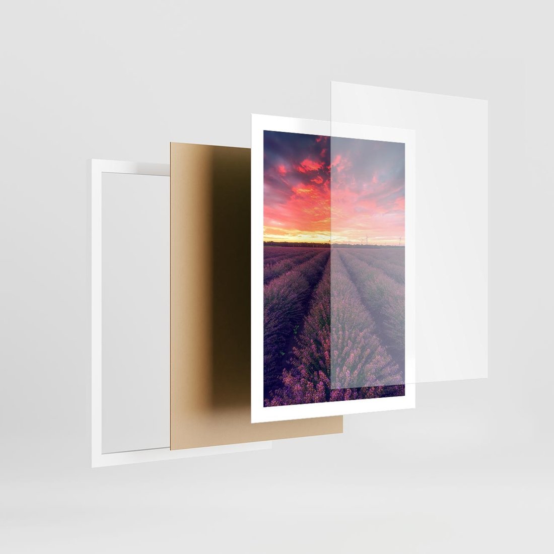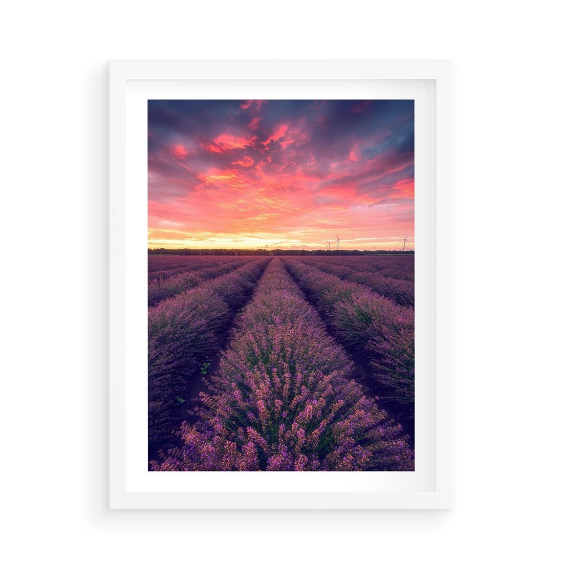 Plakat w ramie 50x70 - Różowe Niebo nad Polami - pola lawendy, zachód słońca - rama biała