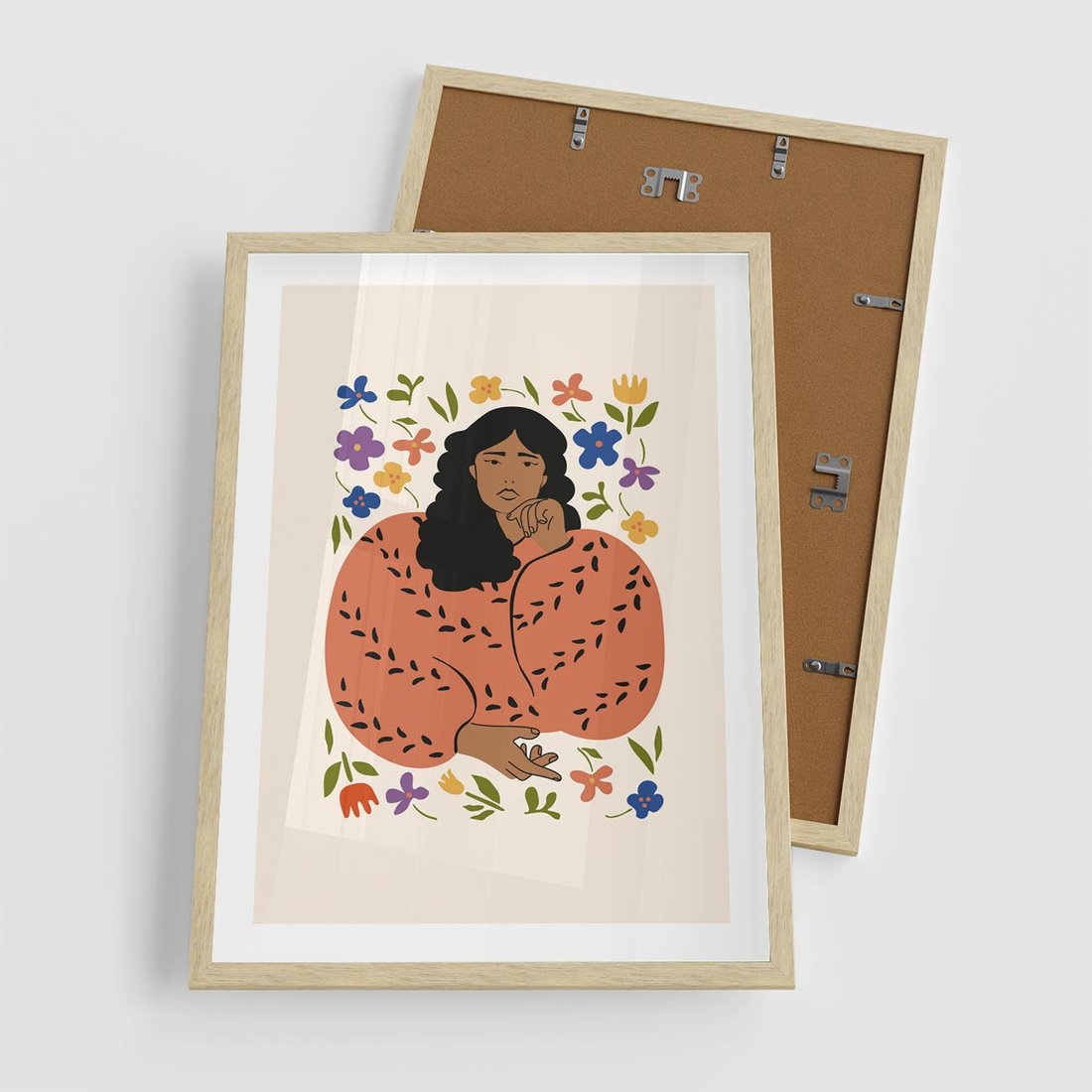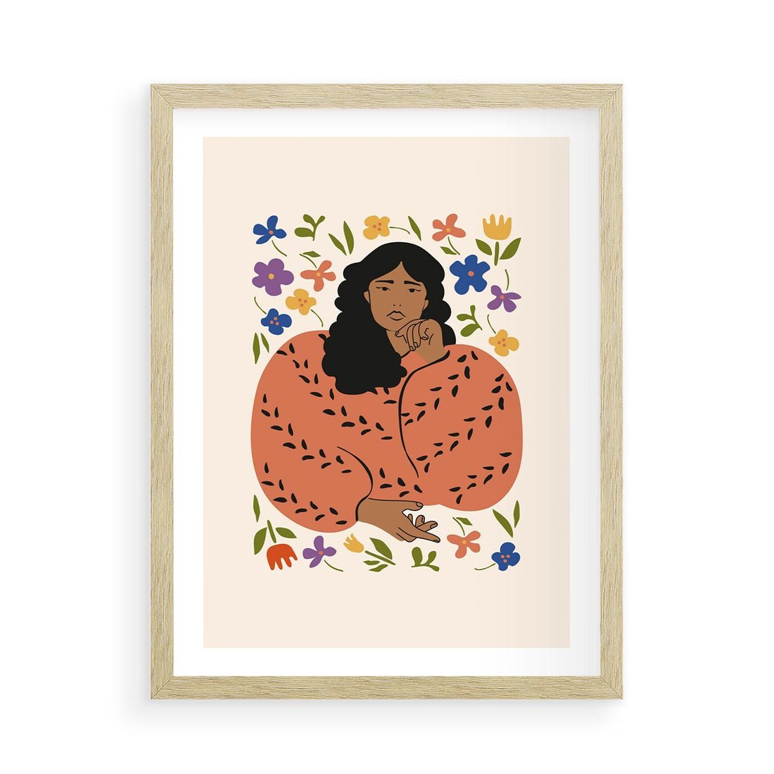 Plakat w ramie 50x70 - Rozplątane Emocje - nowoczesny plakat, kobieta otoczona kwiatami - rama drewno
