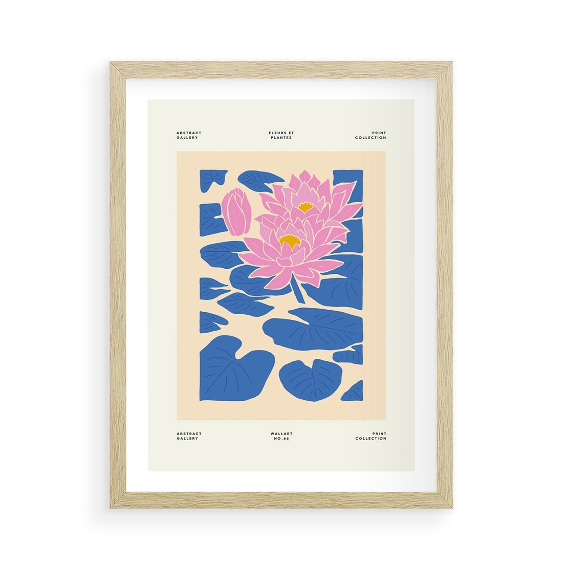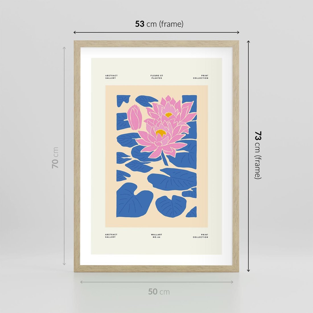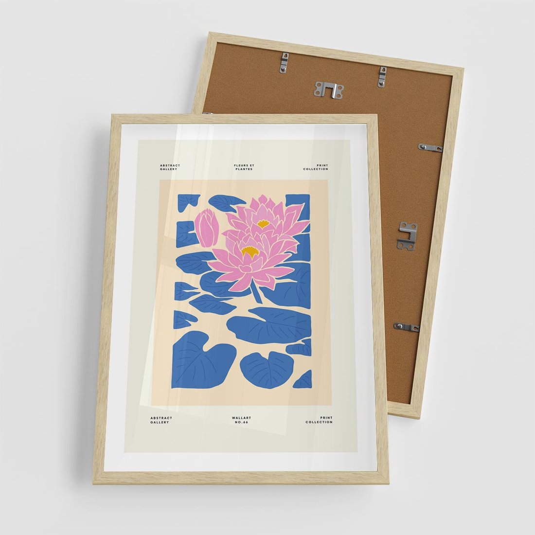 Ten nowoczesny plakat ukazuje pastelowe lilie wodne w odcieniach błękitu i różu, tworząc spokojny i oniryczny obraz. Sztuka ta jest idealnym dodatkiem do sypialni, tworząc atmosferę sennej harmonii i piękna natury.