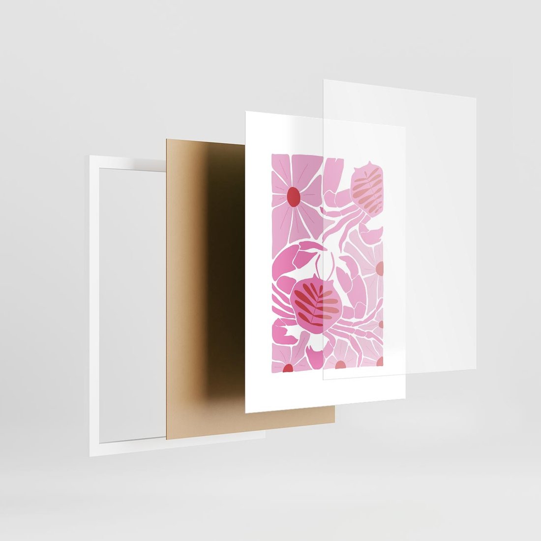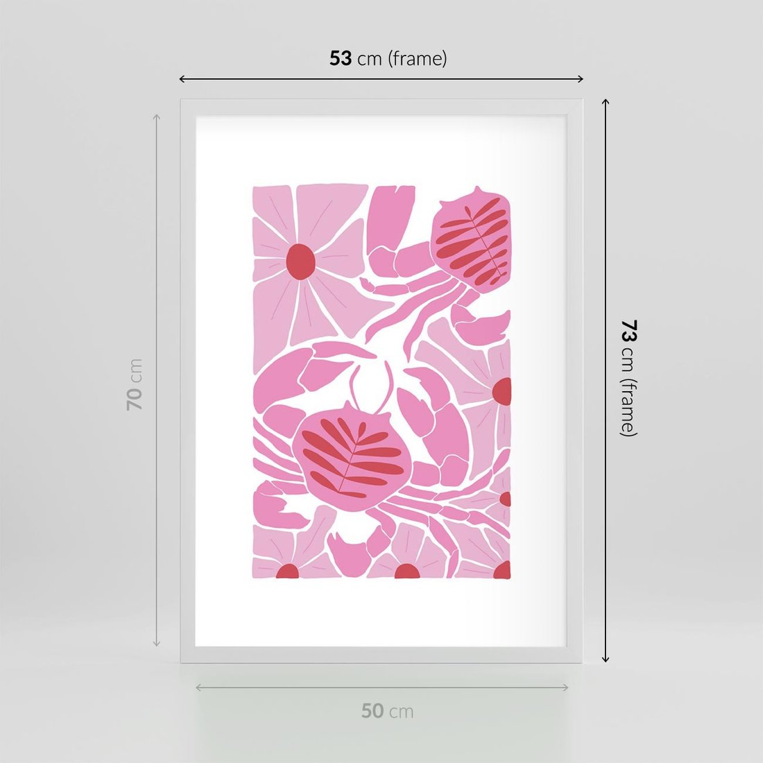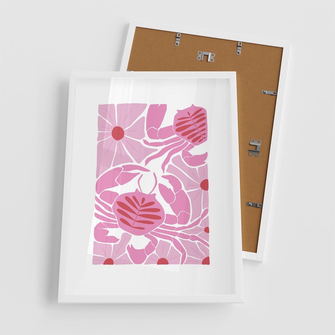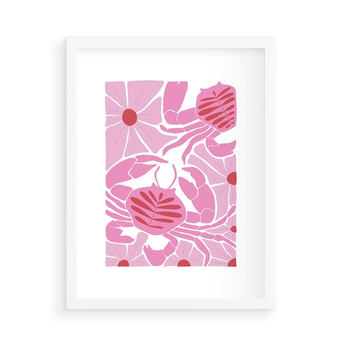 Plakat w ramie 50x70 - Roztańczone Kraby - różowe kwiaty i kraby, abstrakcyjna kompozycja - rama biała