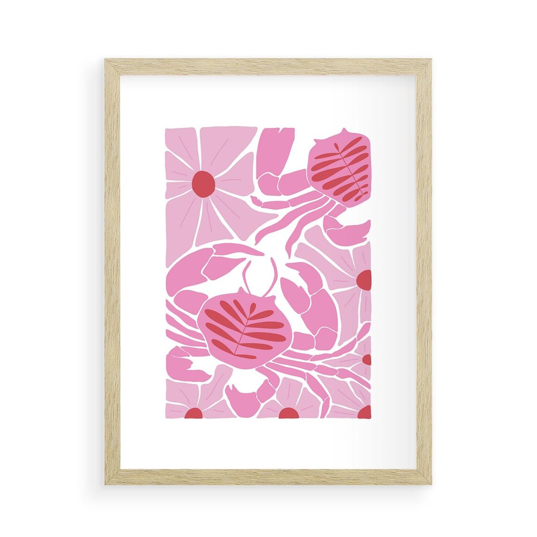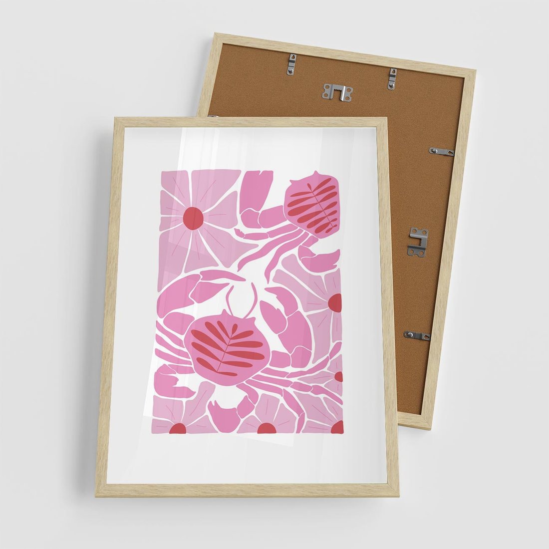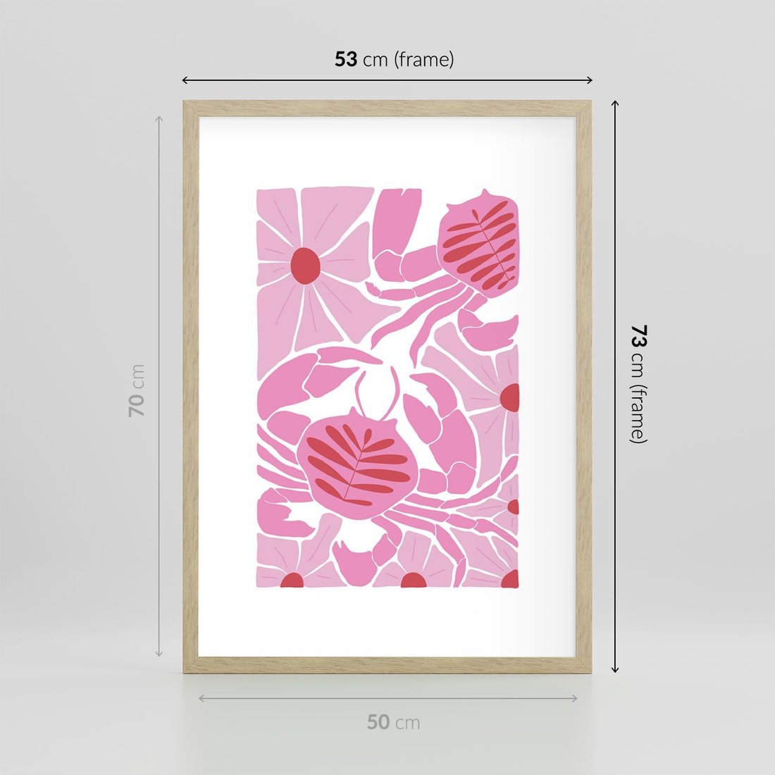 Plakat w ramie 50x70 - Roztańczone Kraby - różowe kwiaty i kraby, abstrakcyjna kompozycja - rama drewno