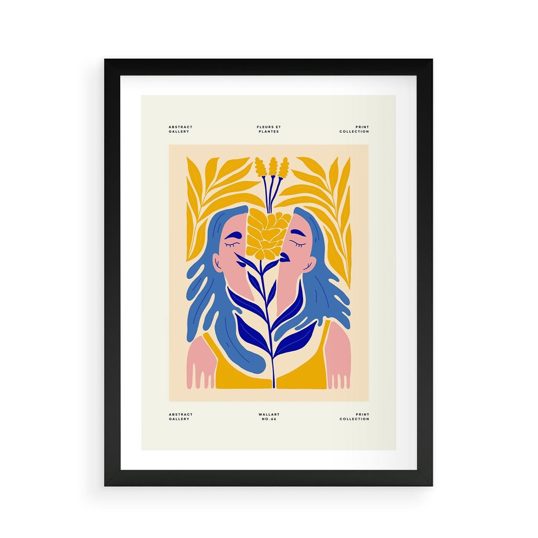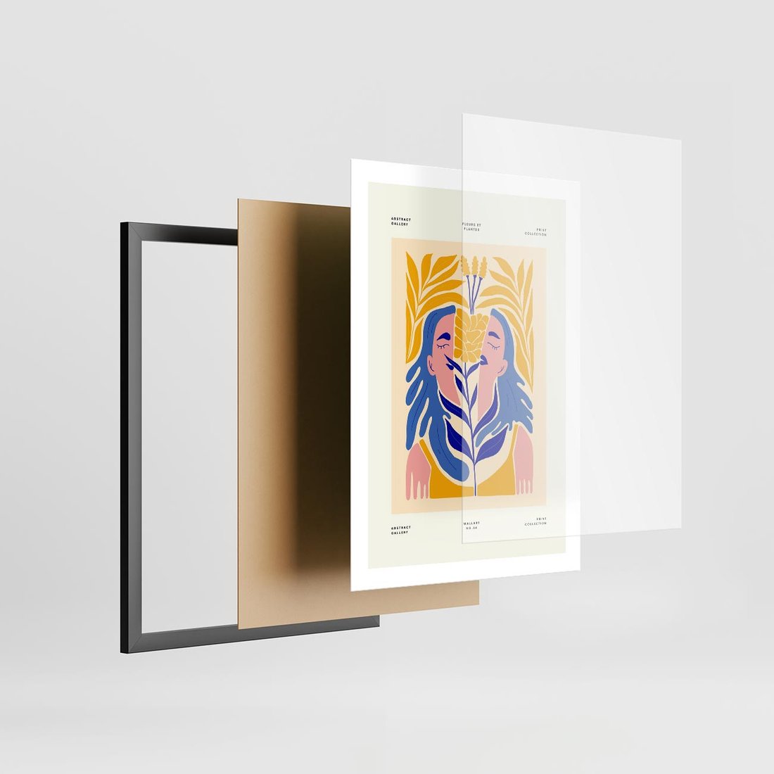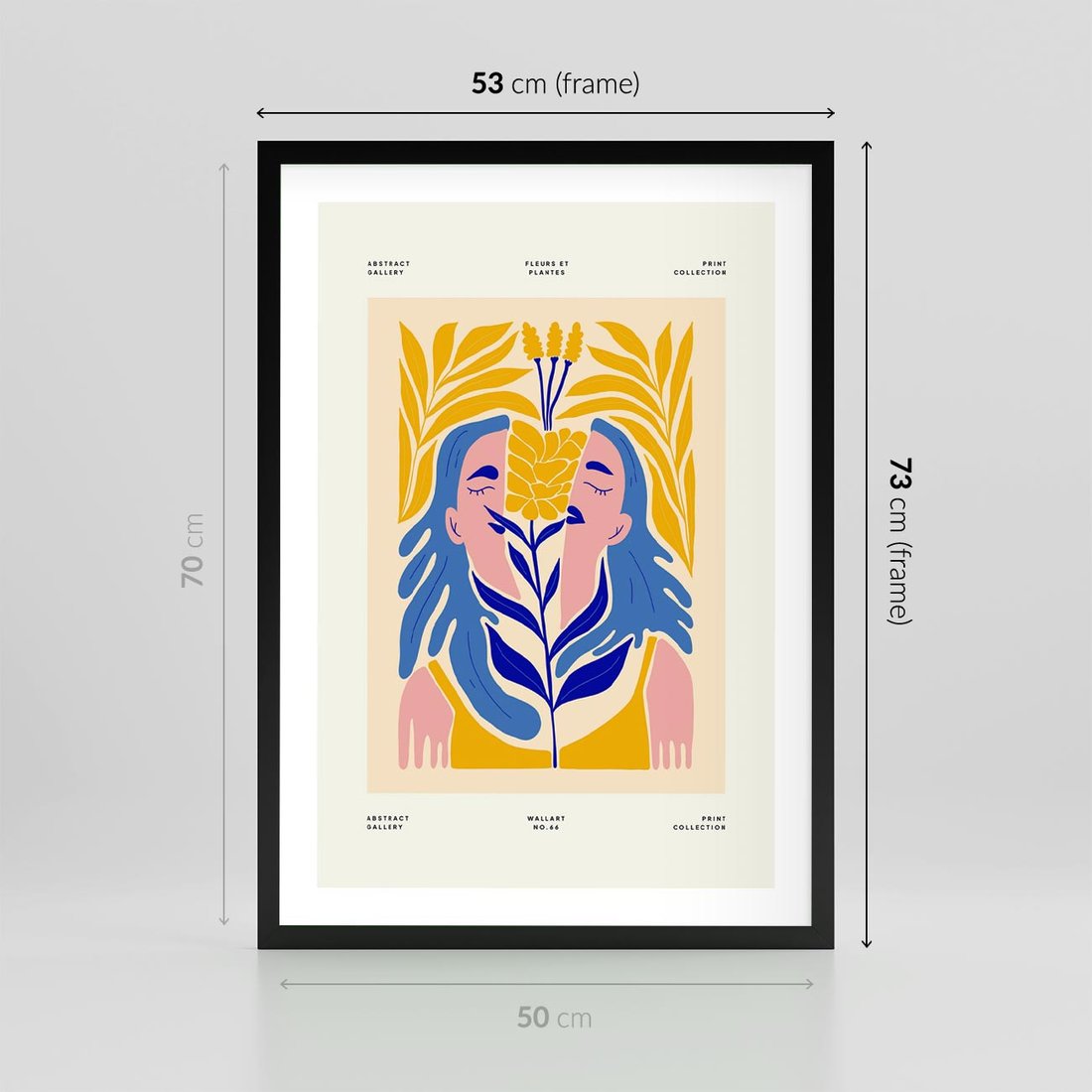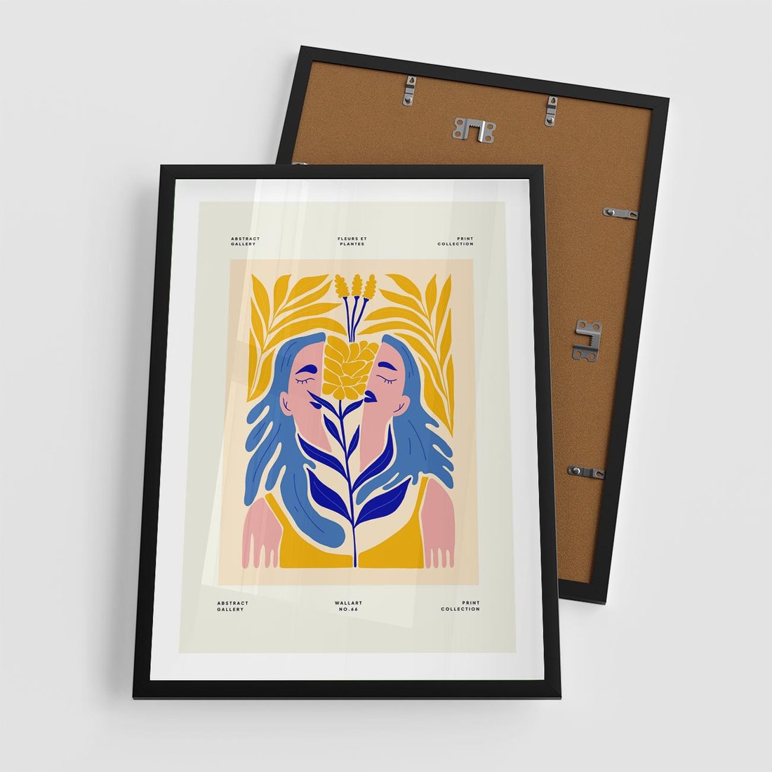 Ta nowoczesna sztuka łączy abstrakcyjne kwiaty z delikatnymi pastelowymi odcieniami, tworząc harmonijną kompozycję wokół postaci kobiecej. Inspirująca i pełna piękna refleksja nad naturą i kobiecością.