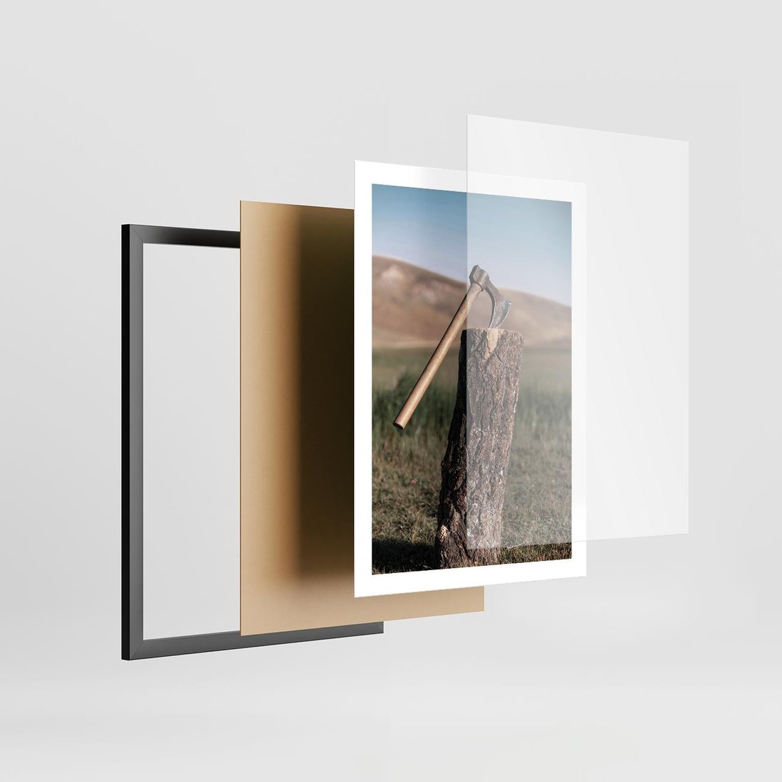 Plakat w ramie 50x70 - Rustykalna Praktyczność: Fotografia Siekiery - rustykalna fotografia, siekiera wbita w pieniek - rama czarna