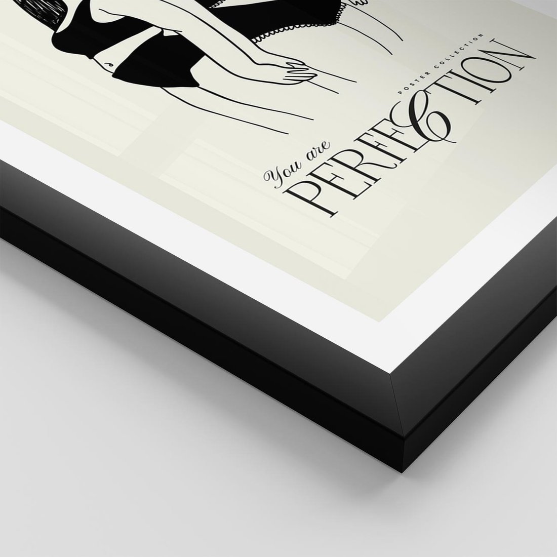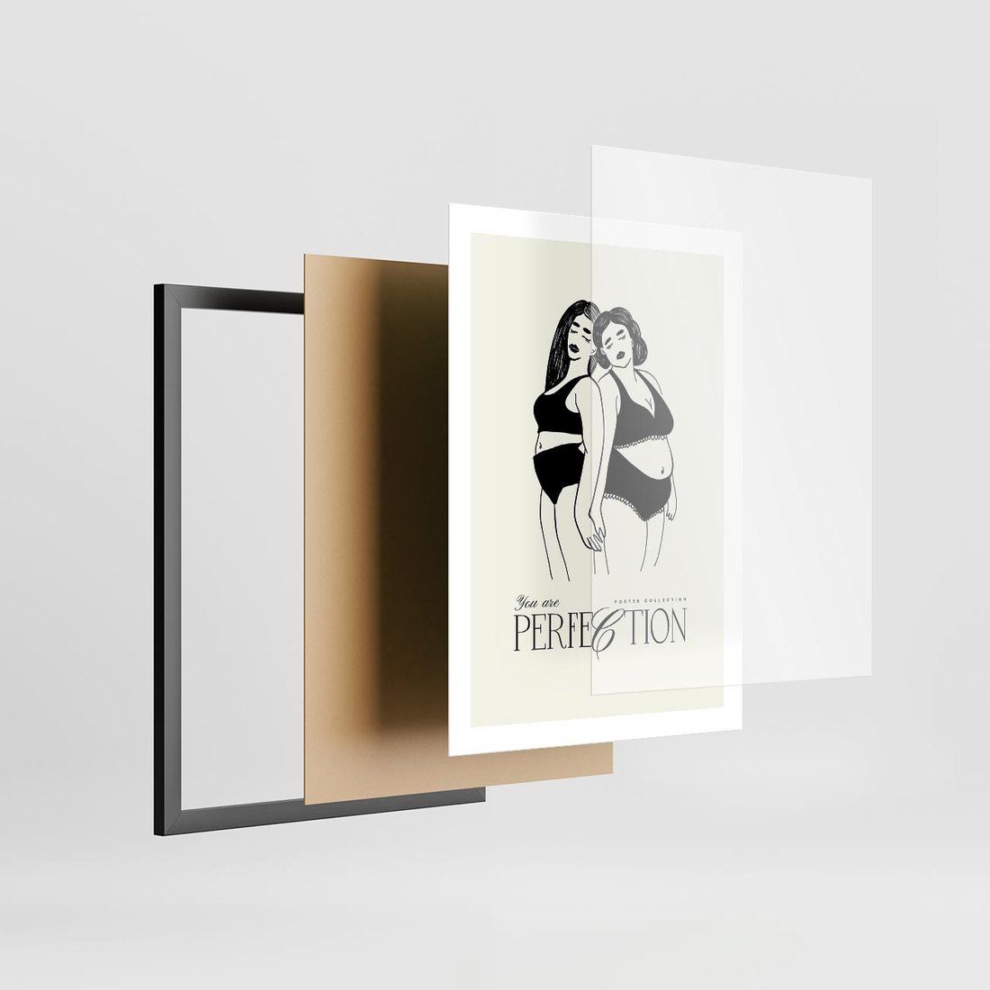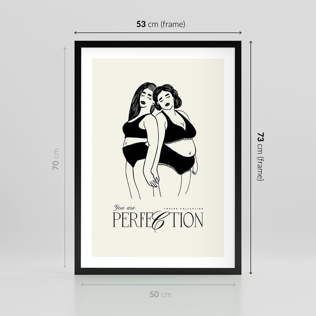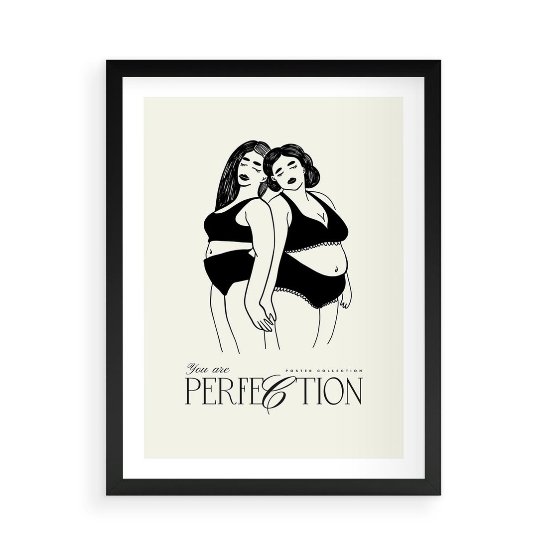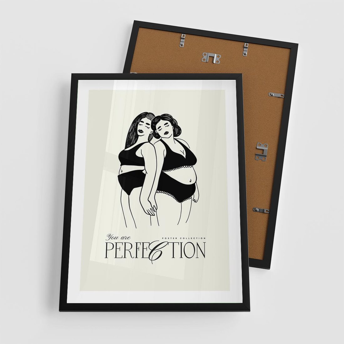 Ten nowoczesny plakat przedstawia dwie kobiety w bieliźnie, promując wartość samoakceptacji. Ich połączenie symbolizuje wspólnotę i siłę kobiecej natury, podkreślanej inspirującą typografią.