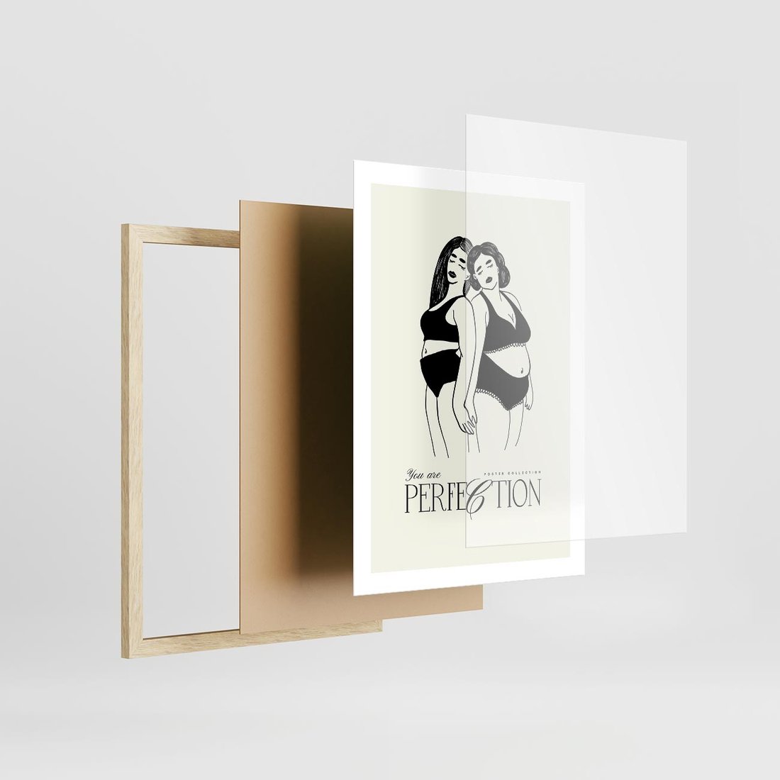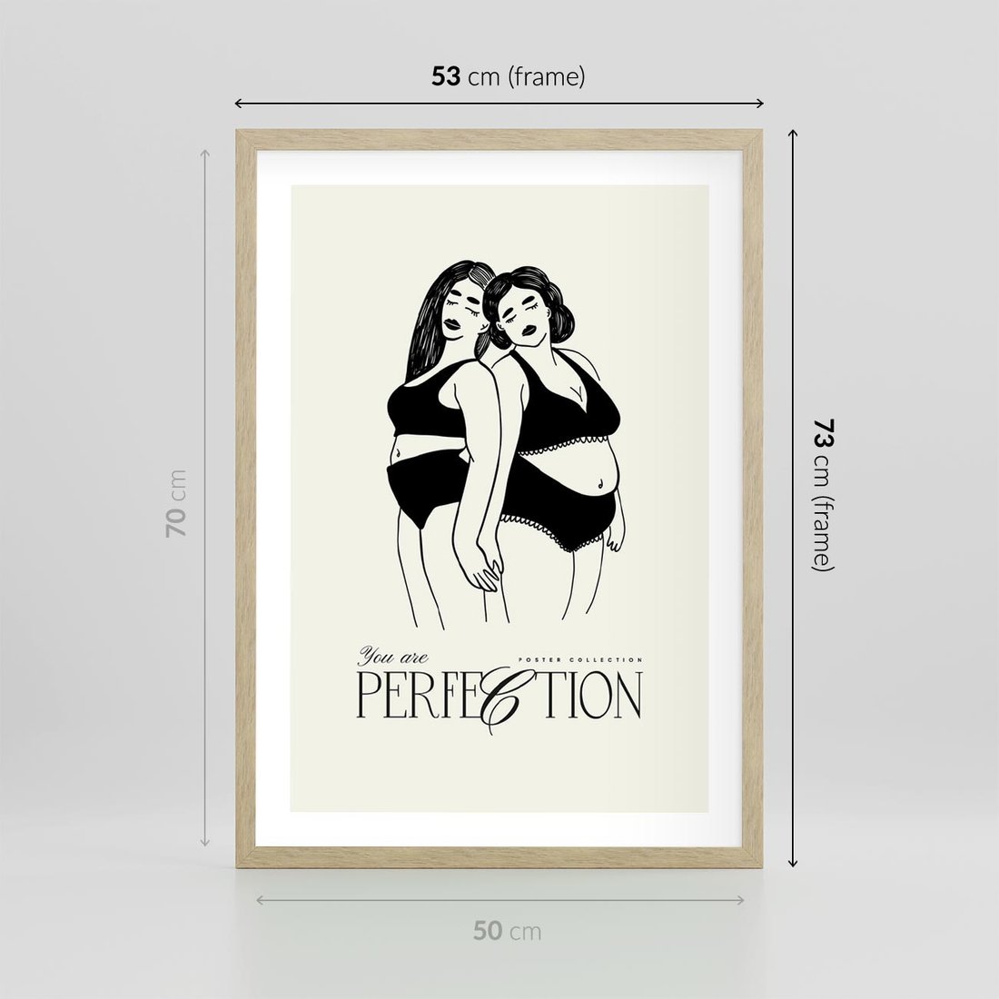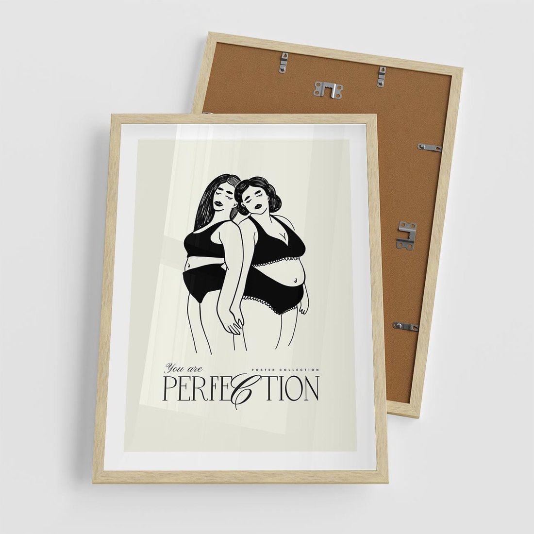 Ten nowoczesny plakat przedstawia dwie kobiety w bieliźnie, promując wartość samoakceptacji. Ich połączenie symbolizuje wspólnotę i siłę kobiecej natury, podkreślanej inspirującą typografią.
