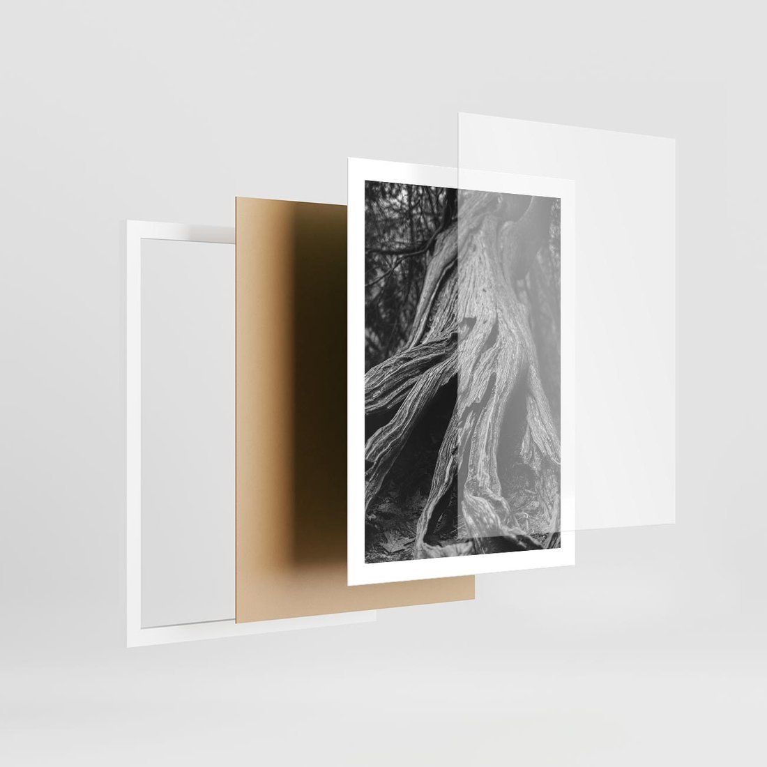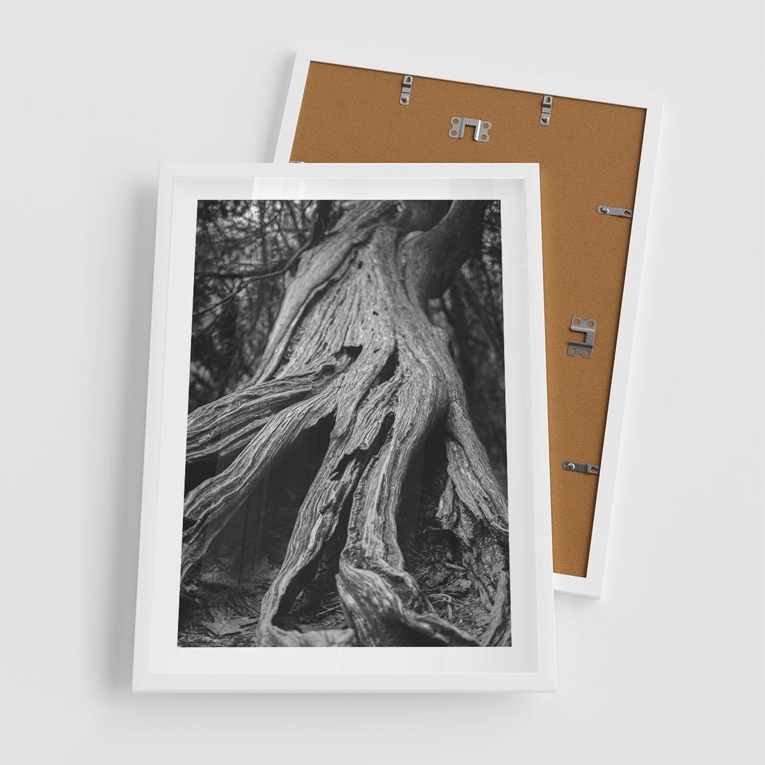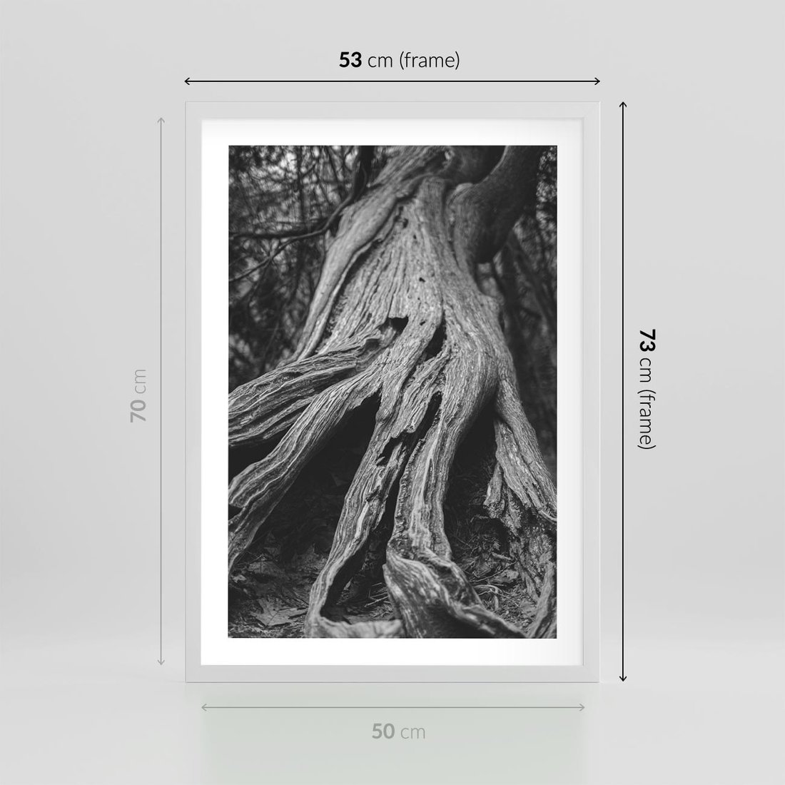 Plakat w ramie 50x70 - Siła Natury - czarno biała fotografia, korzenie wielkiego drzewa - rama biała