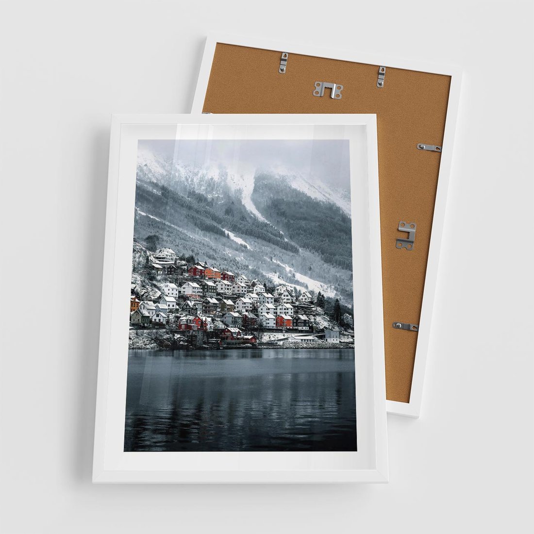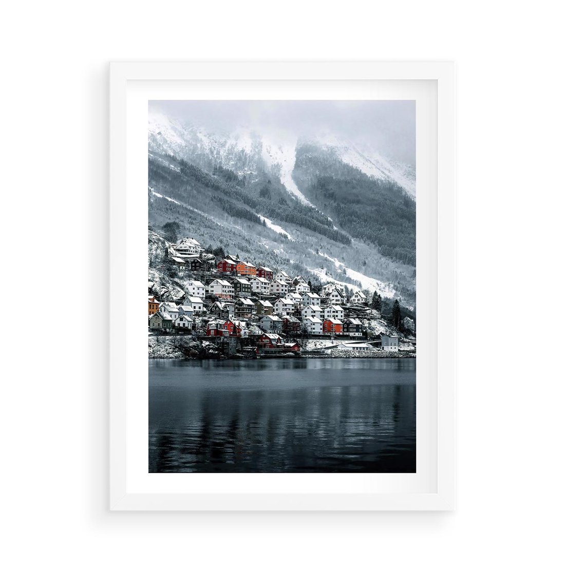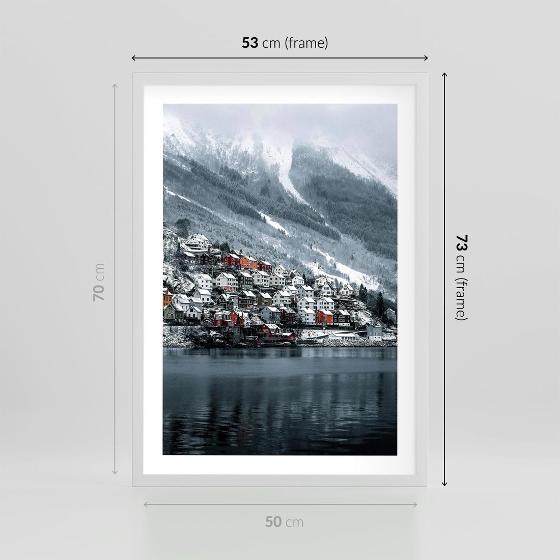 Plakat w ramie 50x70 - Skandynawia na Wzgórzach - domki na wzgórzu, skandynawia - rama biała