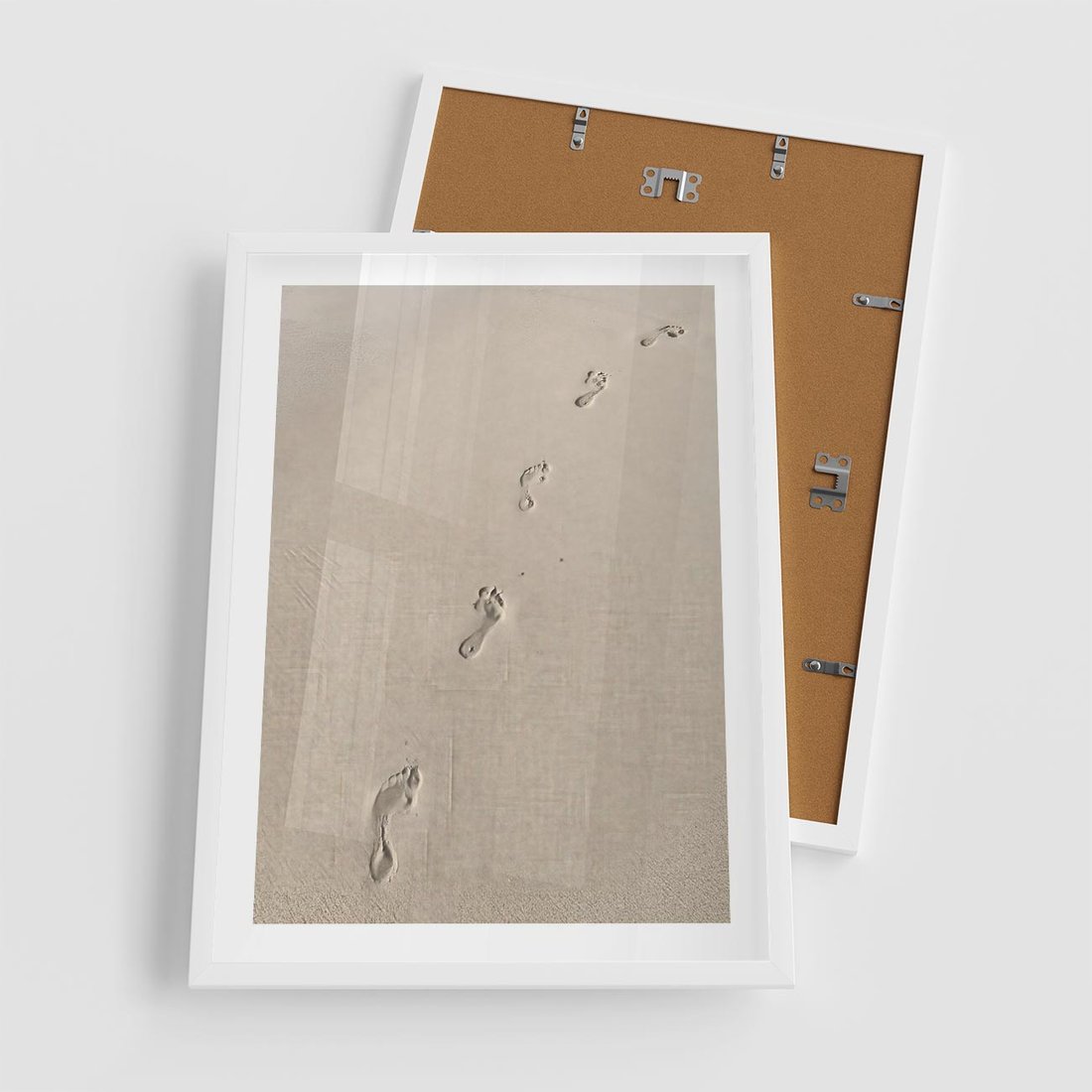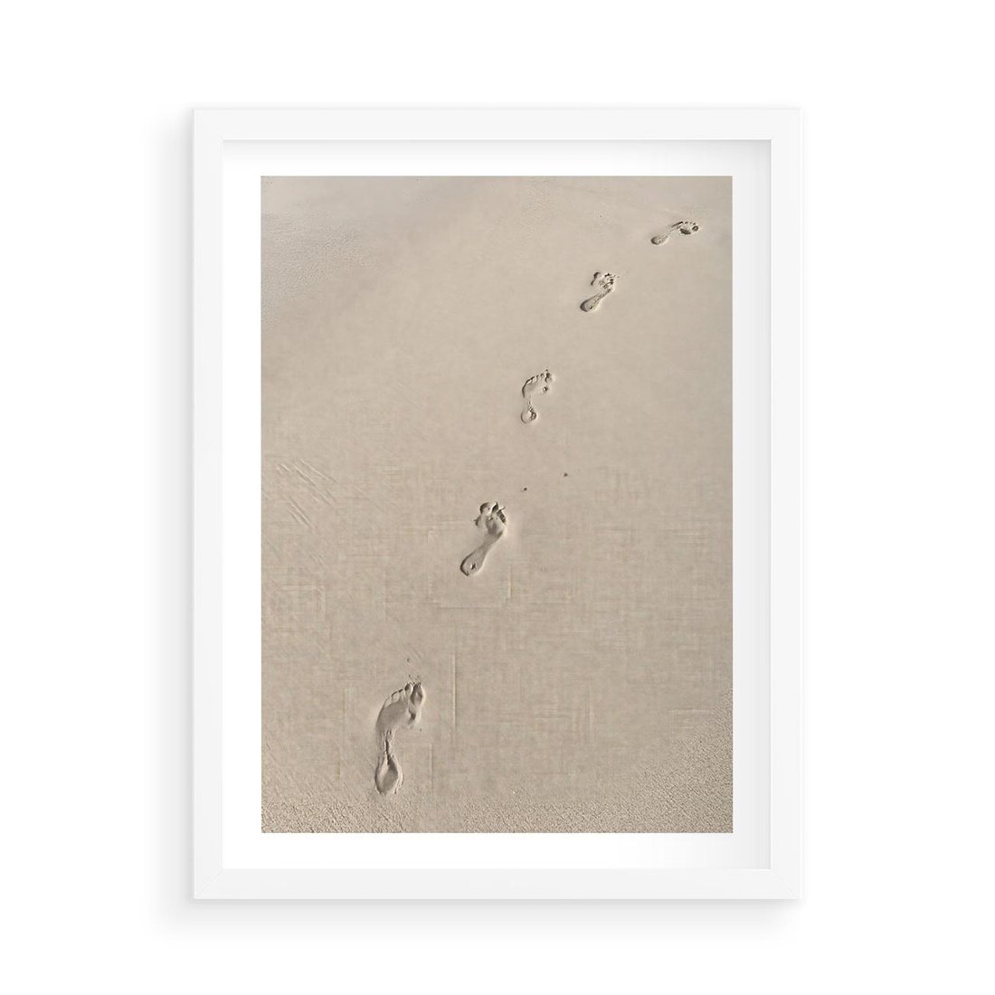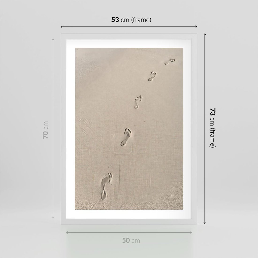 Plakat w ramie 50x70 - Ślady na Złocistym Piasku - piasek, ślady stóp na piasku - rama biała