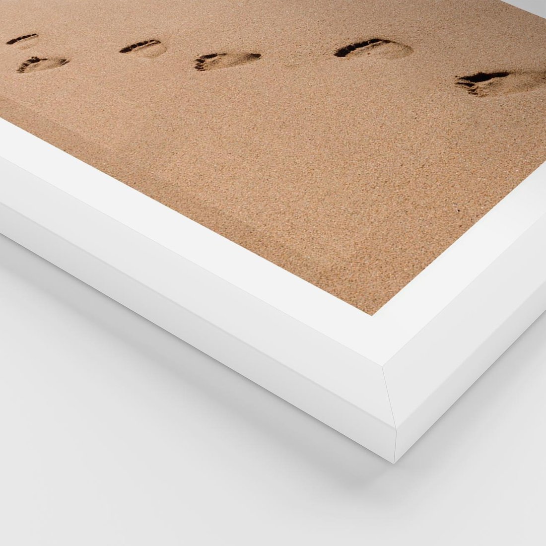 Plakat w ramie 50x70 - Ślady Stóp na Plaży: Spacer nad Morzem - plaża, ślady stóp na piasku - rama biała