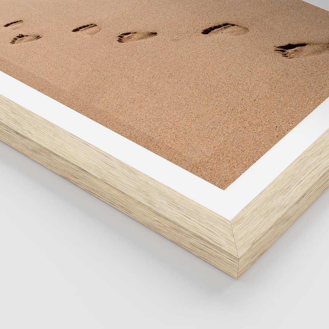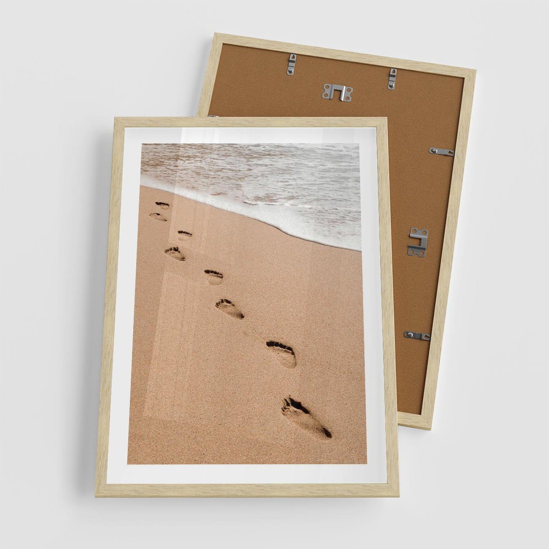 Plakat w ramie 50x70 - Ślady Stóp na Plaży: Spacer nad Morzem - plaża, ślady stóp na piasku - rama drewno