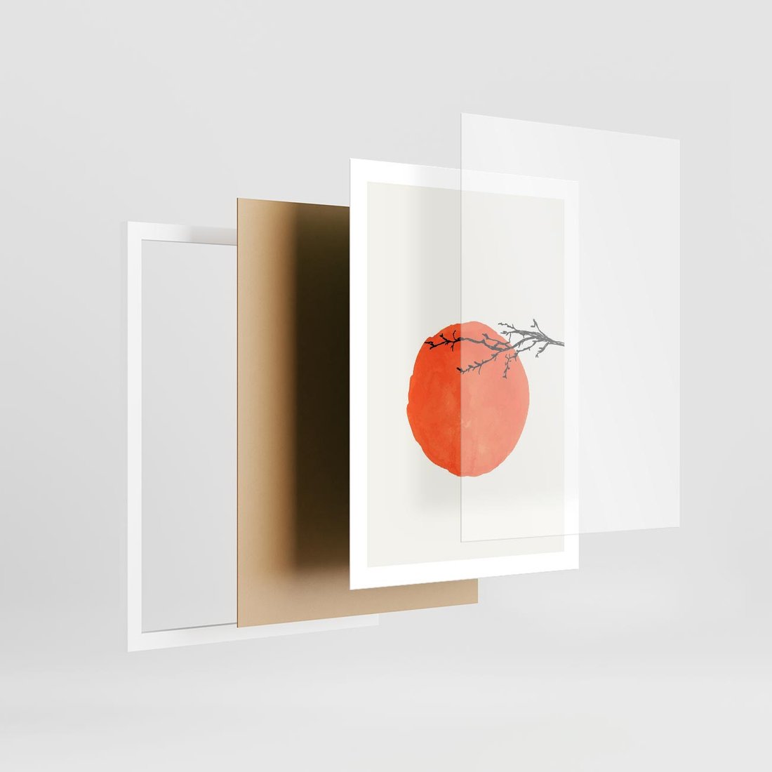 Nowoczesna grafika przedstawia pomarańczowe słońce i delikatną gałązkę w stylu minimalistycznym, co tworzy spokojny i harmonijny motyw.