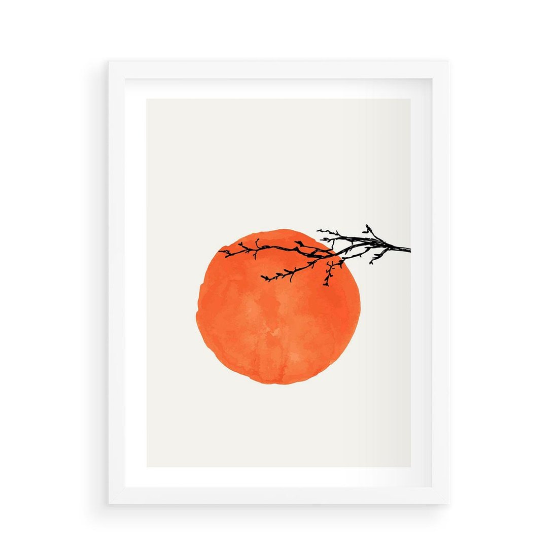 Plakat w ramie 50x70 - Słońce i Gałązka - pomarańczowe słońce, gałązka - rama biała