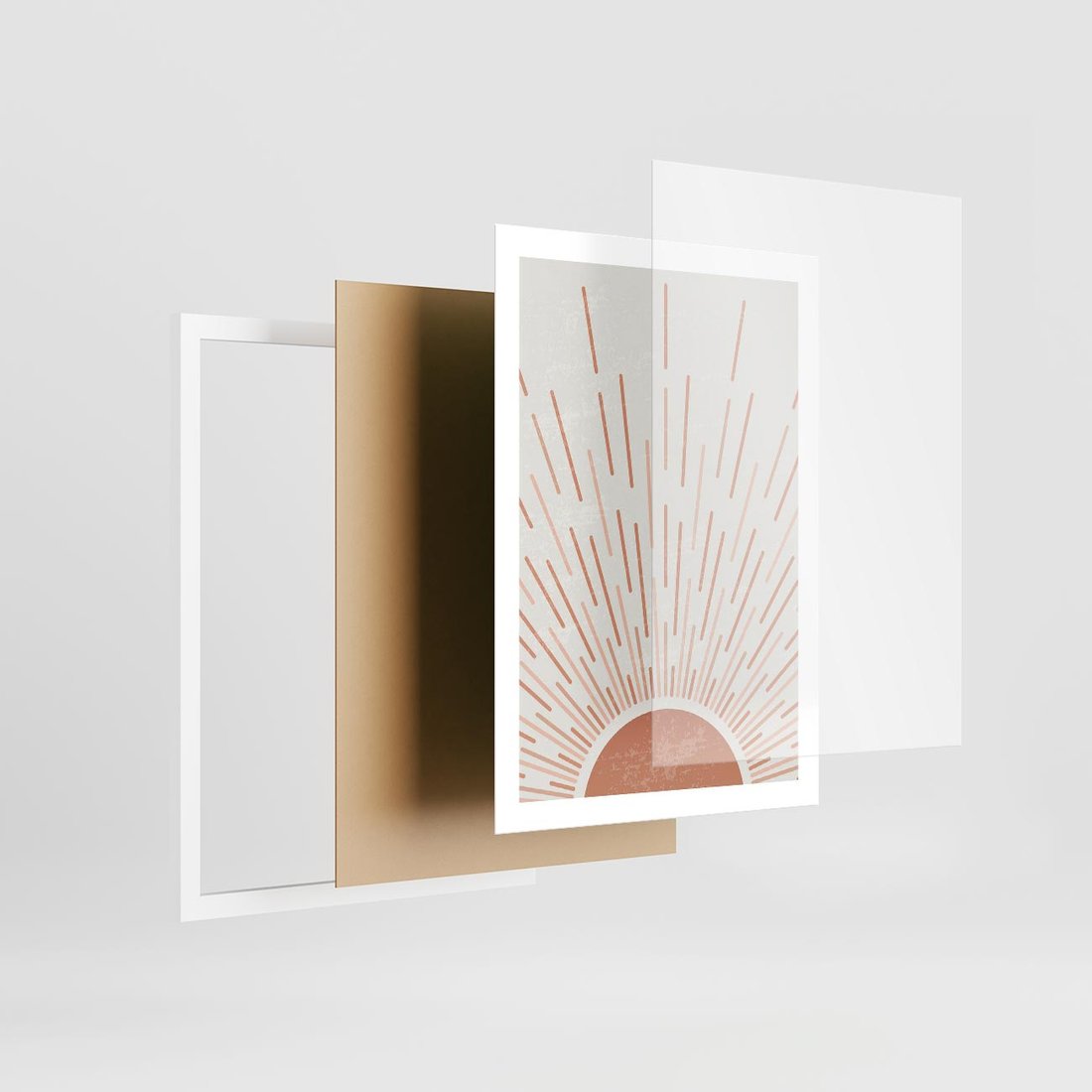 Obraz przedstawia grafikę w stylu boho z motywem słońca. Ta kompozycja artystyczna doskonale pasuje do wnętrz utrzymanych w stylu boho, nadając im ciepła i egzotycznego uroku.