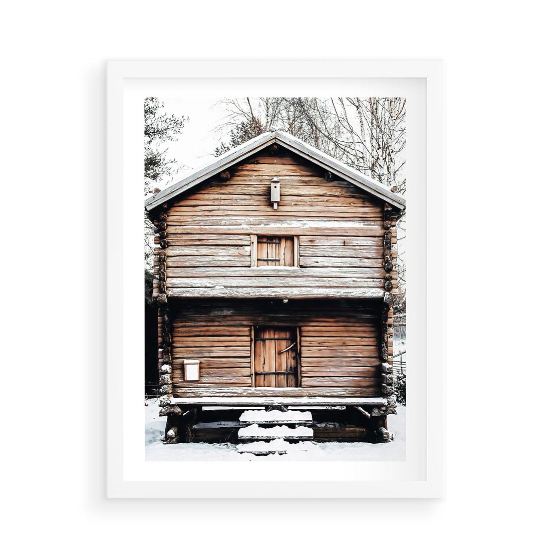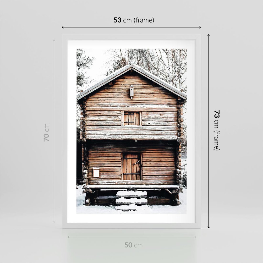 Plakat w ramie 50x70 - Śnieżny Ustronny Raj - domek w górach, śnieg - rama biała