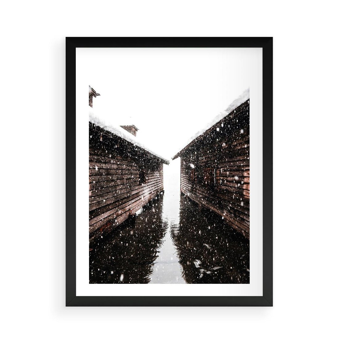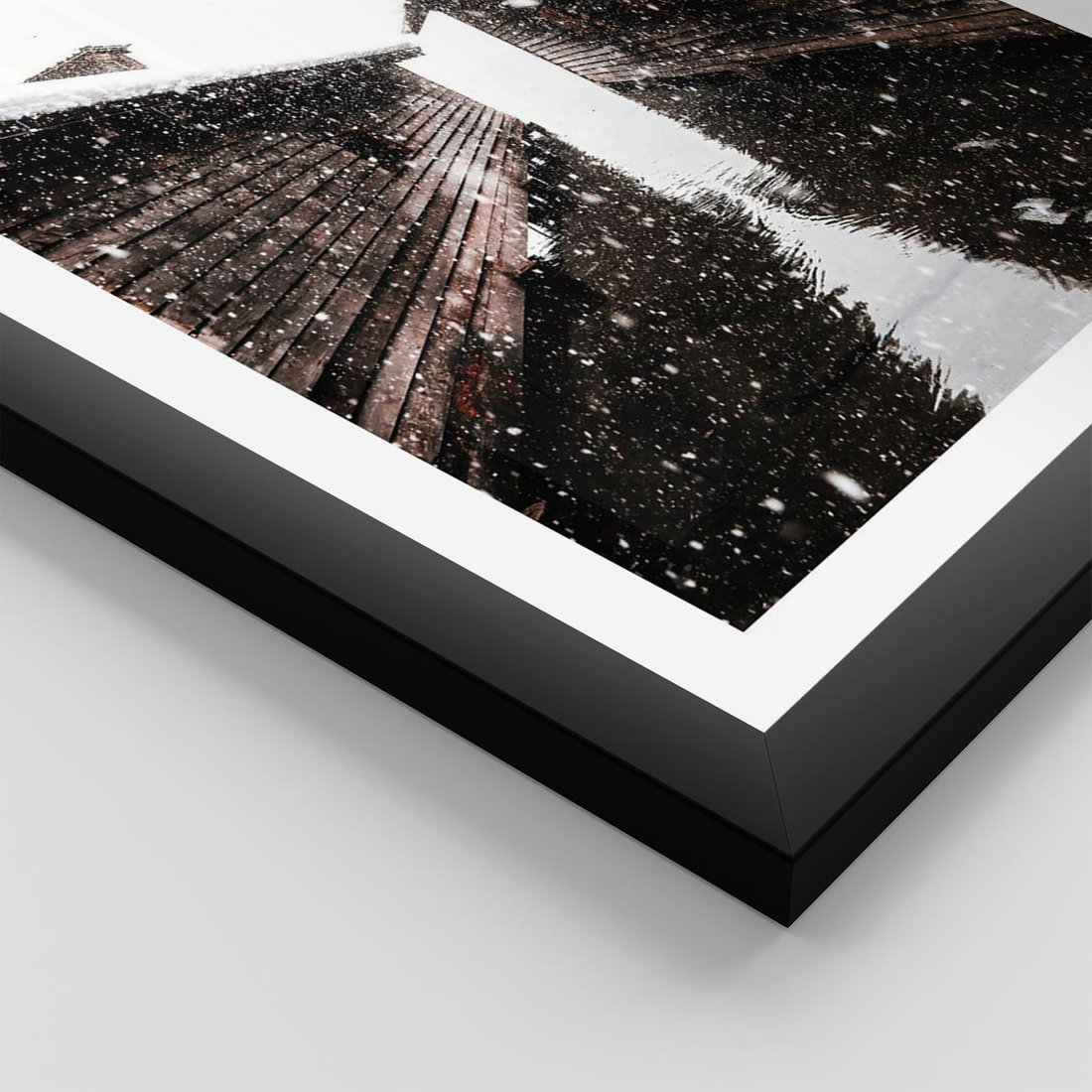 Plakat w ramie 50x70 - Spadający Śnieg - domek górski, w zimie - rama czarna