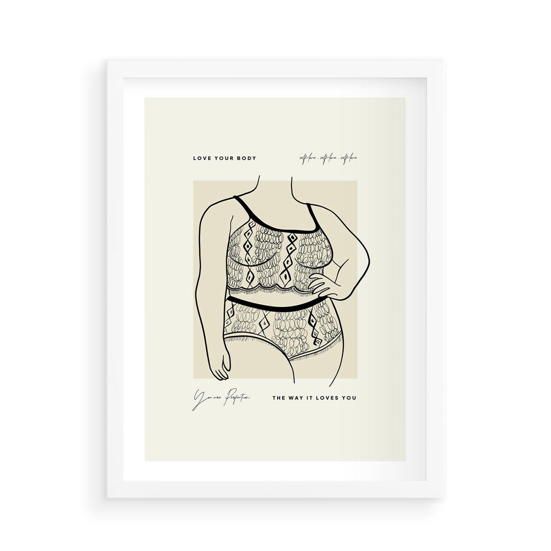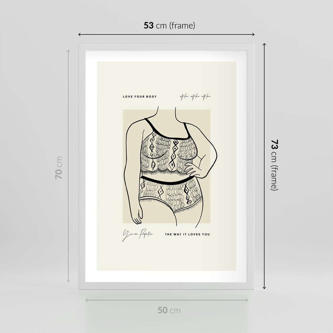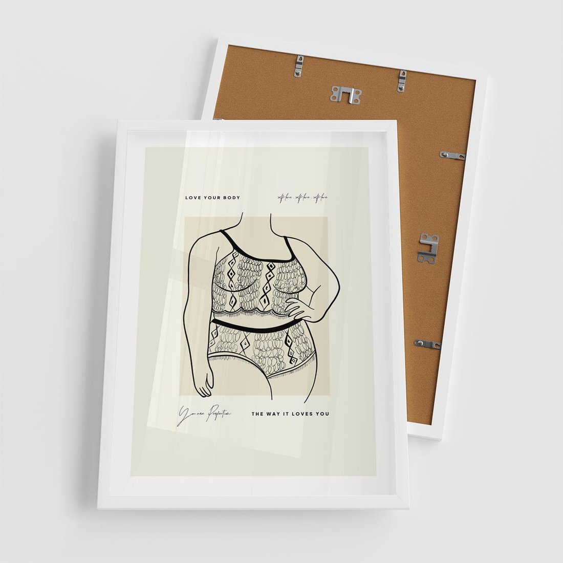 Ten plakat to hołd dla kobiecej siły i piękna. Delikatny rysunek kobiety w bieliźnie, wzbogacony subtelnie dobraną typografią, tworzy wyjątkową kompozycję, oddającą piękno i pewność siebie.