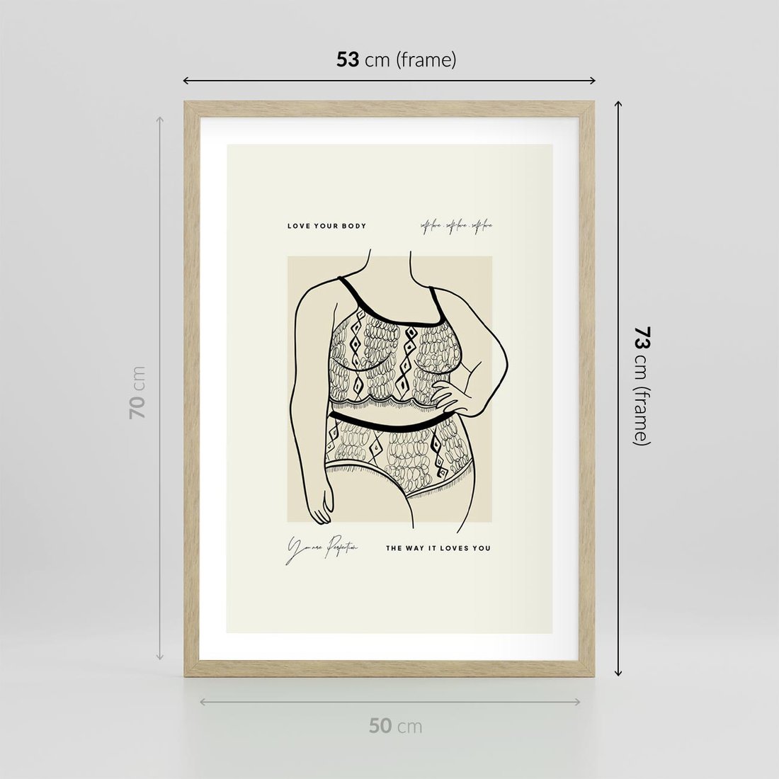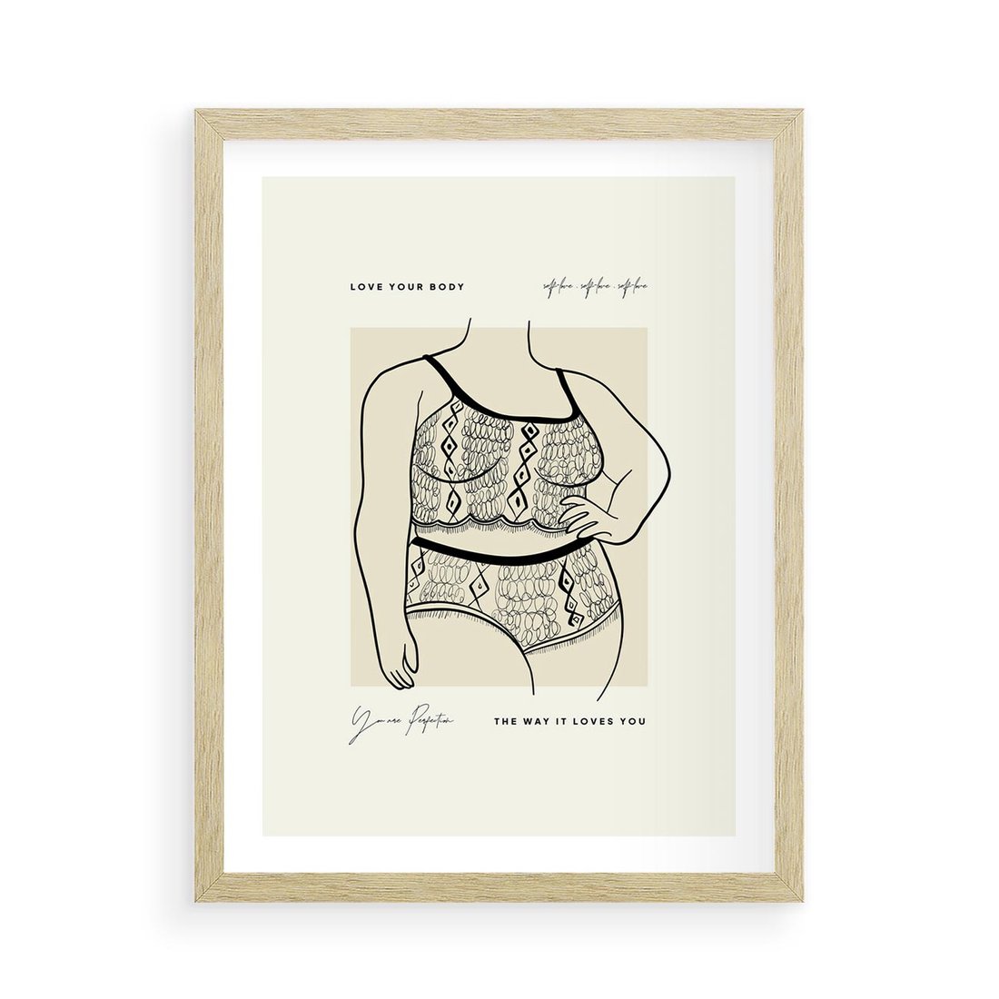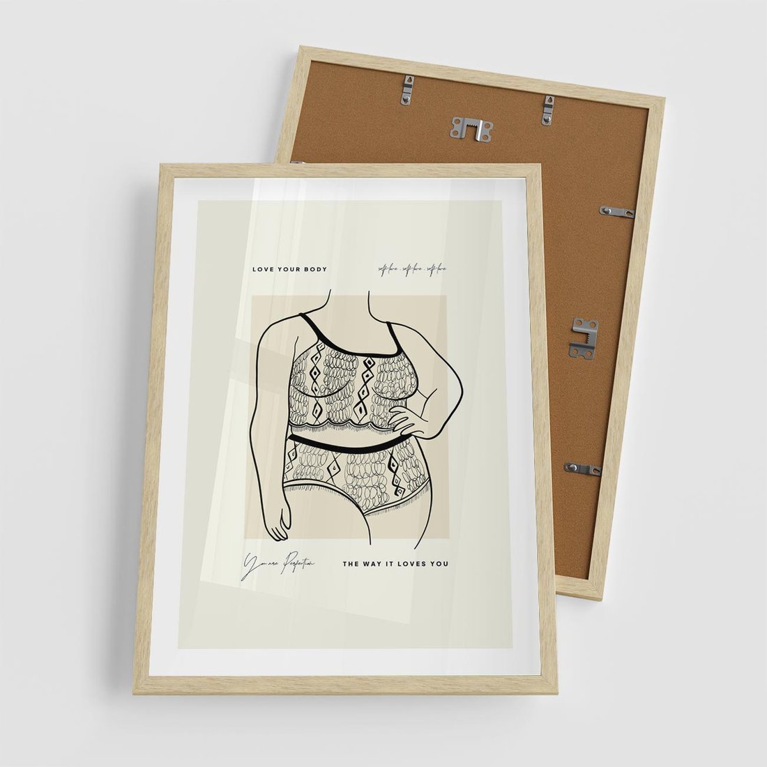 Ten plakat to hołd dla kobiecej siły i piękna. Delikatny rysunek kobiety w bieliźnie, wzbogacony subtelnie dobraną typografią, tworzy wyjątkową kompozycję, oddającą piękno i pewność siebie.