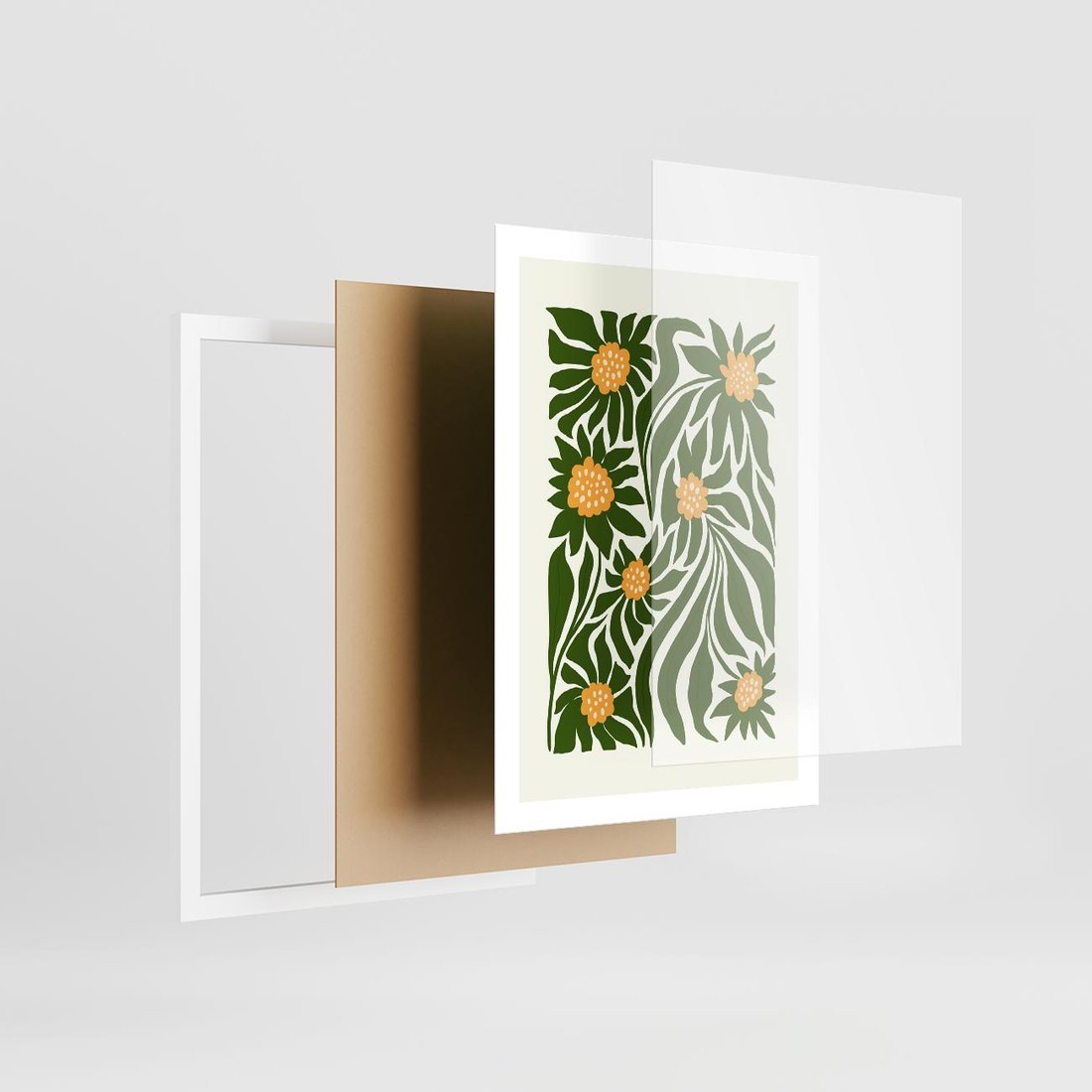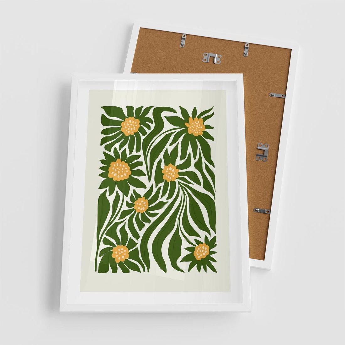 Ta abstrakcyjna kompozycja ukazuje kwiaty w wyjątkowo niekonwencjonalny sposób. Zieleń i żółć splatają się w harmonijną całość, tworząc abstrakcyjne pejzaże natury. Bez tytułu obraz zachęca do indywidualnych interpretacji, pozostawiając przestrzeń dla wyobraźni i refleksji.