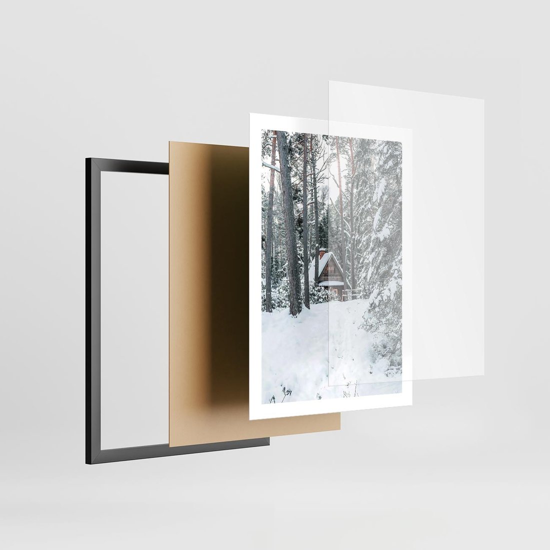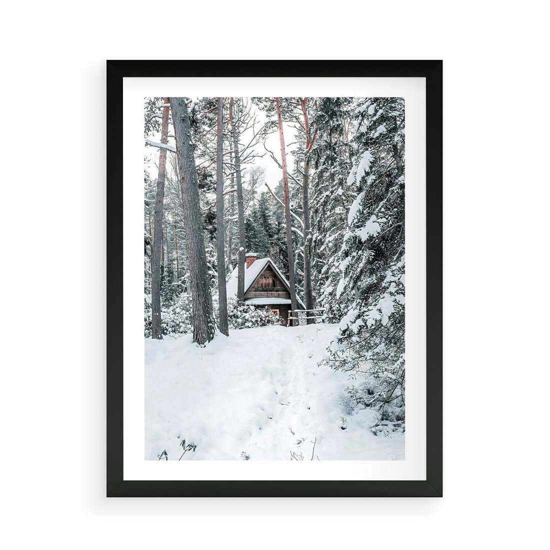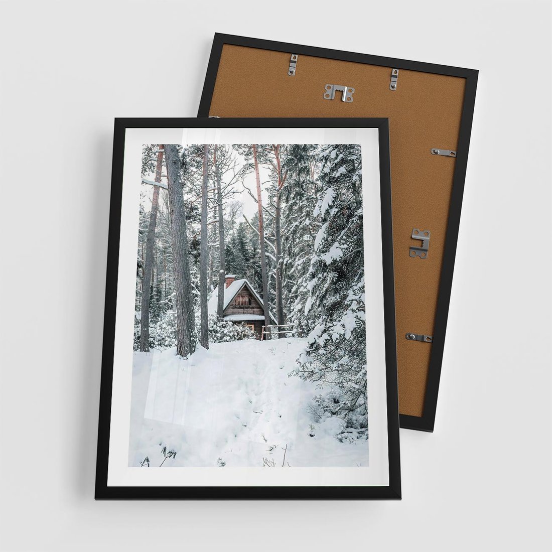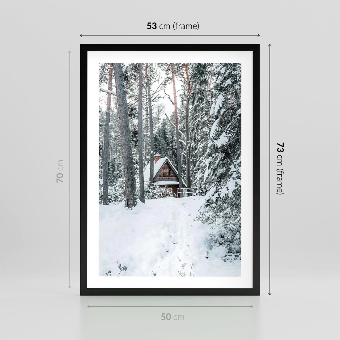 Plakat w ramie 50x70 - Spokój Zimowej Przygody w Lesie - domek w górach w lesie, zima - rama czarna