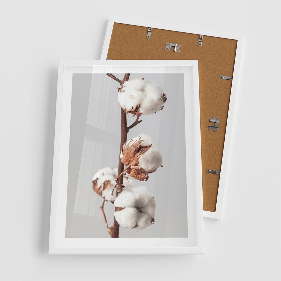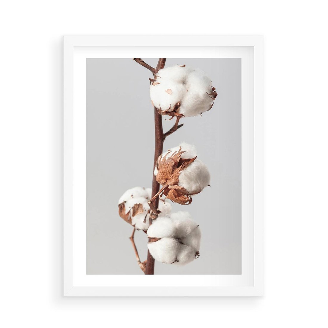 Plakat w ramie 50x70 - Spokojna Gałązka Bawełny - gałązka bawełny, prosta spokojna fotografia - rama biała