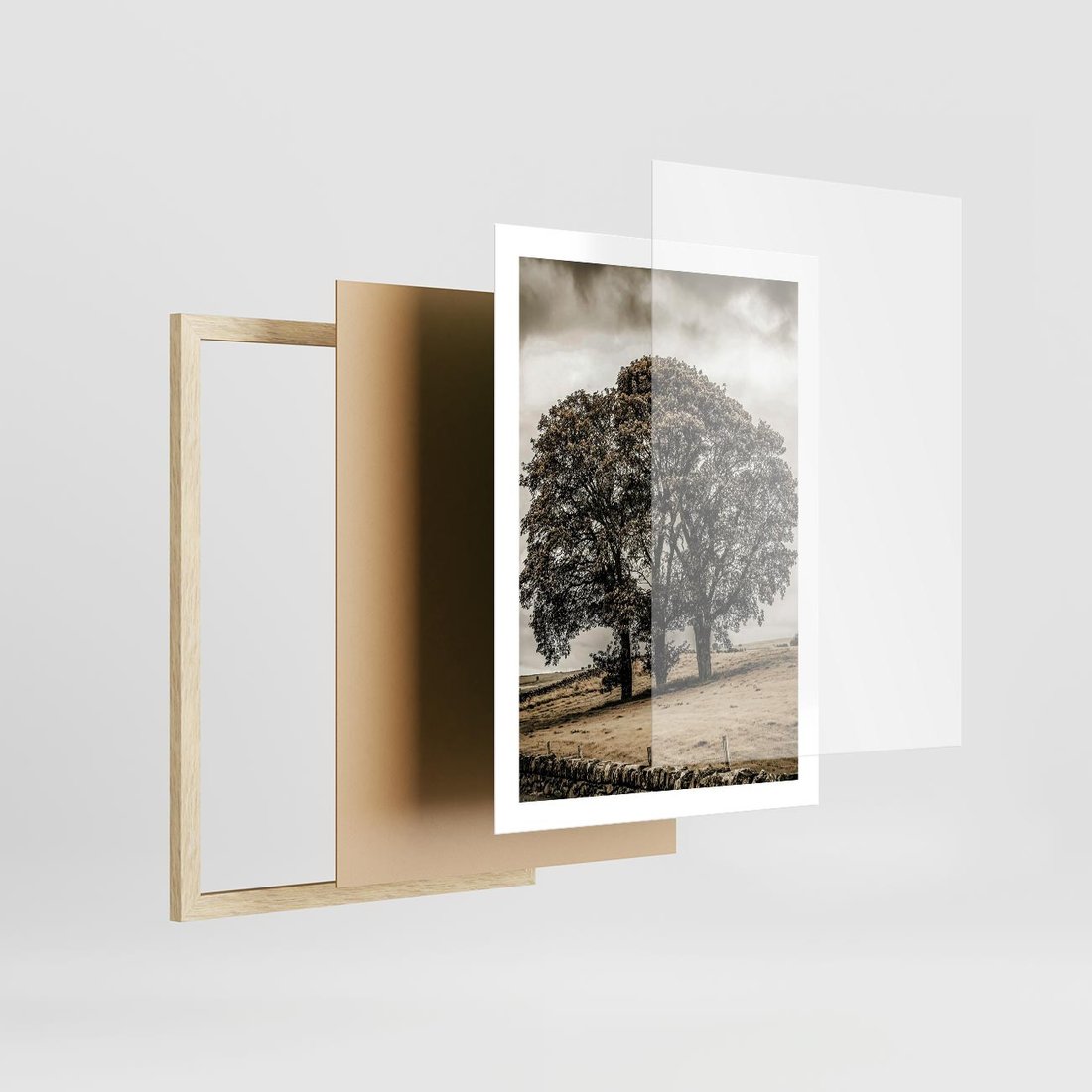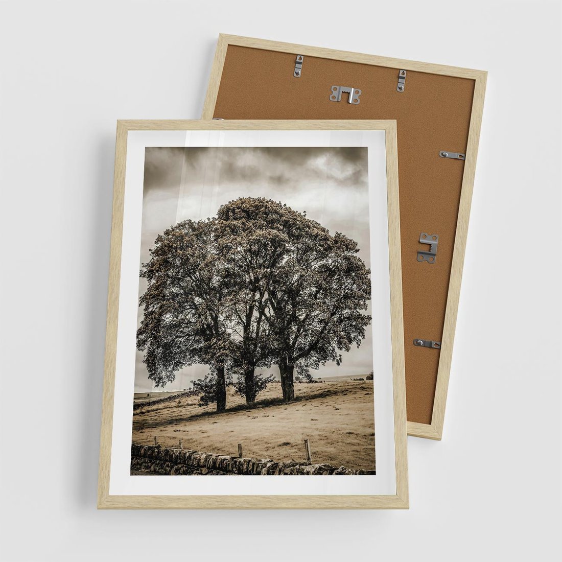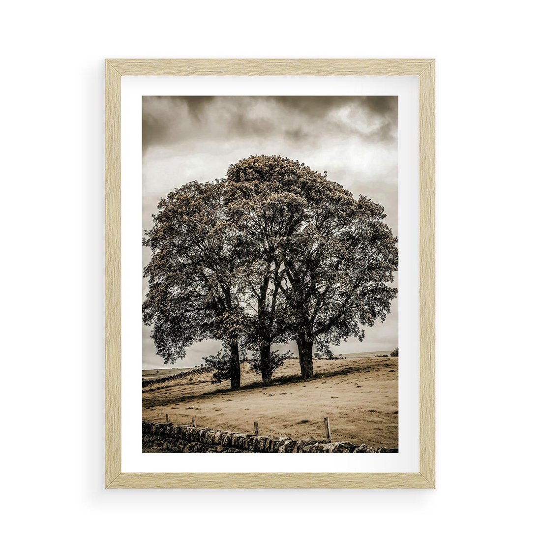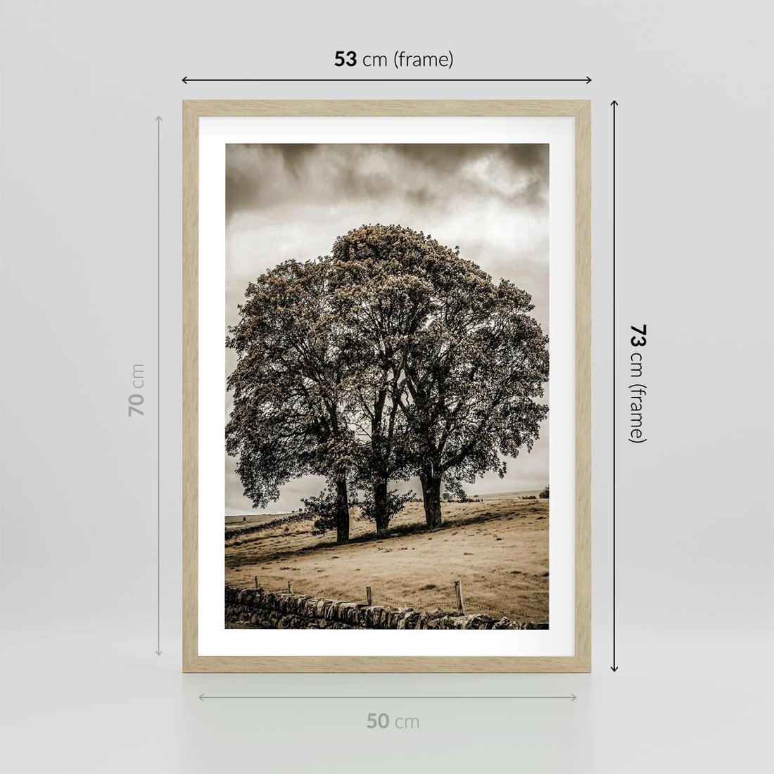 Plakat w ramie 50x70 - Spokojna Osamotniona Chwila - beżowe kolory, samotne drzewo na polu - rama drewno