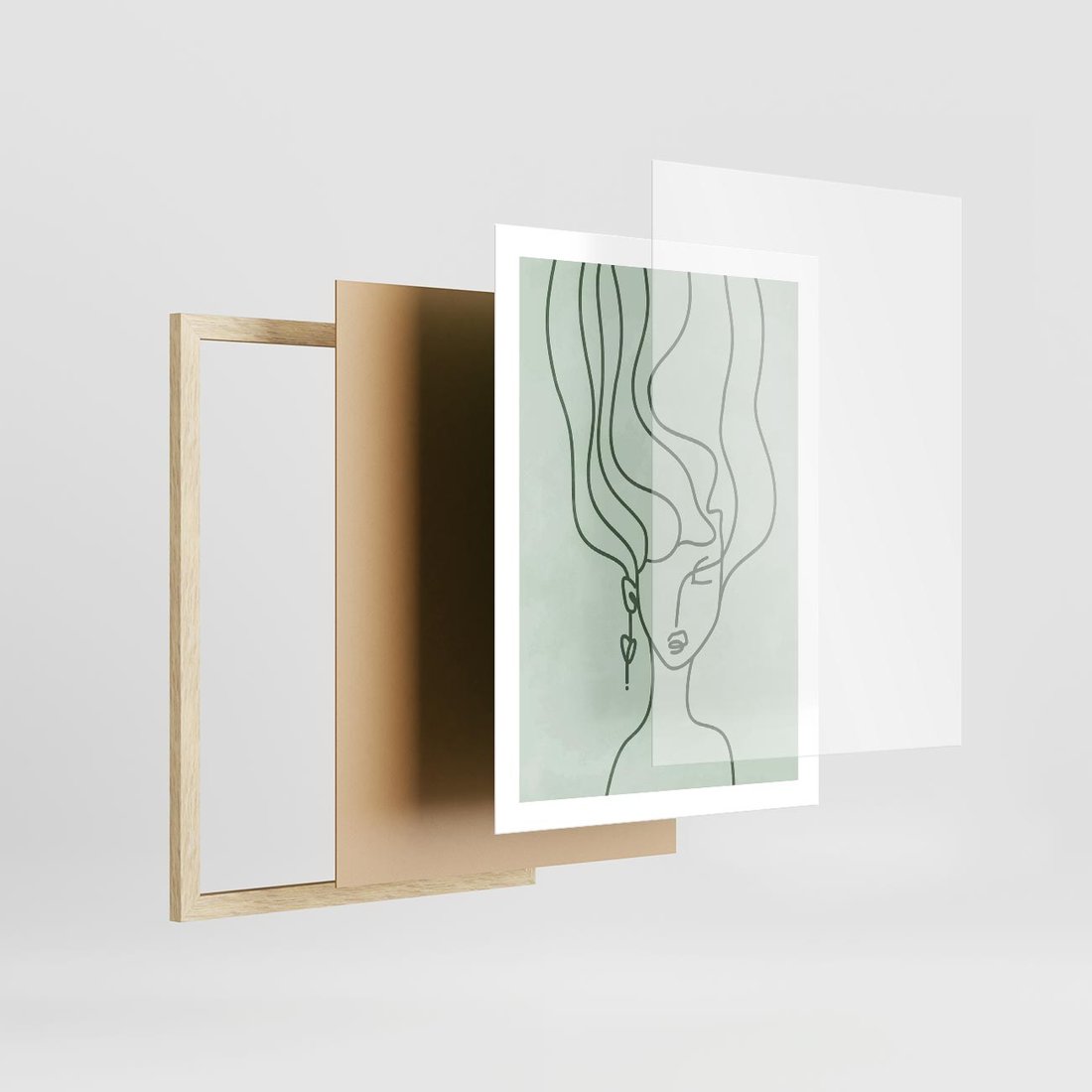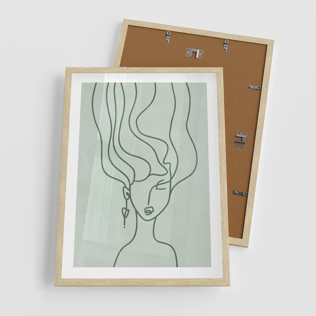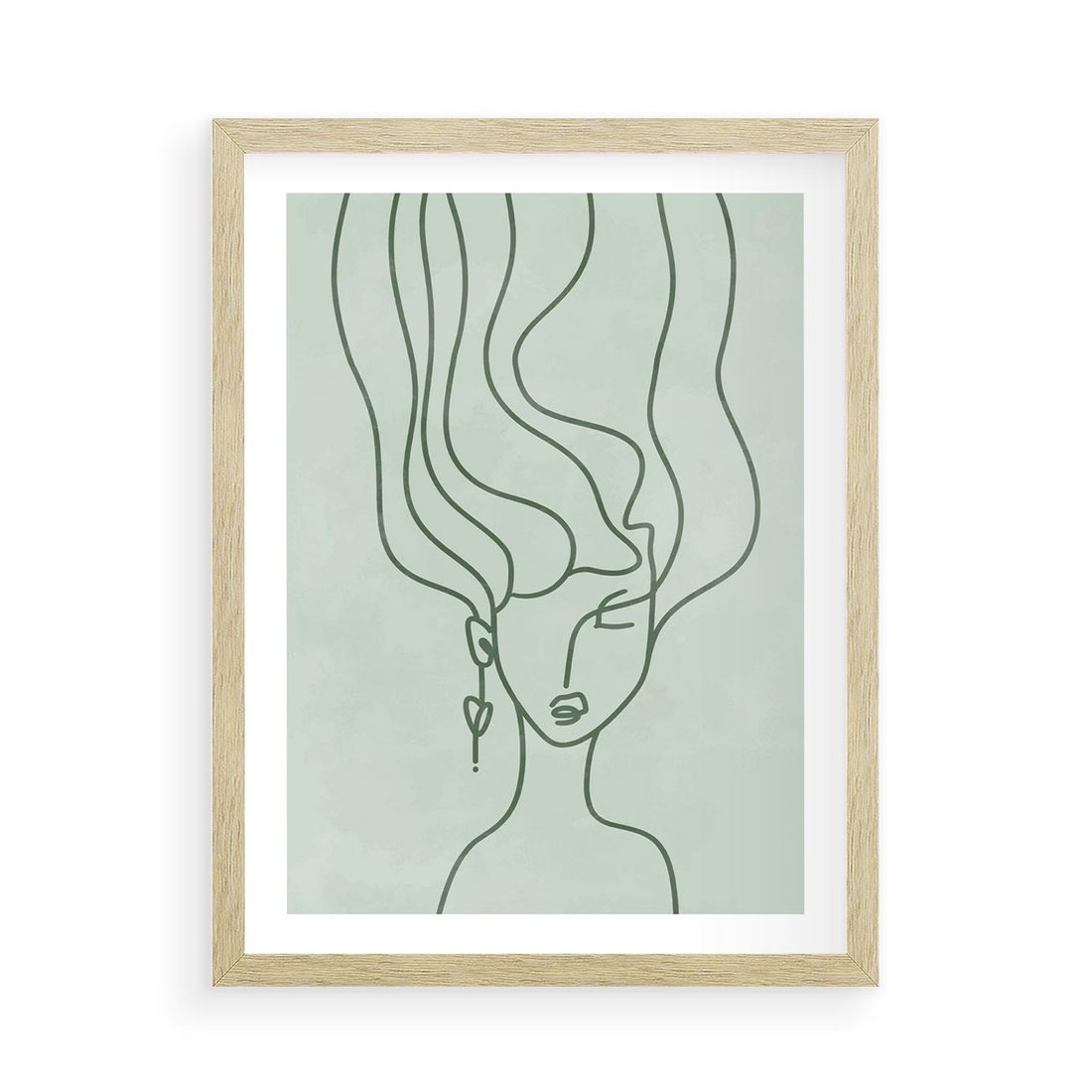 Abstrakcyjny zielony szkic ukazujący kobietę z długimi włosami tworzy wyjątkowy wizualny efekt. Delikatność zielonych linii nadaje kompozycji harmonii, a jednocześnie zachowuje abstrakcyjny charakter, co może ciekawie uzupełnić różne rodzaje wnętrz.