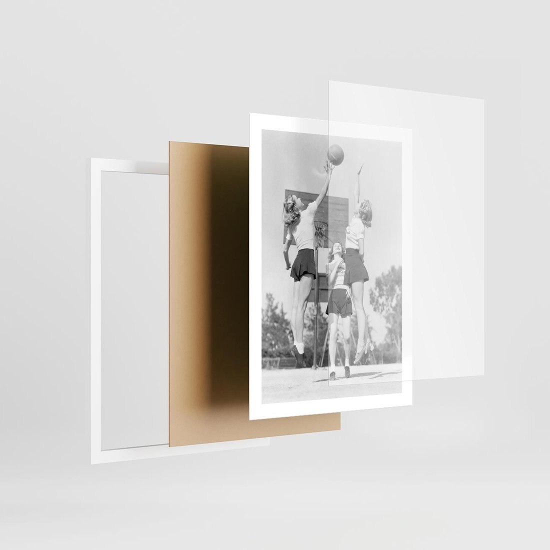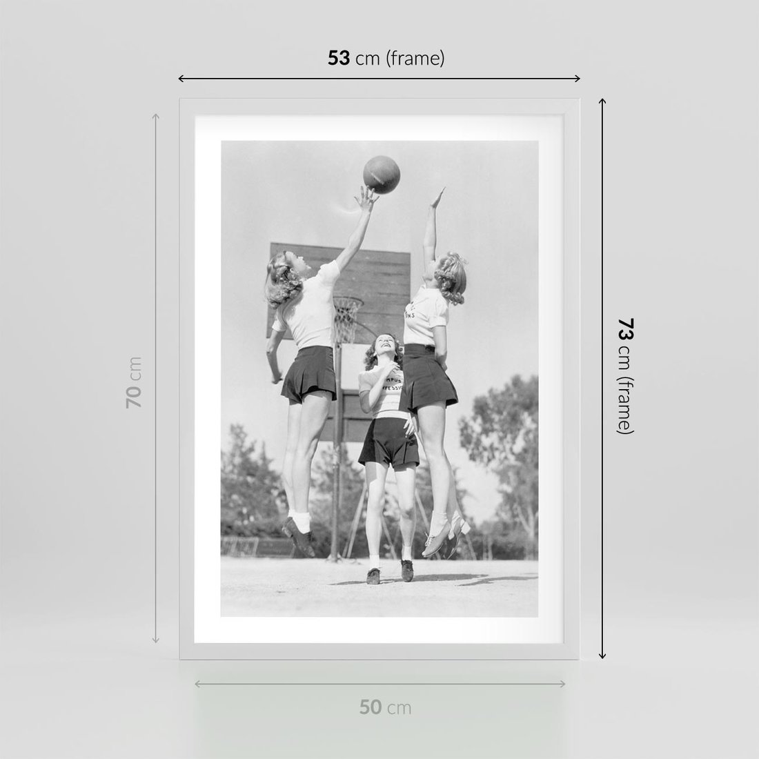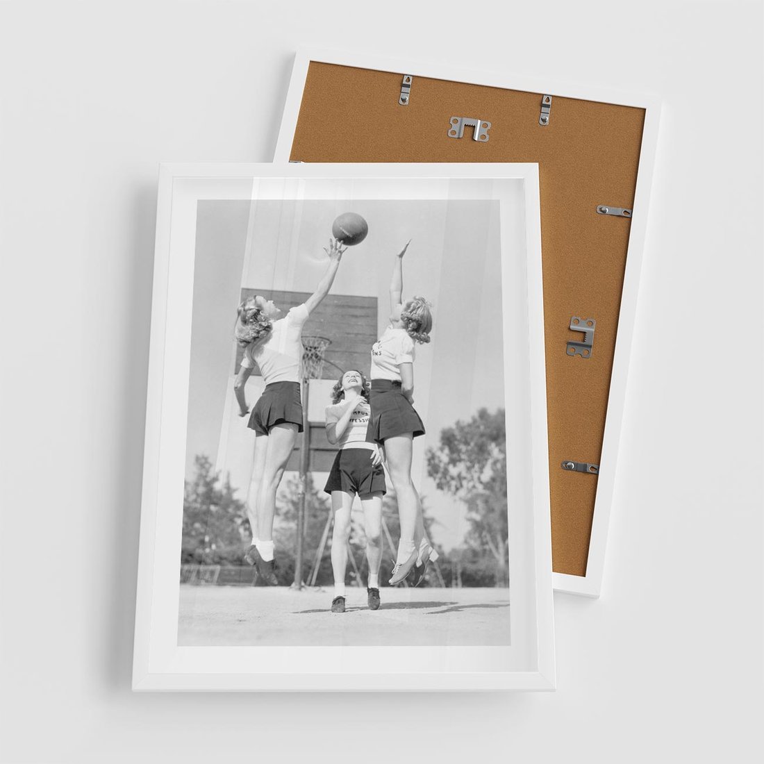 To urokliwe retro zdjęcie w czerni i bieli przenosi nas w czasie do epoki stylu pin-up. Na fotografii widoczne są kobiety ubrane w stroje sportowe, grające w koszykówkę. To połączenie sportowej aktywności z klasycznym stylem pin-up tworzy niezwykły kontrast i unikalną atmosferę. Ten obraz doskonale wprowadzi ducha retro i energię sportu do wnętrza, będąc nie tylko ozdobą, ale również źródłem inspiracji.