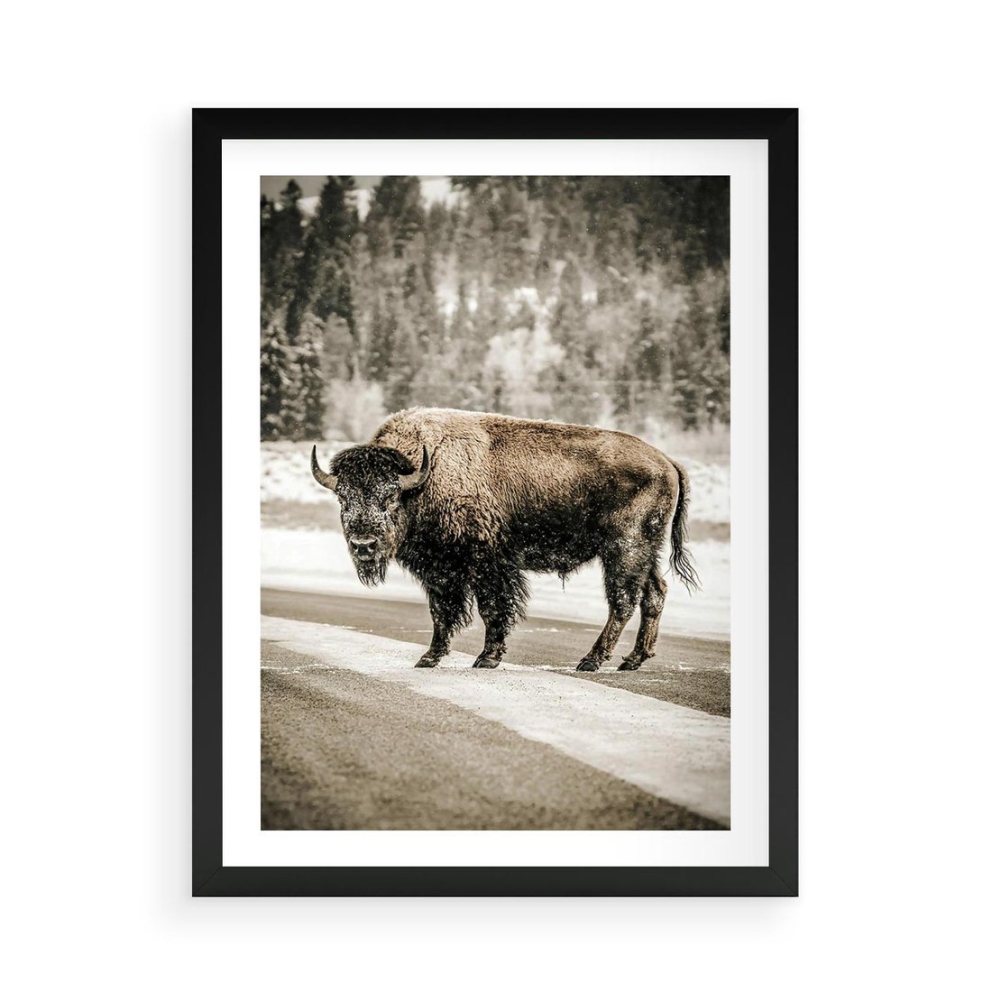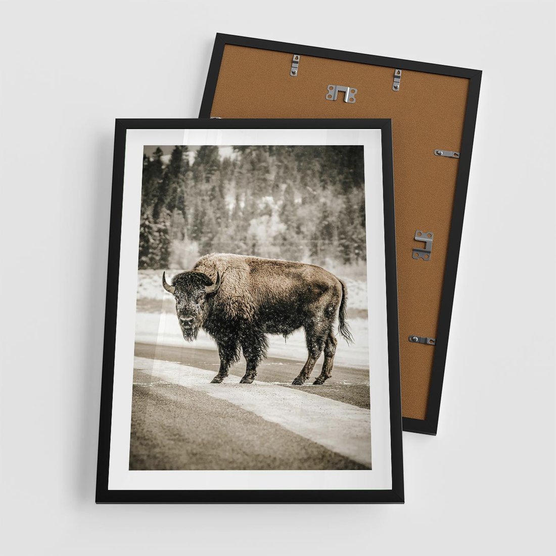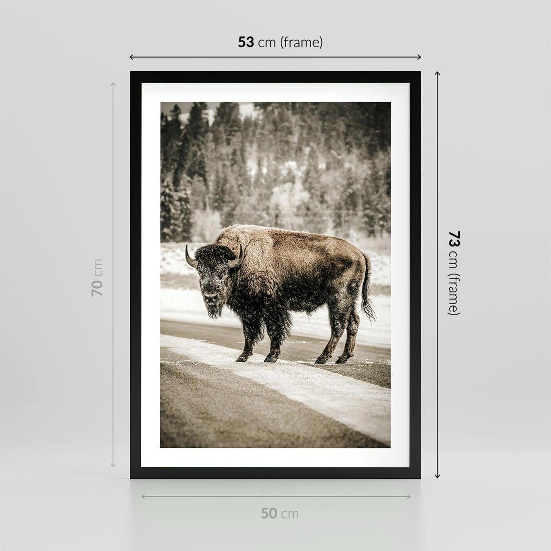 Plakat w ramie 50x70 - Spotkanie z Żubrem na Leśnej Drodze - żubr, las - rama czarna