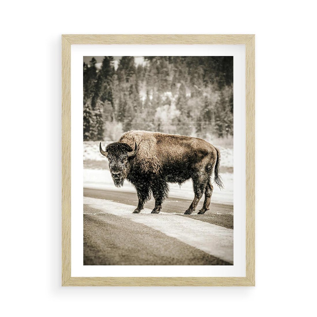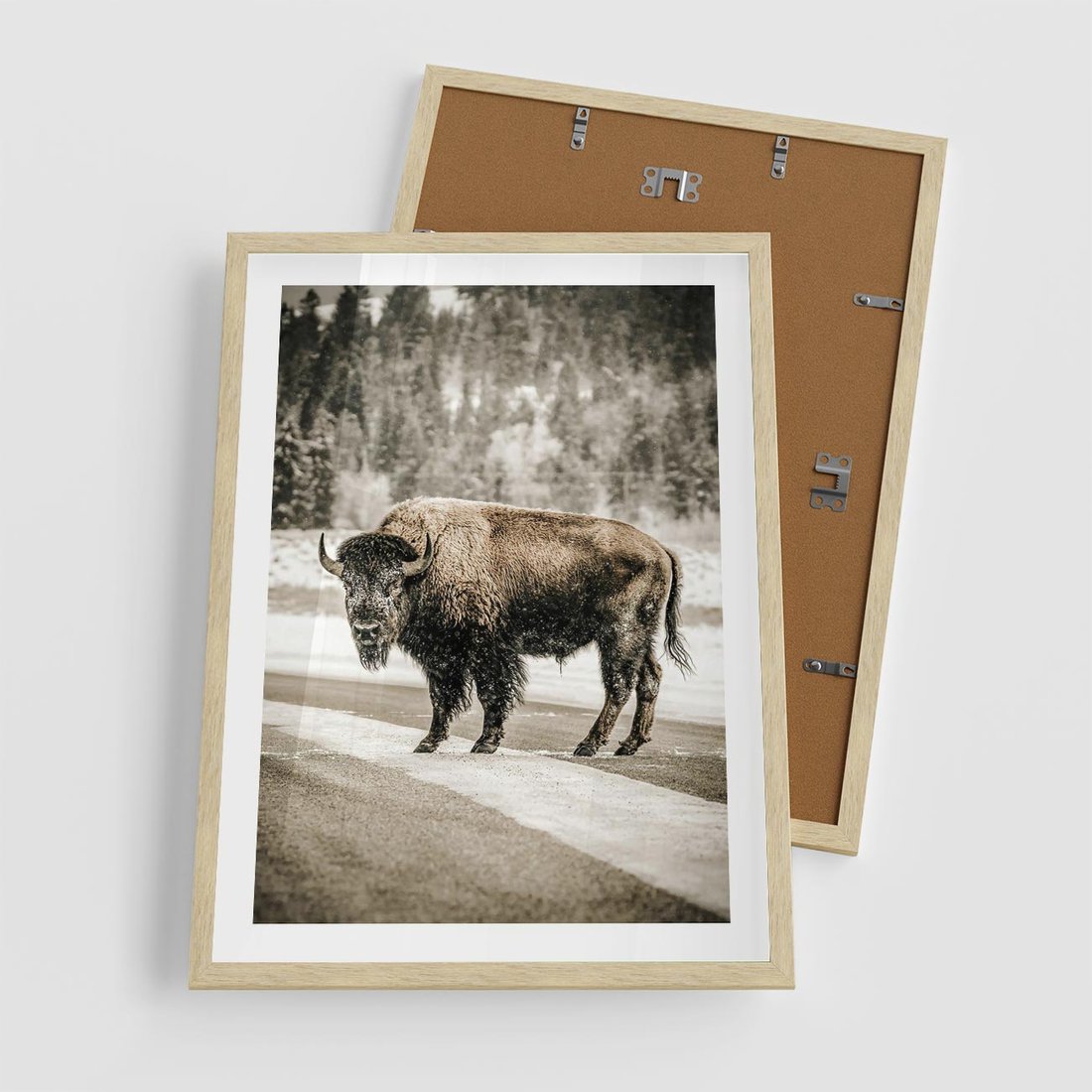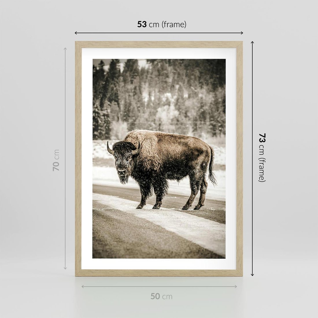 Plakat w ramie 50x70 - Spotkanie z Żubrem na Leśnej Drodze - żubr, las - rama drewno