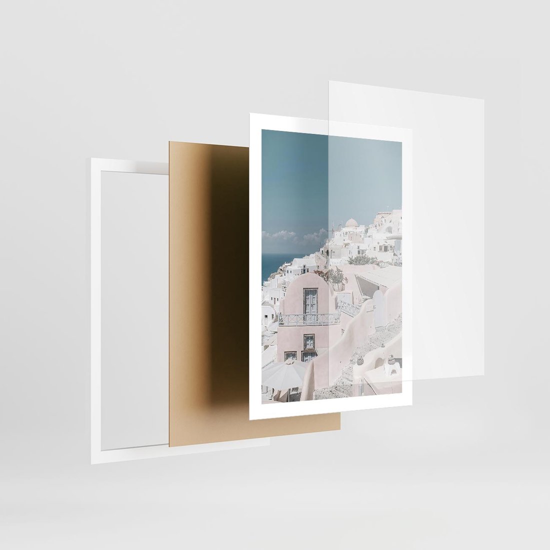 Plakat w ramie 50x70 - Śródziemnomorski Urok - zdjęcie Santorini, białe budynki - rama biała