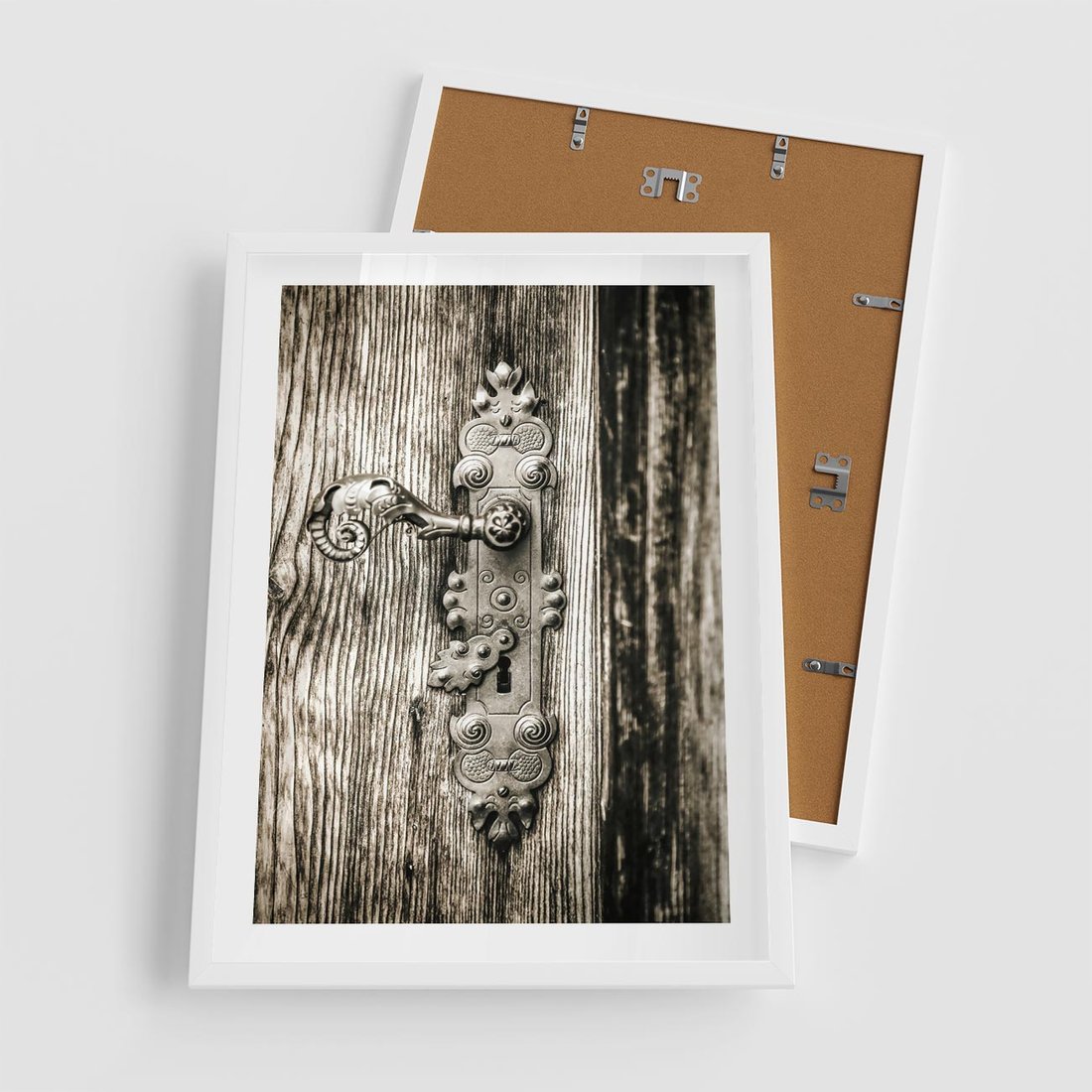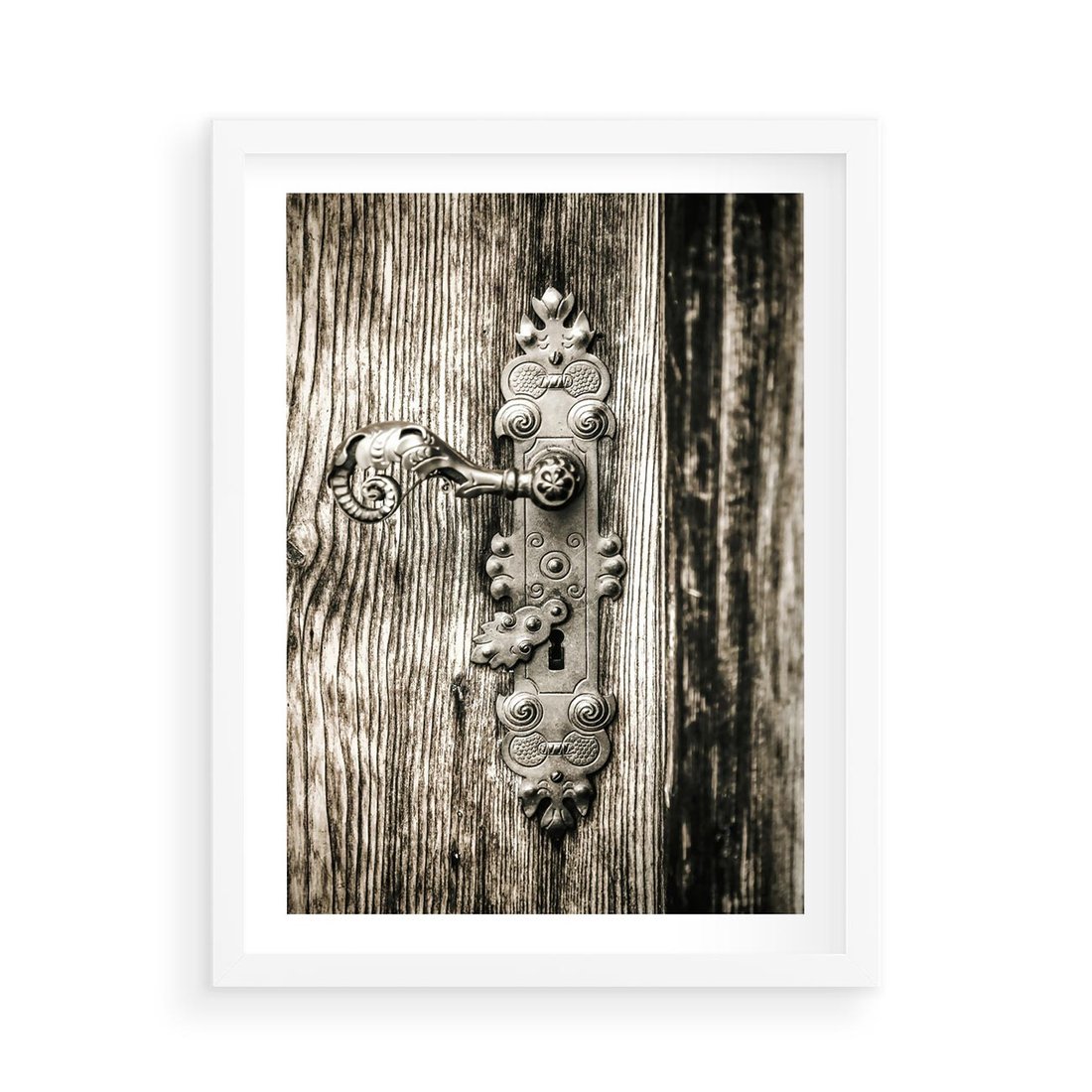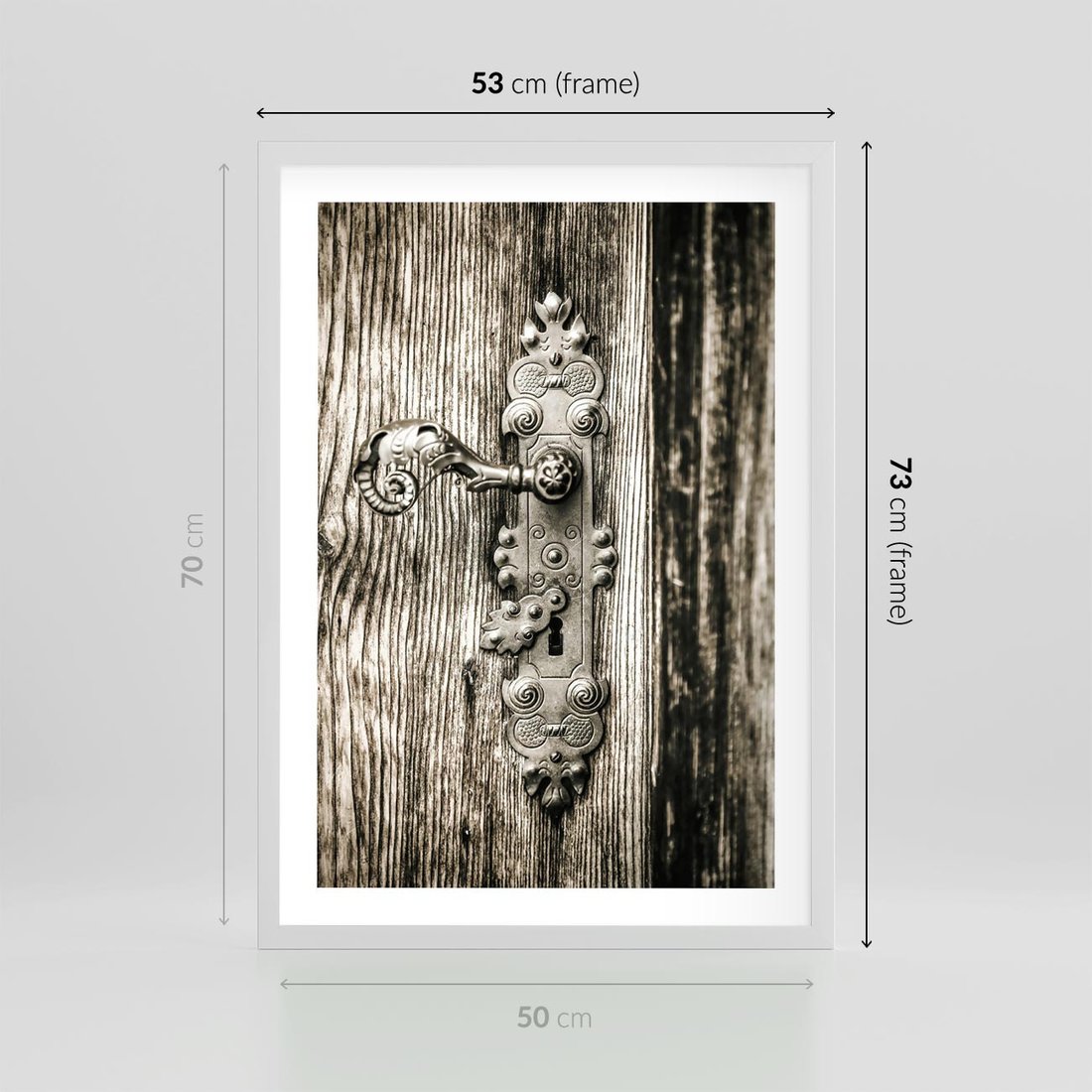 Plakat w ramie 50x70 - Stare Drzwi z Ozdobną Klamką - stare drzwi, klamka - rama biała