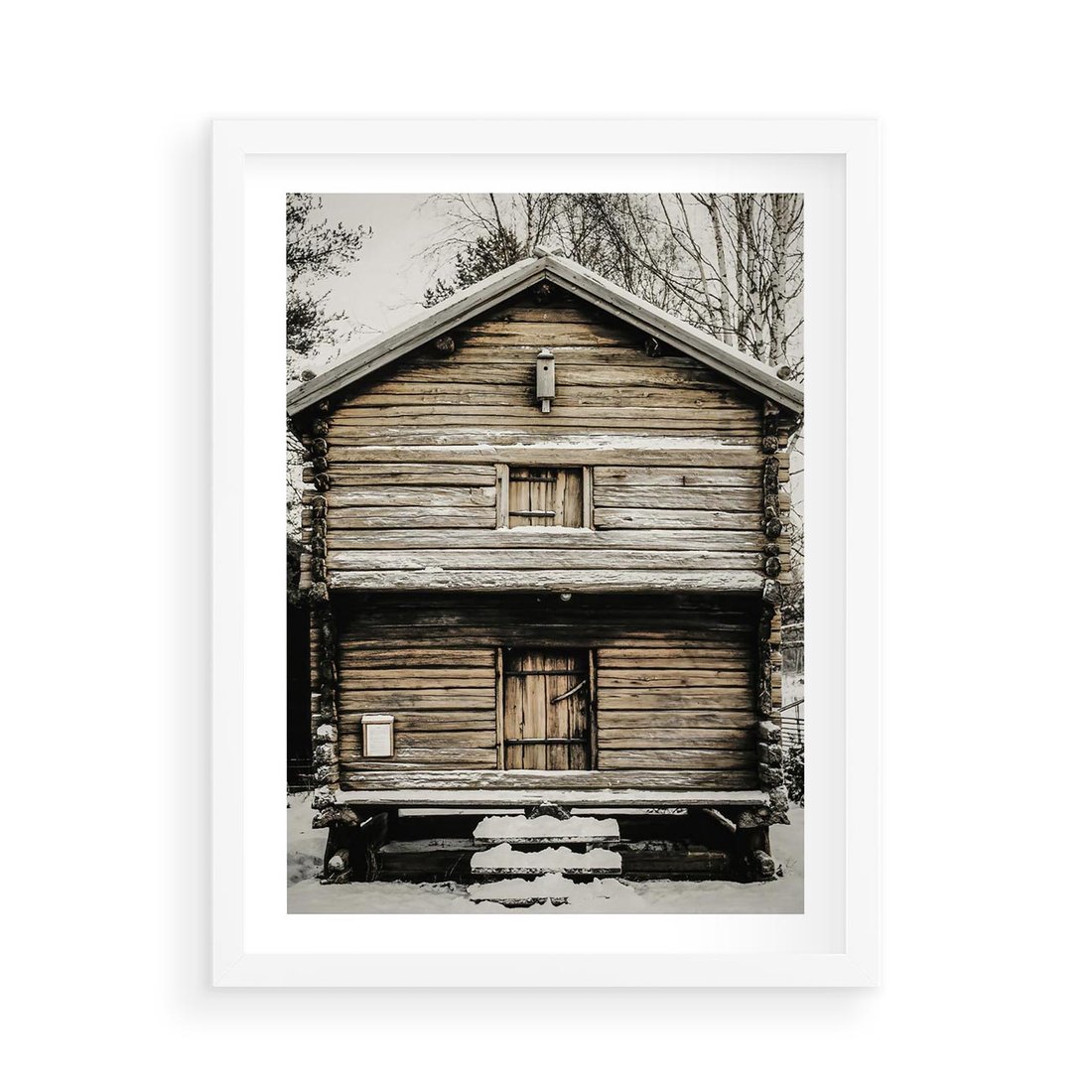 Plakat w ramie 50x70 - Stary Drewniany Dom w Śniegu - stary drewniany dom, zima - rama biała