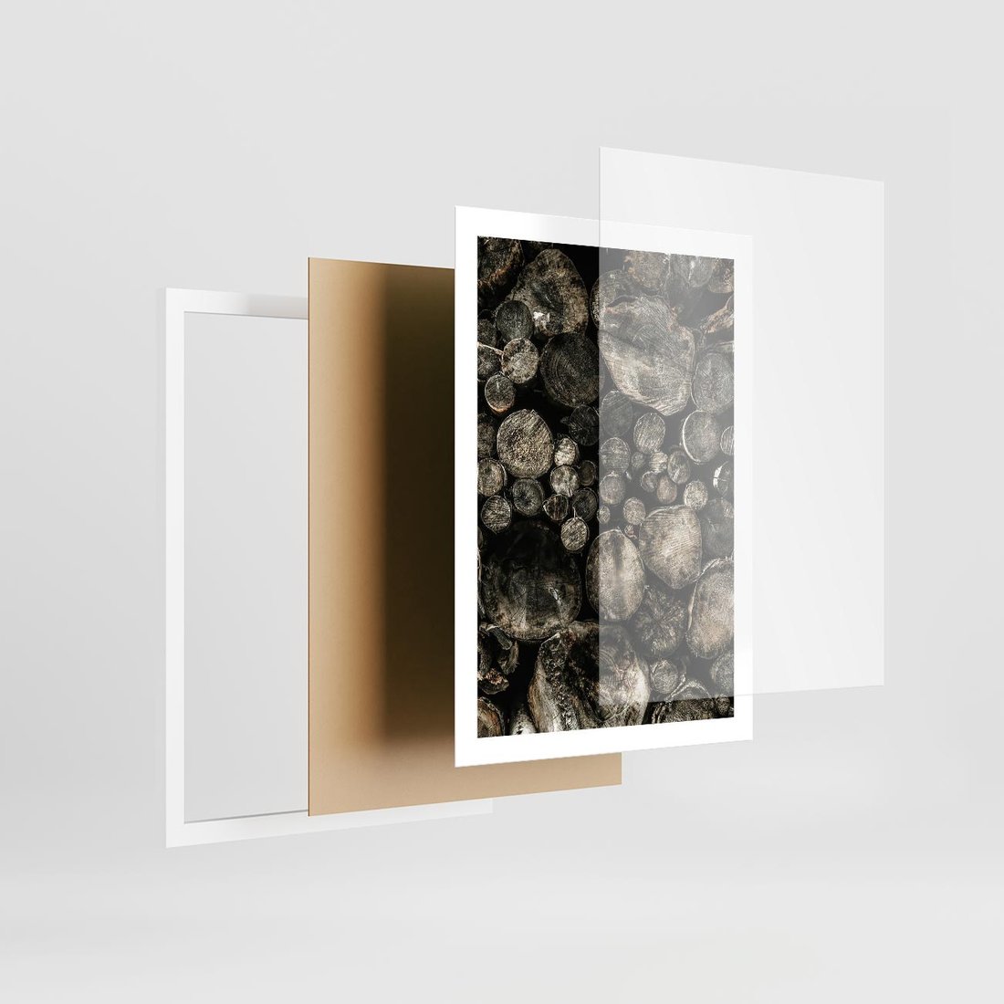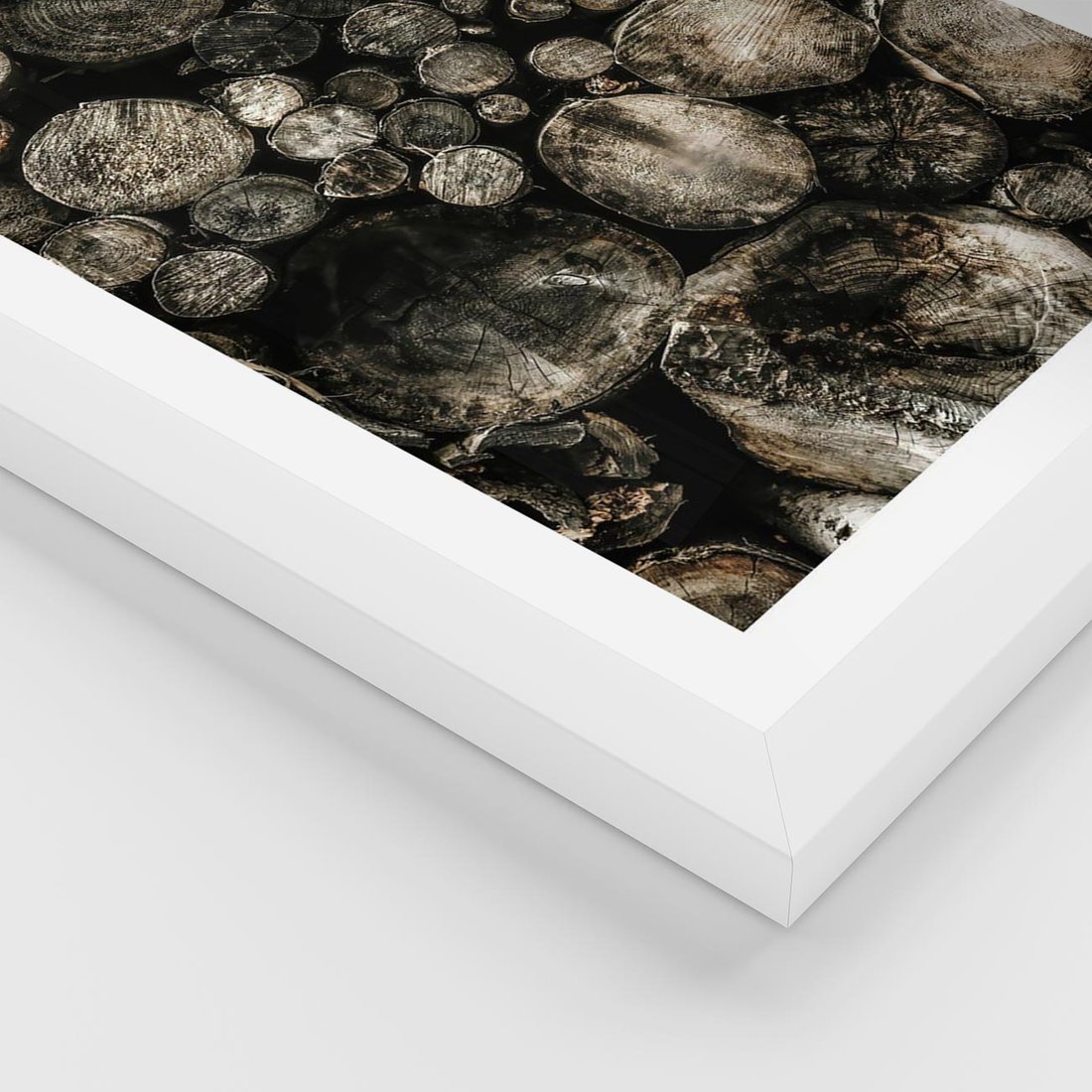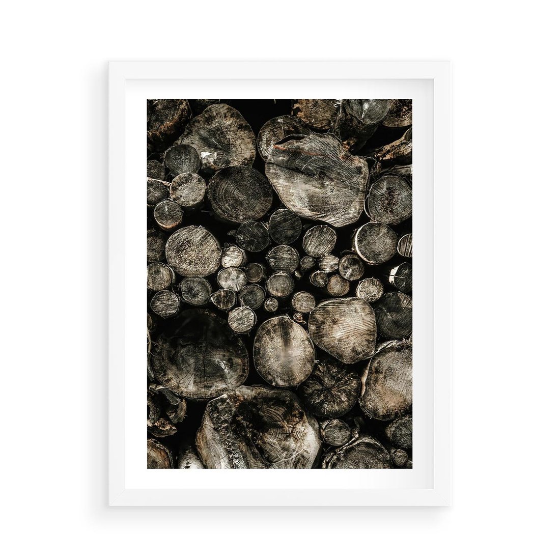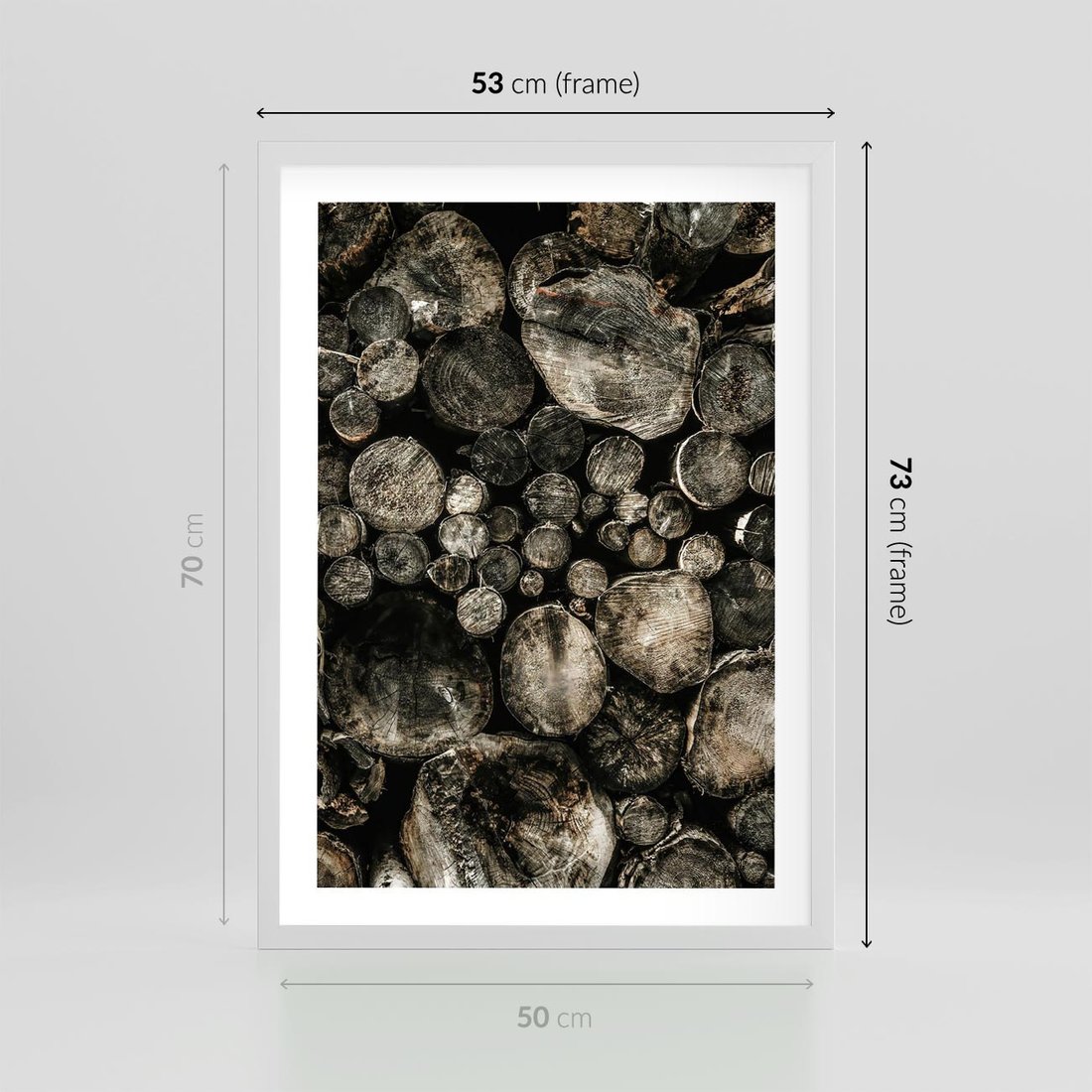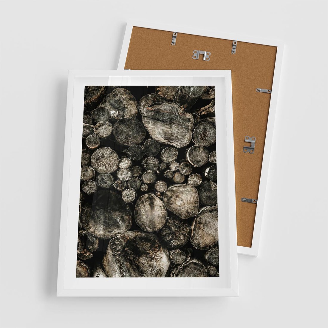 Plakat w ramie 50x70 - Stos Drewna - kłody drewna, pociete drweno - rama biała