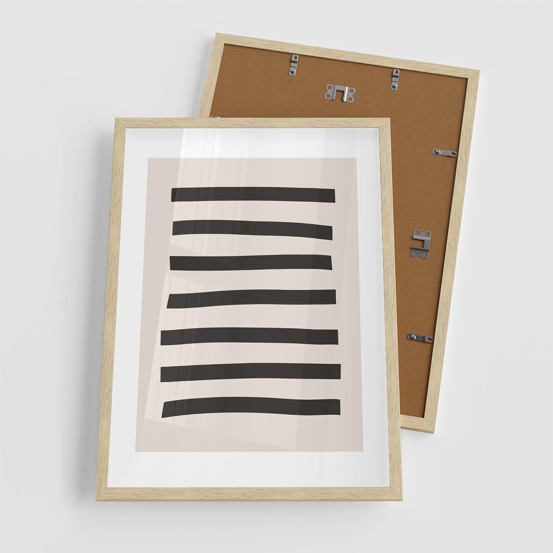 Nasz minimalistyczny plakat to eleganckie czarne pasy na spokojnym beżowym tle. To wyjątkowe połączenie tworzy harmonijny akcent, idealny do wprowadzenia do Twojej przestrzeni spokoju i nowoczesnej estetyki minimalizmu.