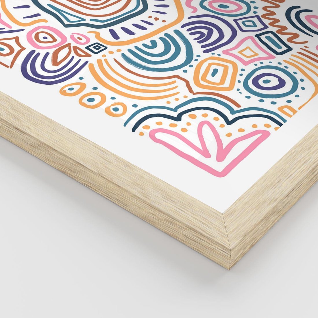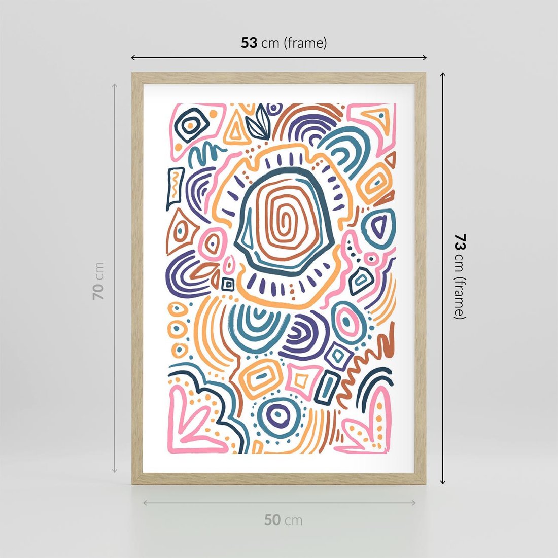 Ten nowoczesny plakat przedstawia kolorowe etniczne wzory w tęczowych, żywych kolorach. To dynamiczne i wyraziste połączenie wzorów i kolorów wprowadza do Twojej przestrzeni energię i żywiołowość, tworząc jednocześnie unikalny akcent artystyczny.