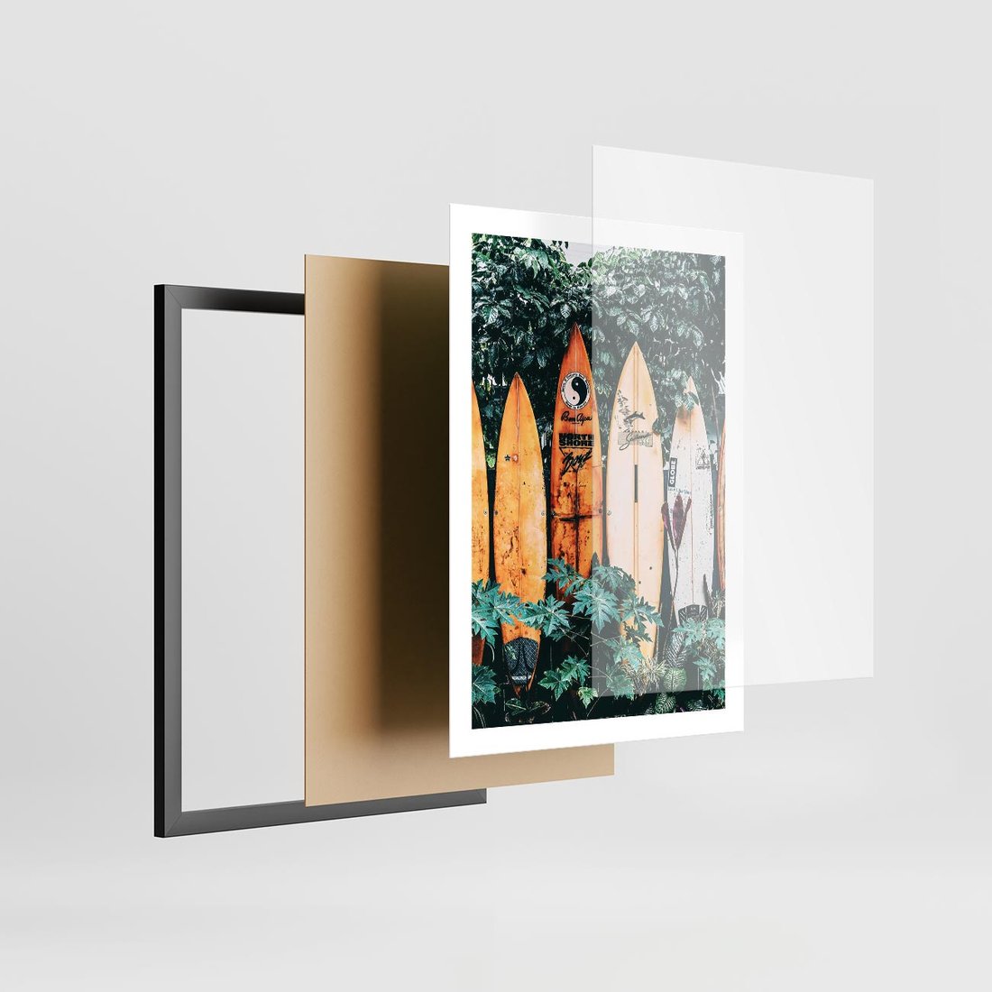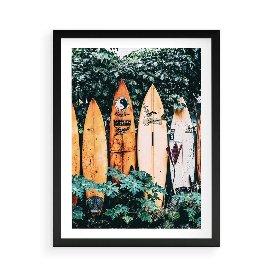Plakat w ramie 50x70 - Surfowanie w Harmonii z Naturą - deski surfingowe, oparte o rośliny - rama czarna