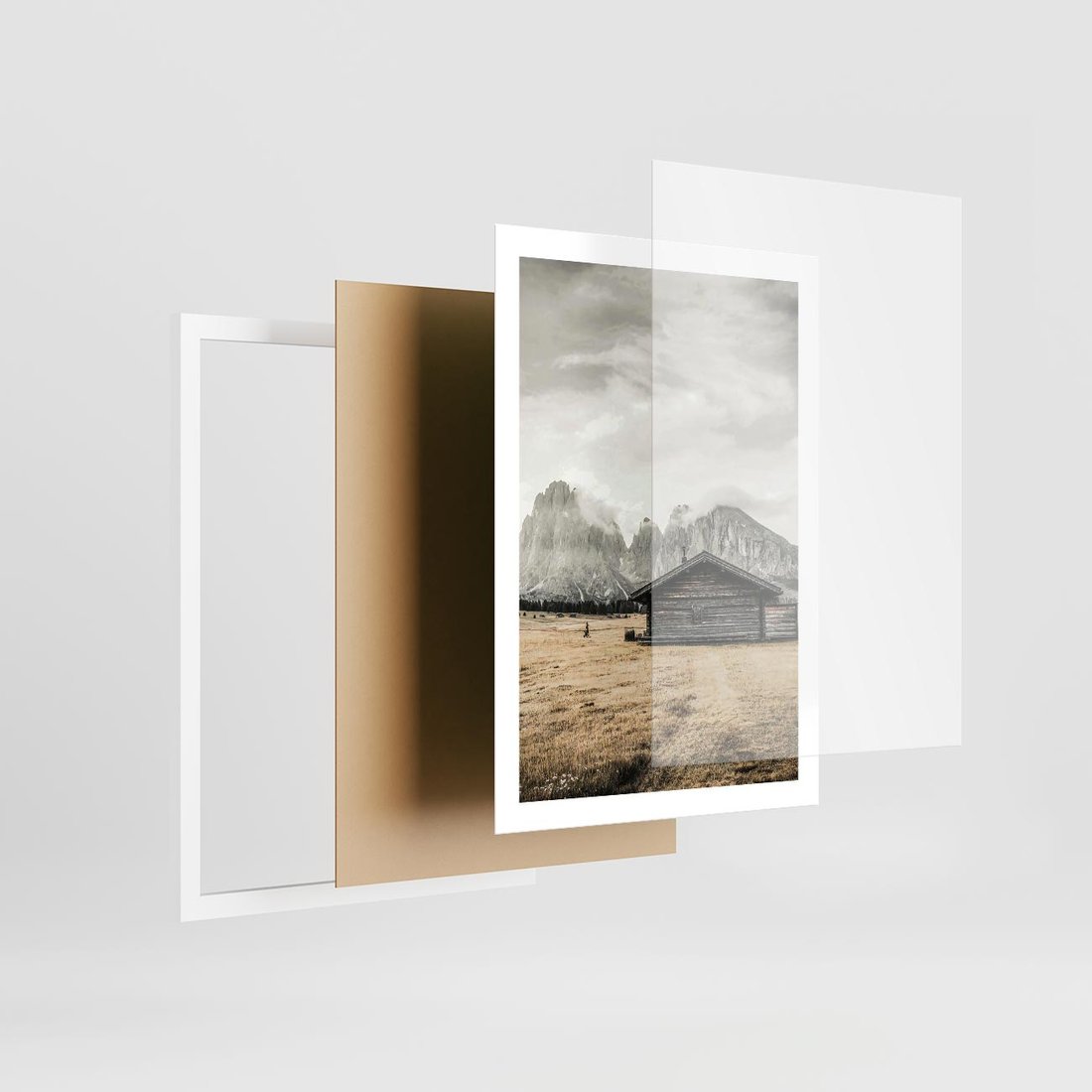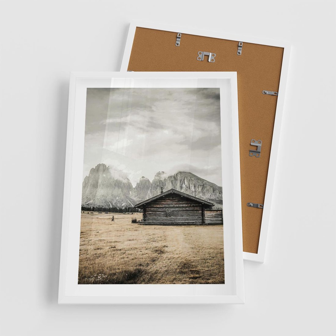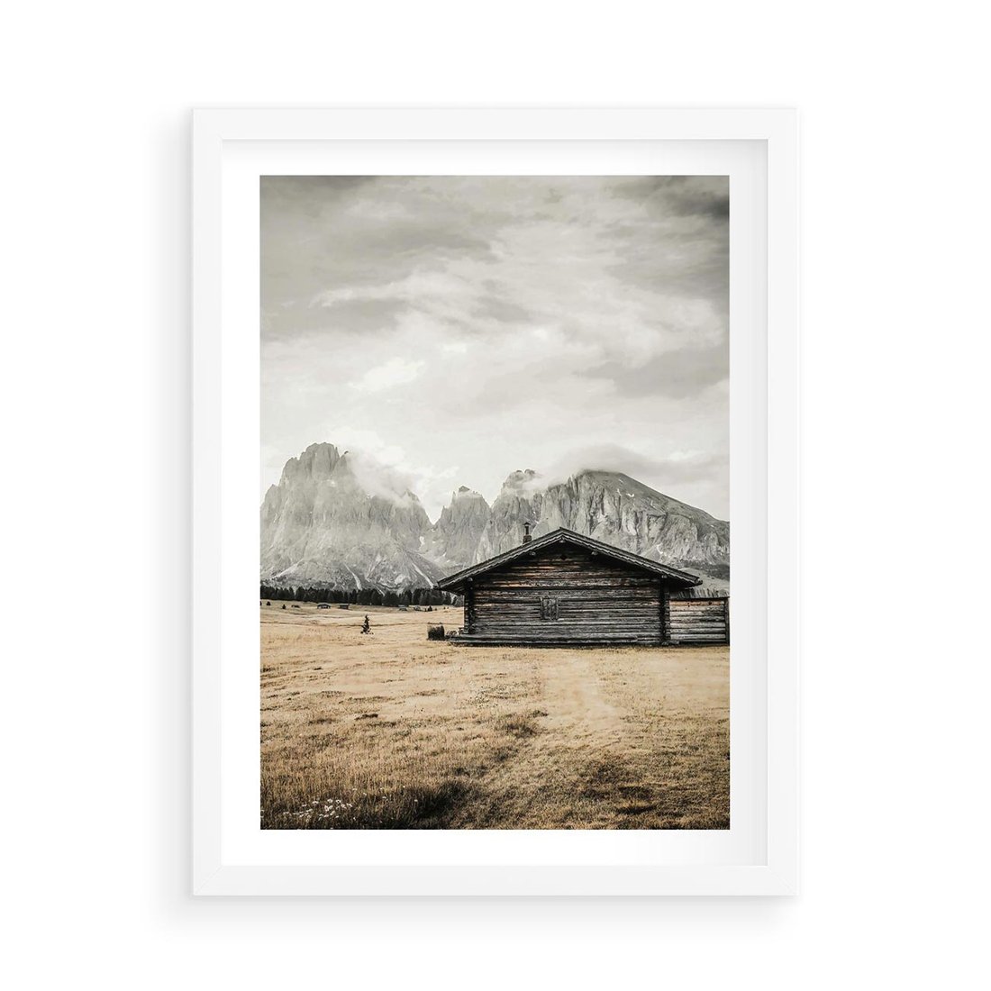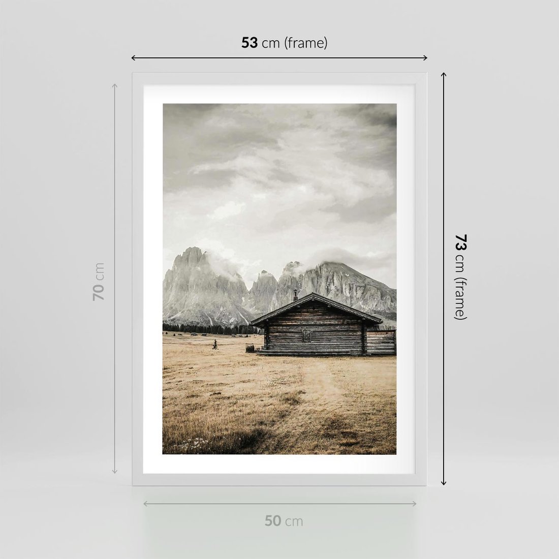 Plakat w ramie 50x70 - Surowa Przestrzeń i Górski Ustronny Azyl - chatka w górach, góry - rama biała