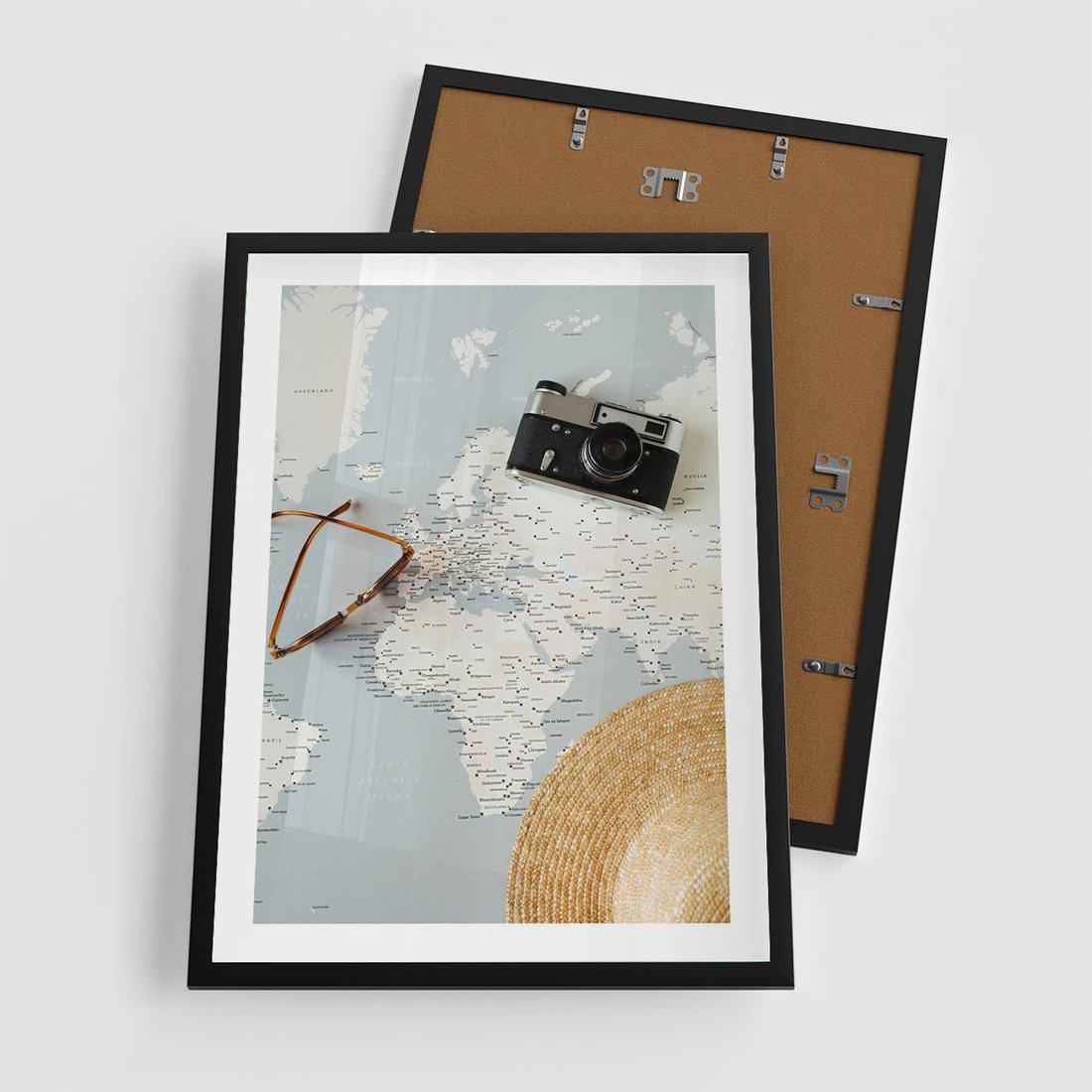 Plakat w ramie 50x70 - Świat w Kadrze - mapa, aparat - rama czarna