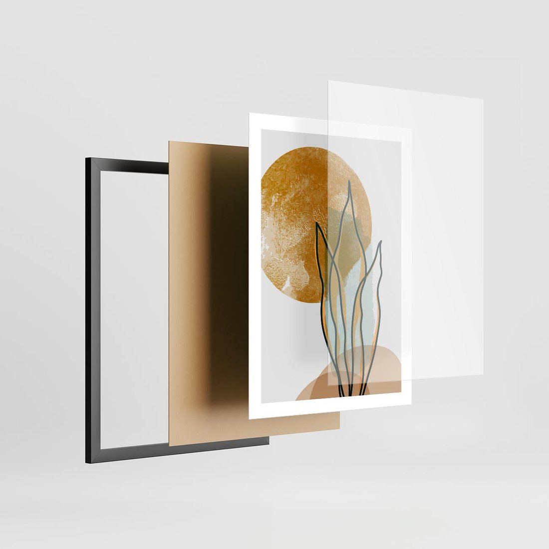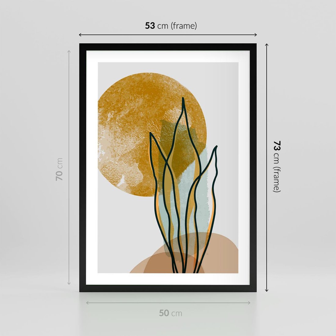 - Plakat w ramie 50x70 - Światło Natury: Graficzne Liście i Złote Słońce