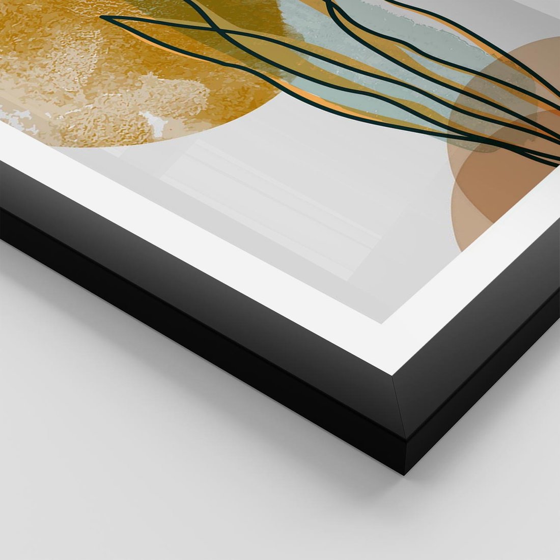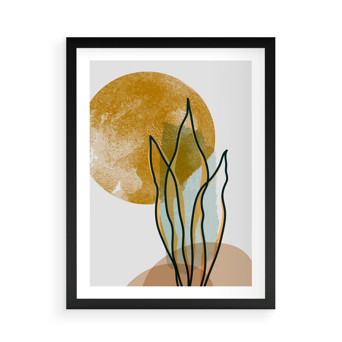 Plakat w ramie 50x70 - Światło Natury: Graficzne Liście i Złote Słońce - grafika, graficzne liście - rama czarna
