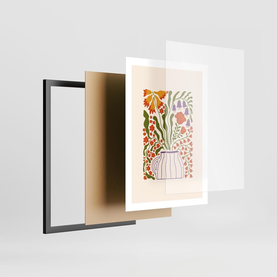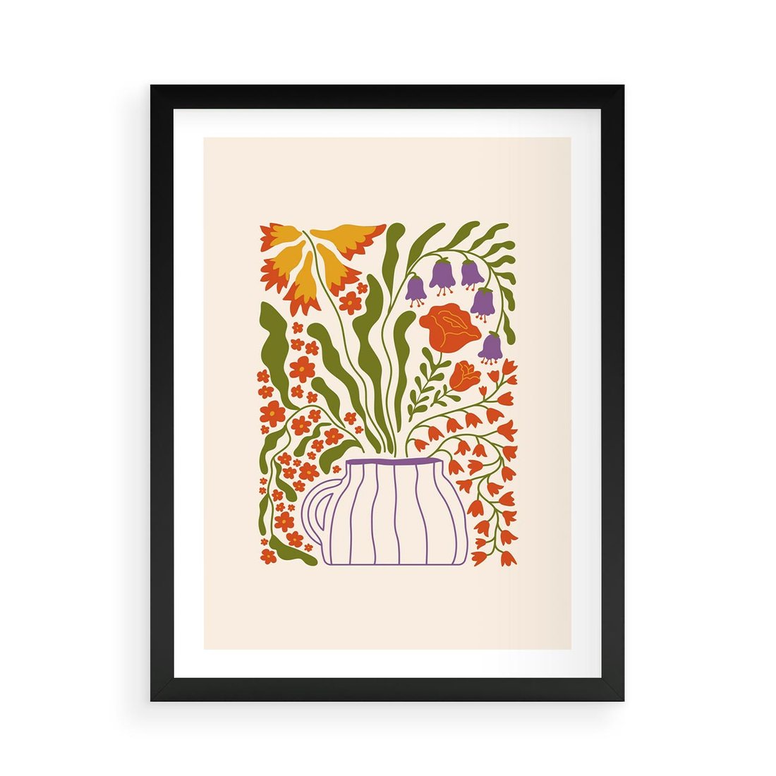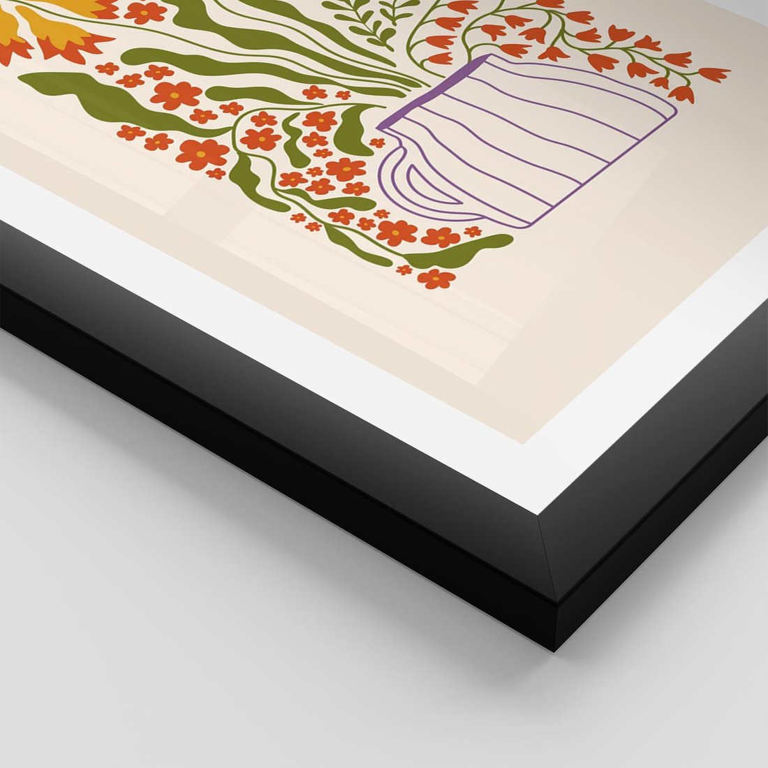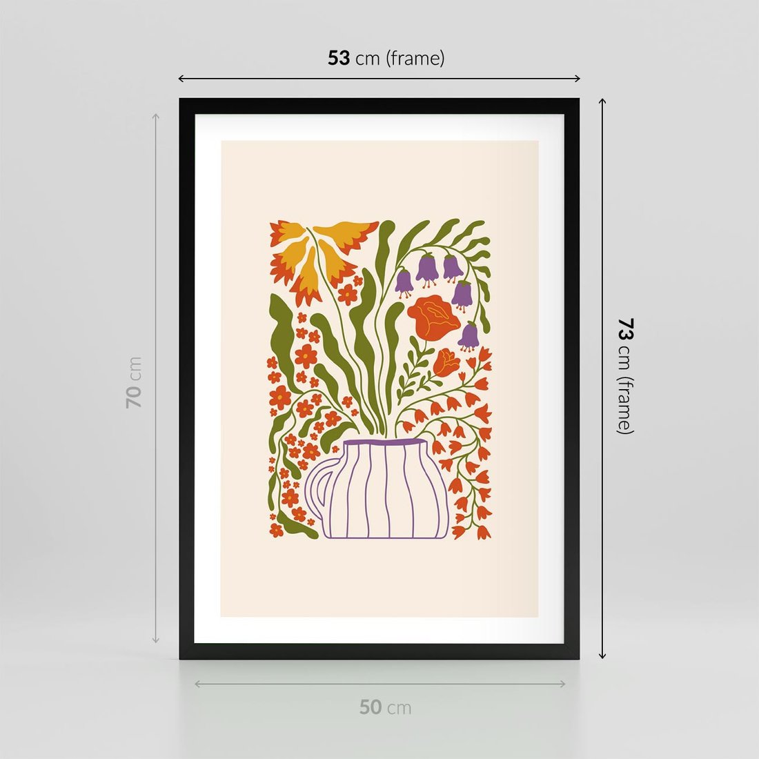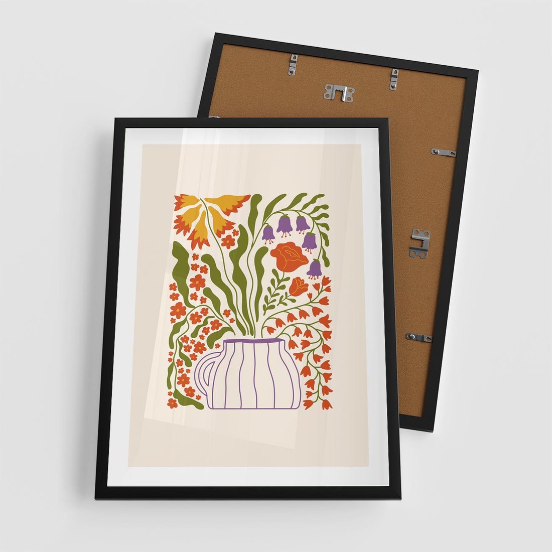 Ten plakat ukazuje kwiaty w wazonie w minimalistycznej kompozycji na białym tle. Zastosowanie żywych kolorów tworzy wrażenie świeżości i radości, podczas gdy minimalistyczny styl dodaje elegancji. Ta praca sztuki wprowadza do przestrzeni wyjątkową harmonię natury i estetyki.