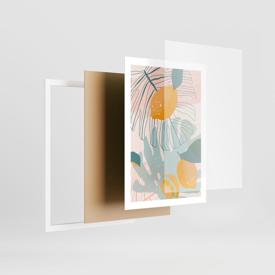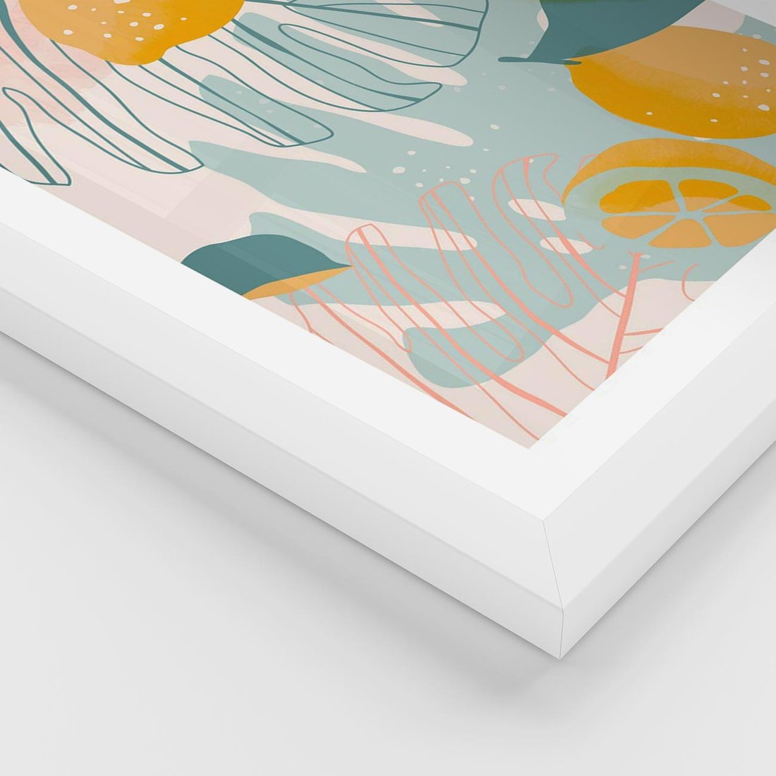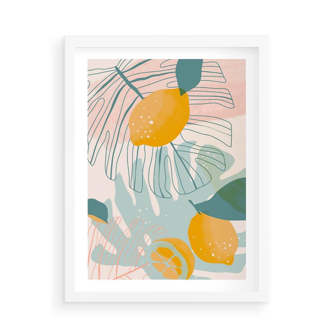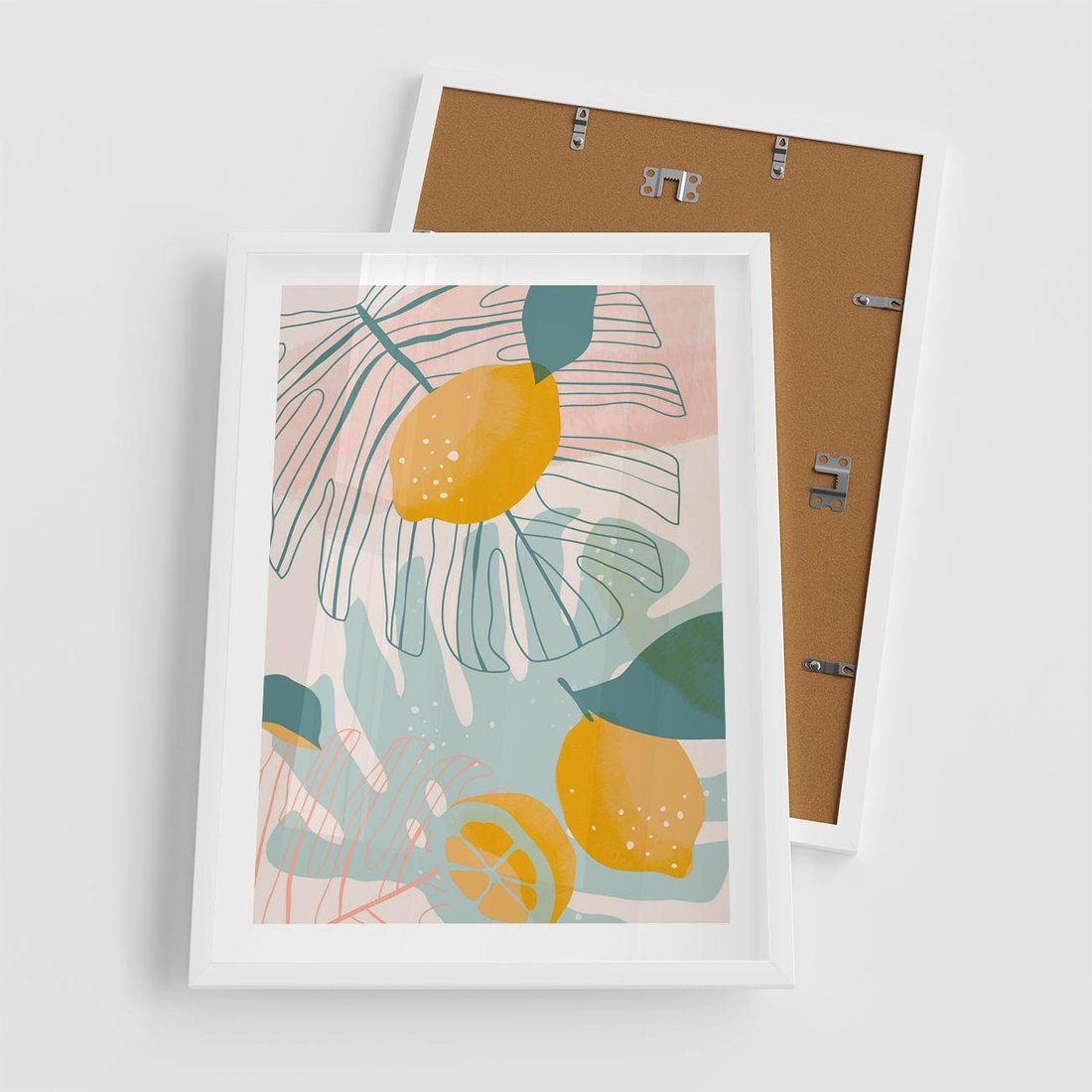 To plakat z nowoczesną grafiką, w którym dominują pastelowe kolory i motywy liści monstery oraz cytryn. Plakat łączy w sobie świeżość natury i nowoczesny design.