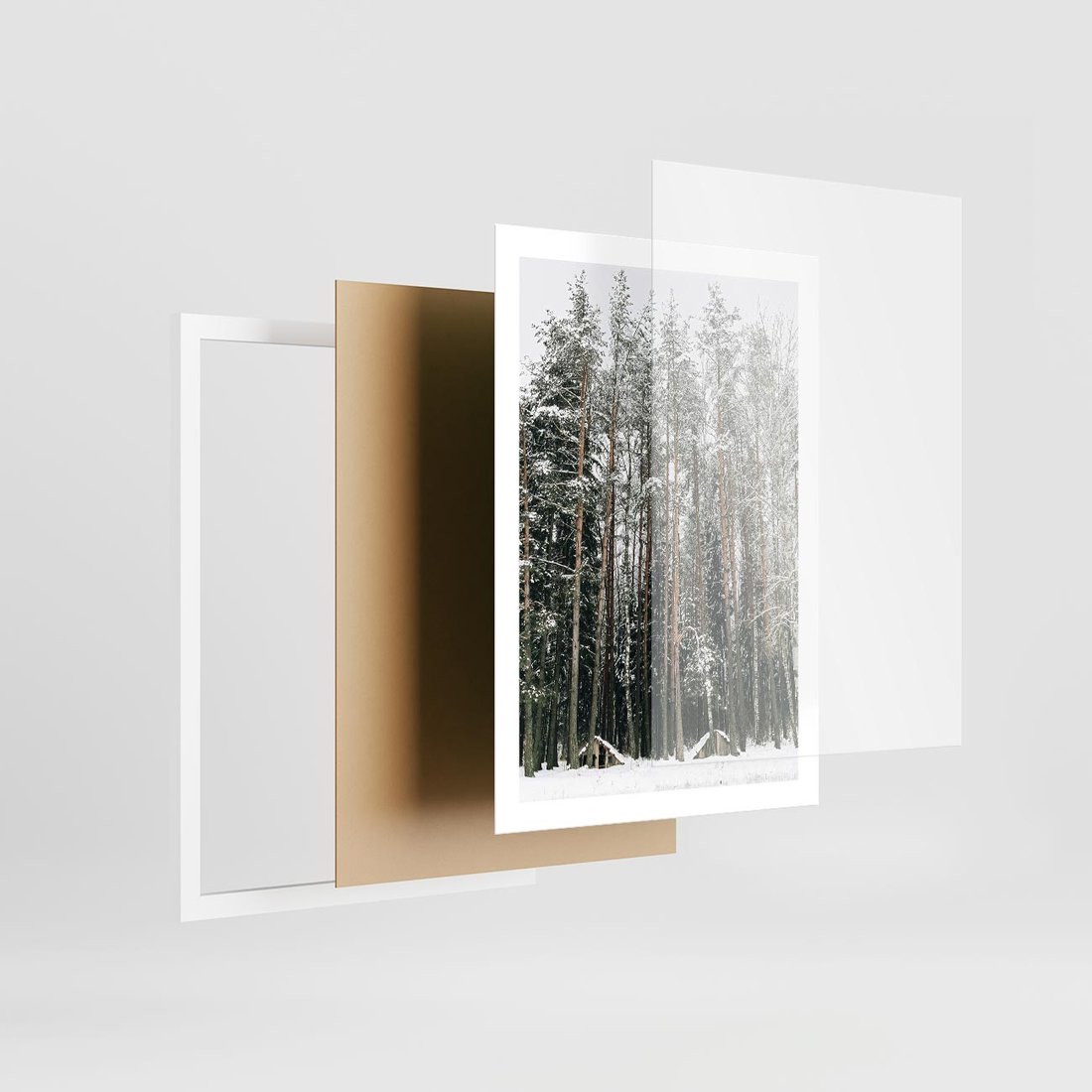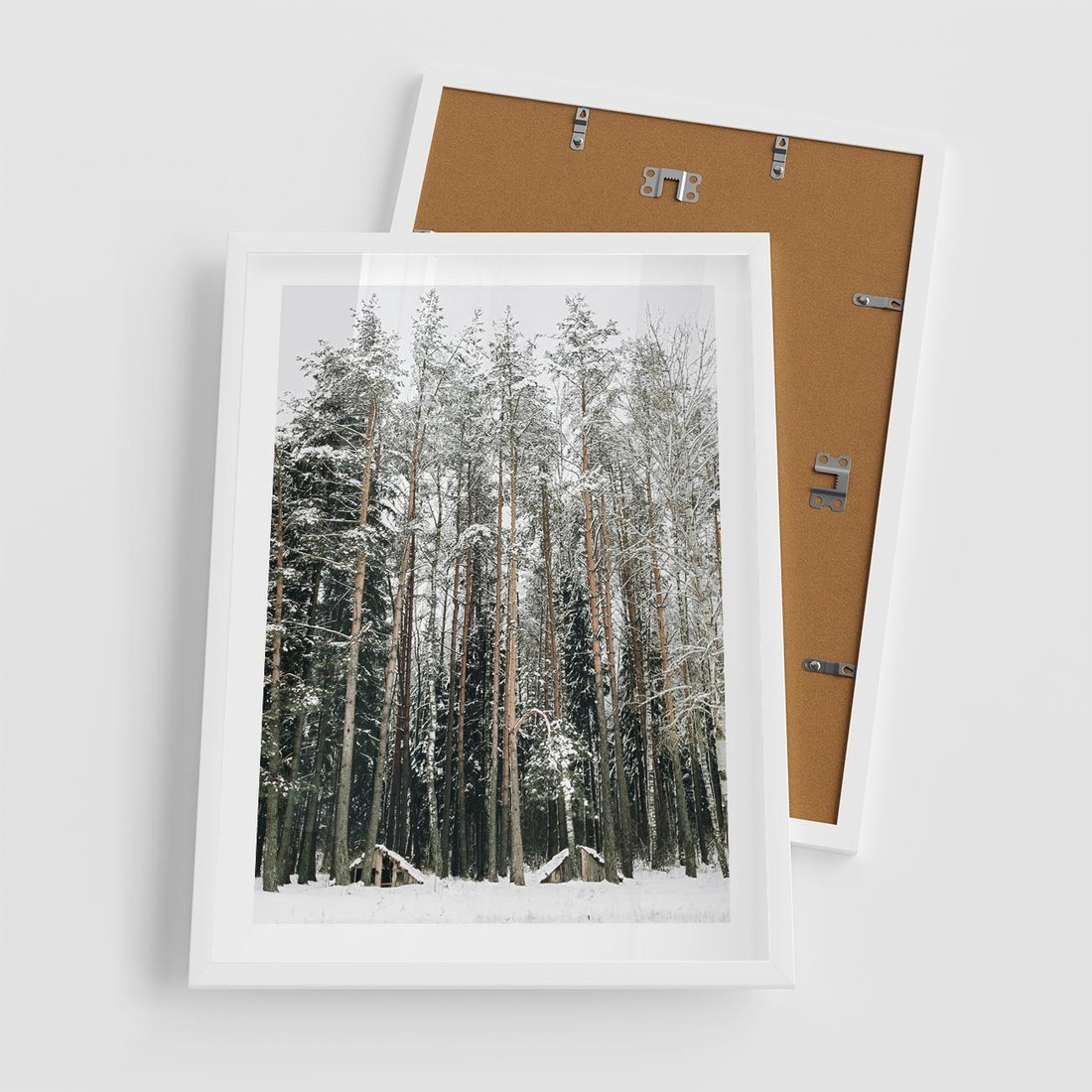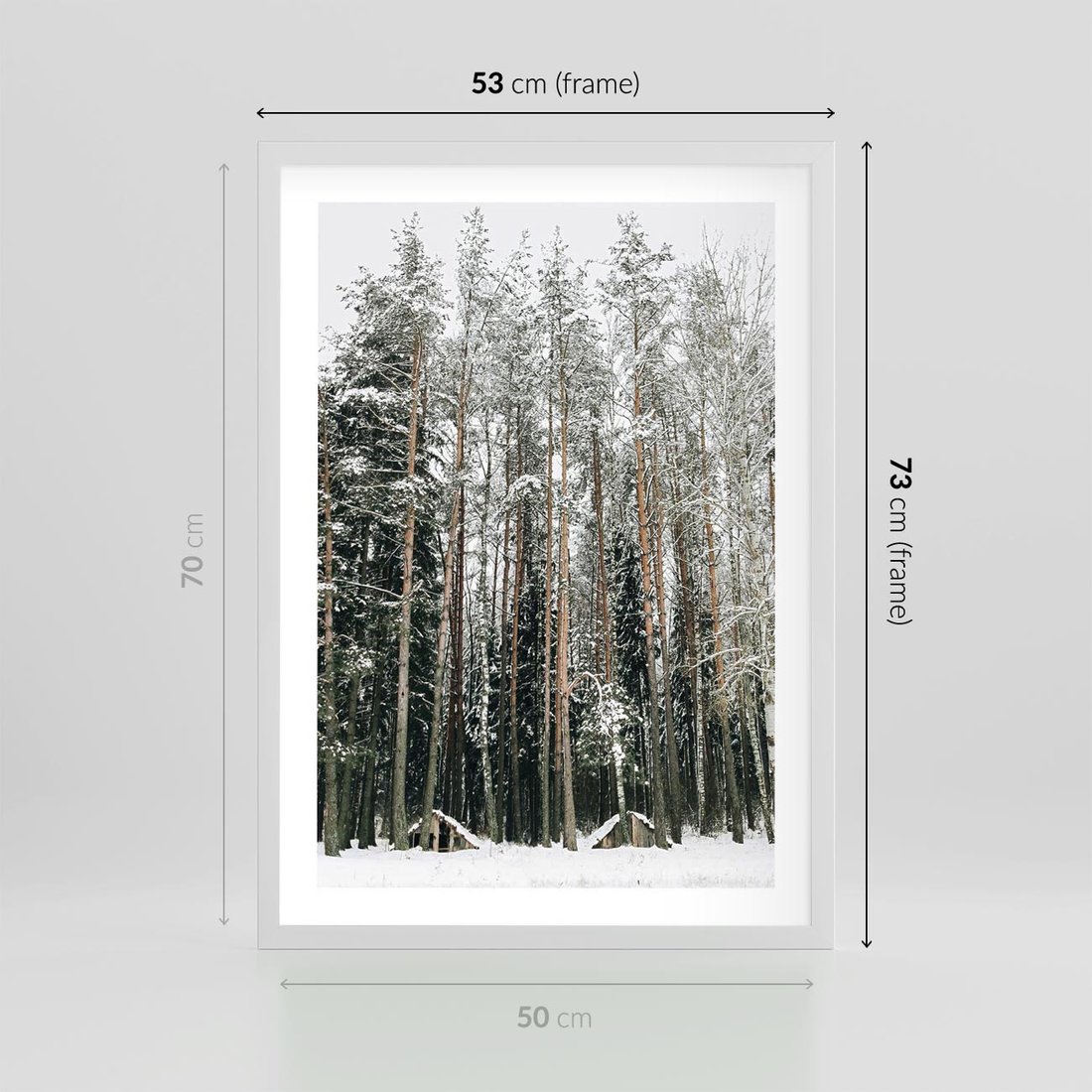 Plakat w ramie 50x70 - Sypiący Śnieg - las w zimie, drzewa pod śniegiem - rama biała