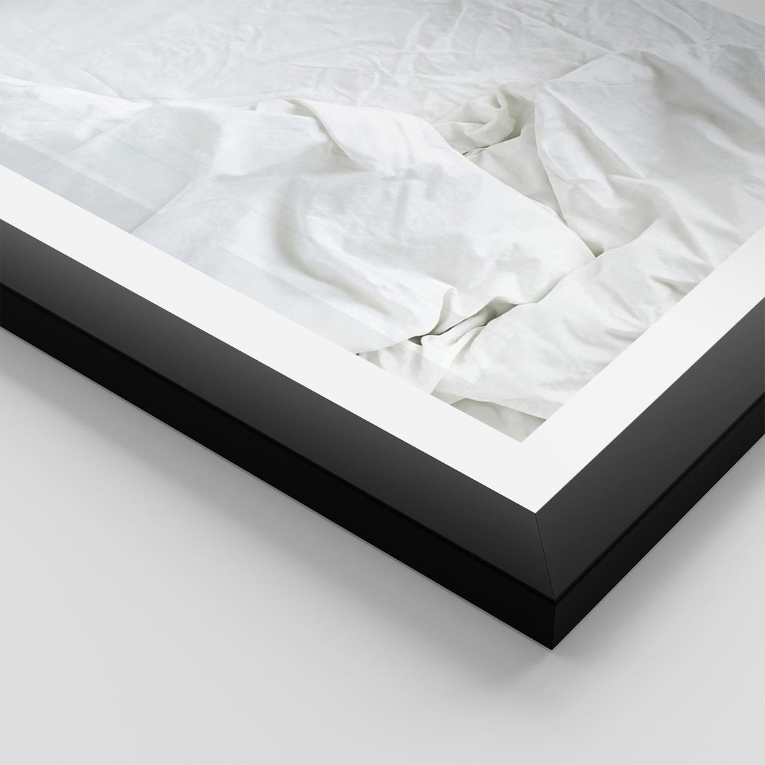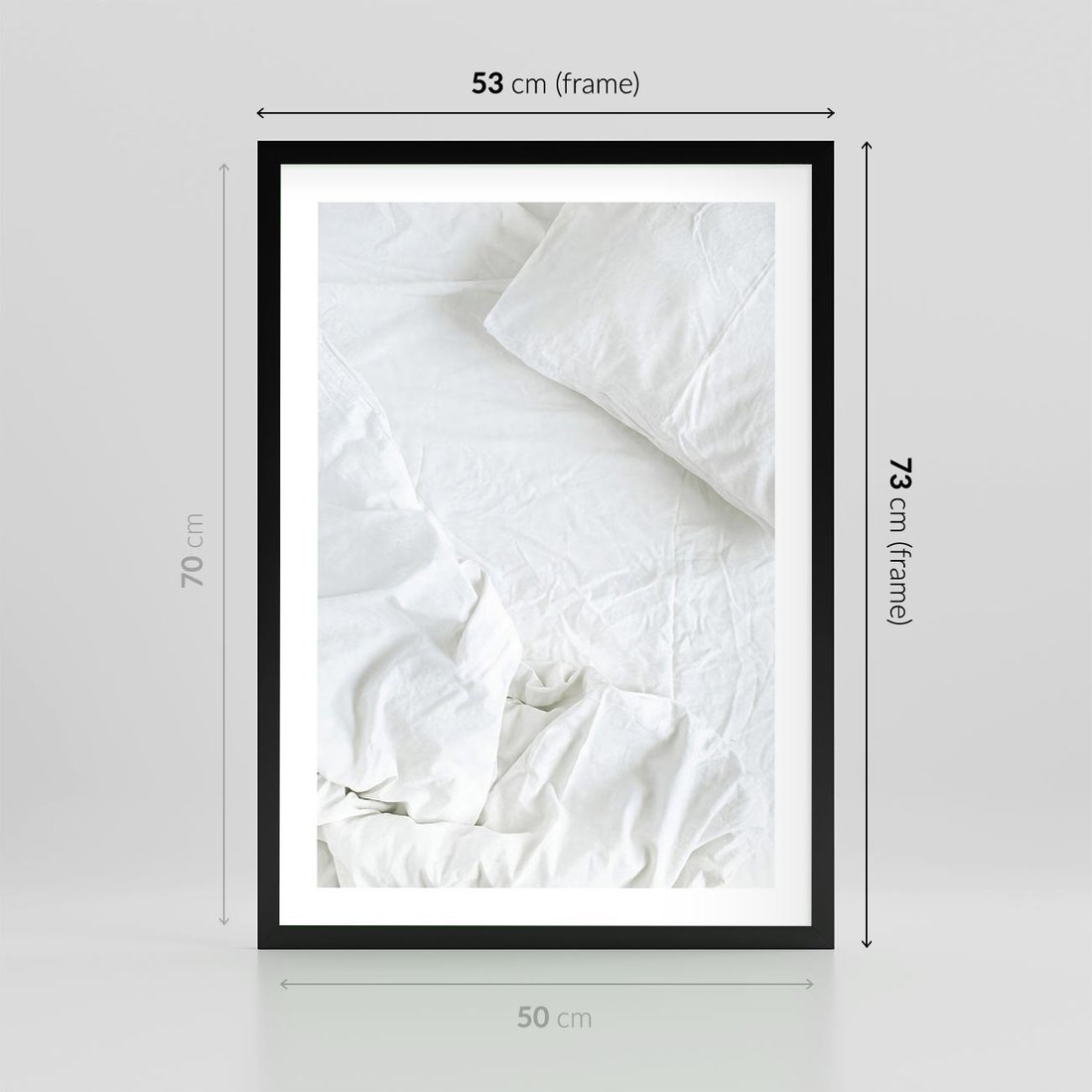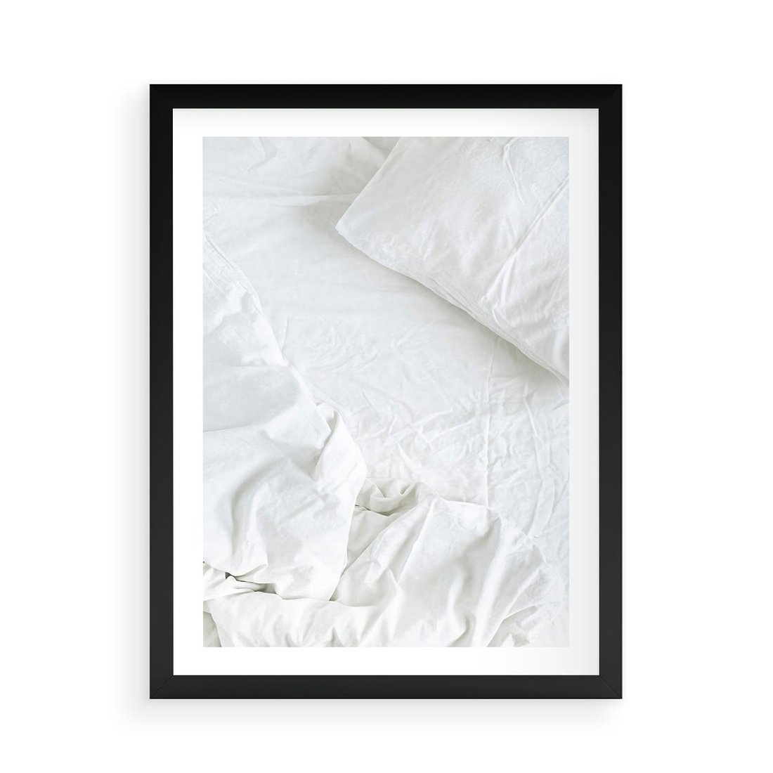 Plakat w ramie 50x70 - Sztuka i Komfort - pościel, biała kołdra poduszka - rama czarna