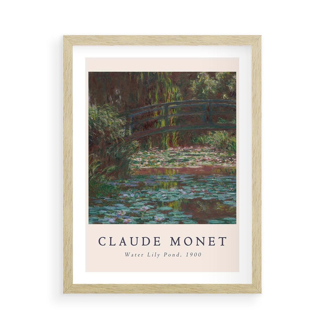 Reprodukcja słynnego obrazu Claude'a Moneta przedstawiającego staw z kwiatami, wzbogacona o starannie dobraną typografię, tworzy elegancki plakat artystyczny.