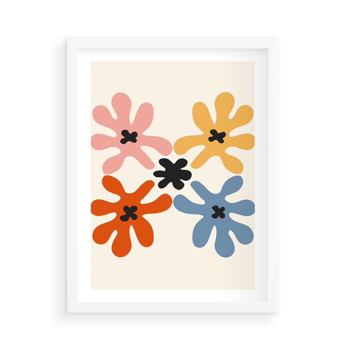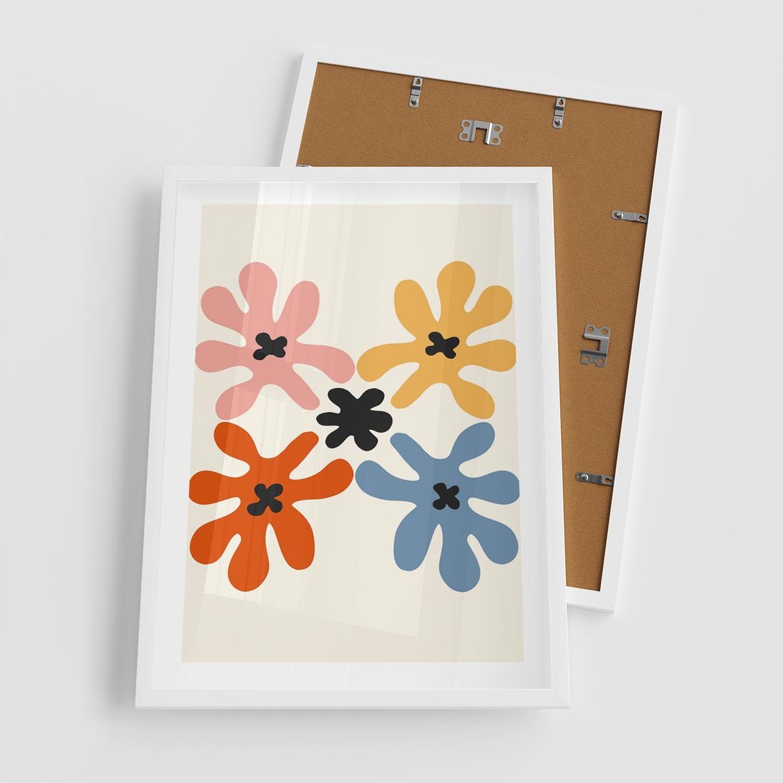 Ten minimalistyczny obraz przedstawia abstrakcyjne wielokolorowe kwiaty o dziwnych, intrygujących formach. Wykorzystując minimalizm, tworzy unikalny efekt wizualny, który ożywi i urozmaici każde wnętrze.
