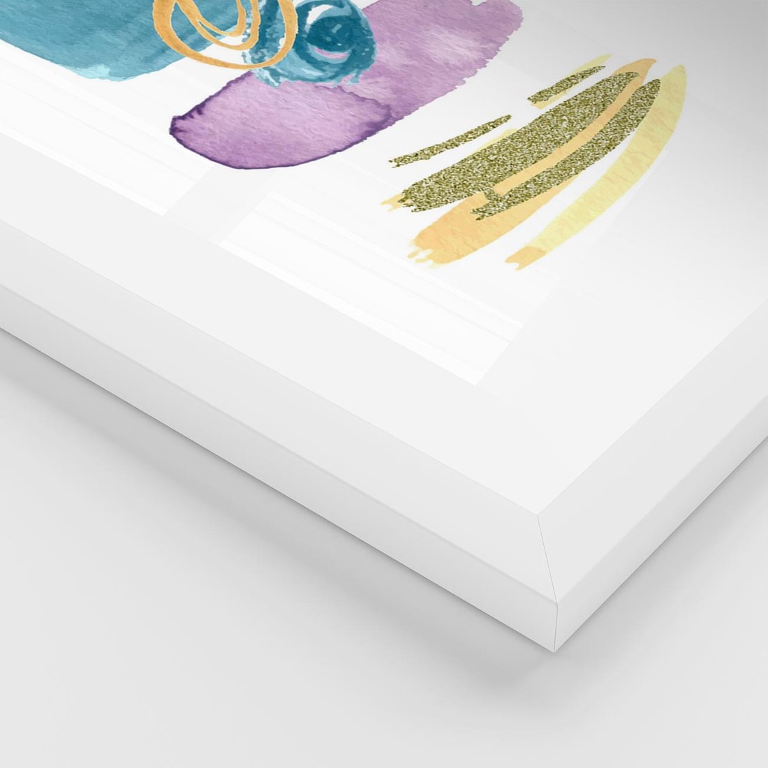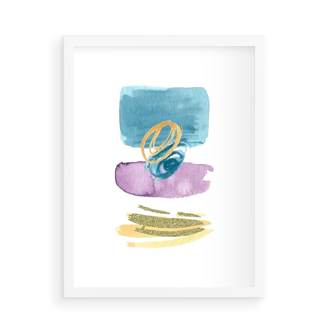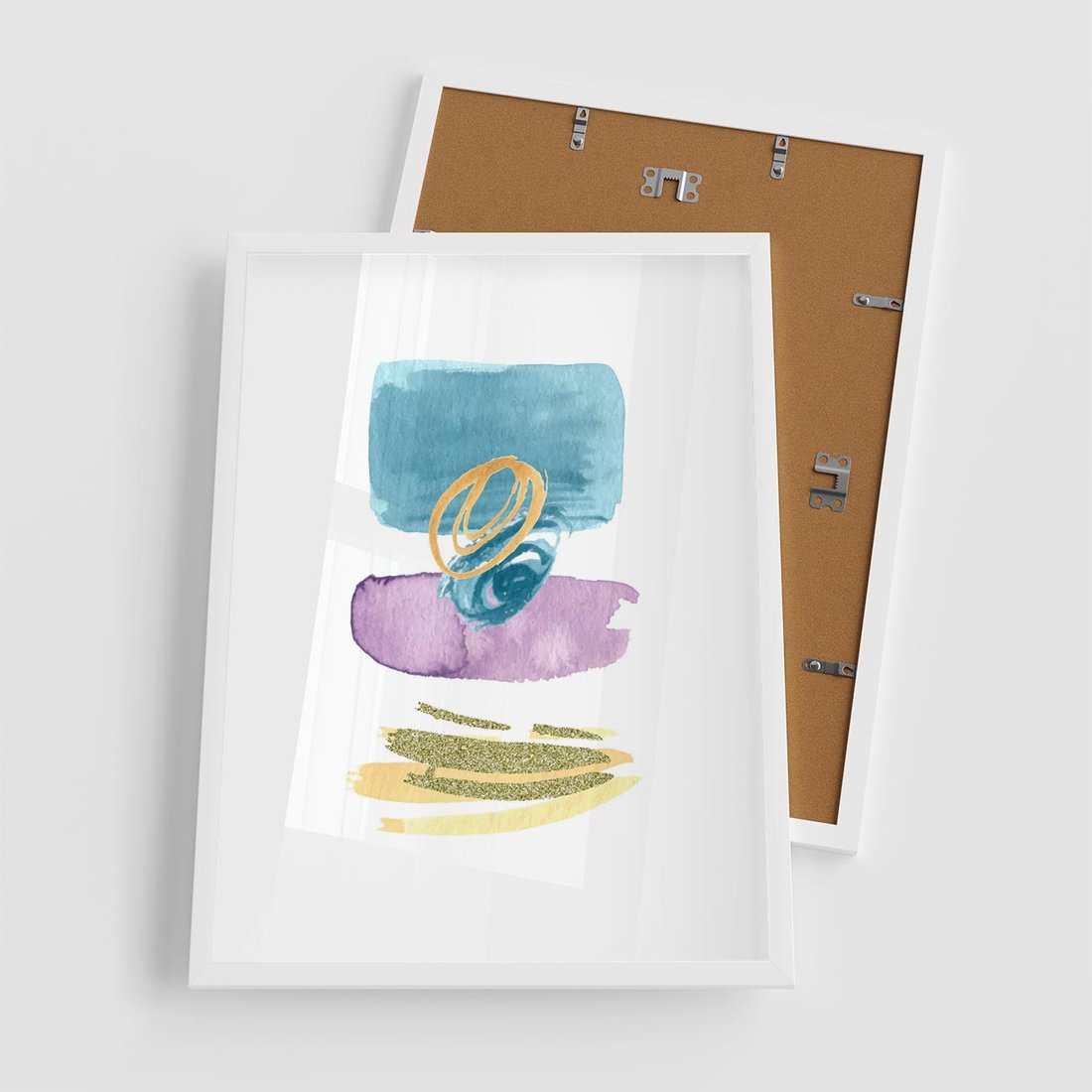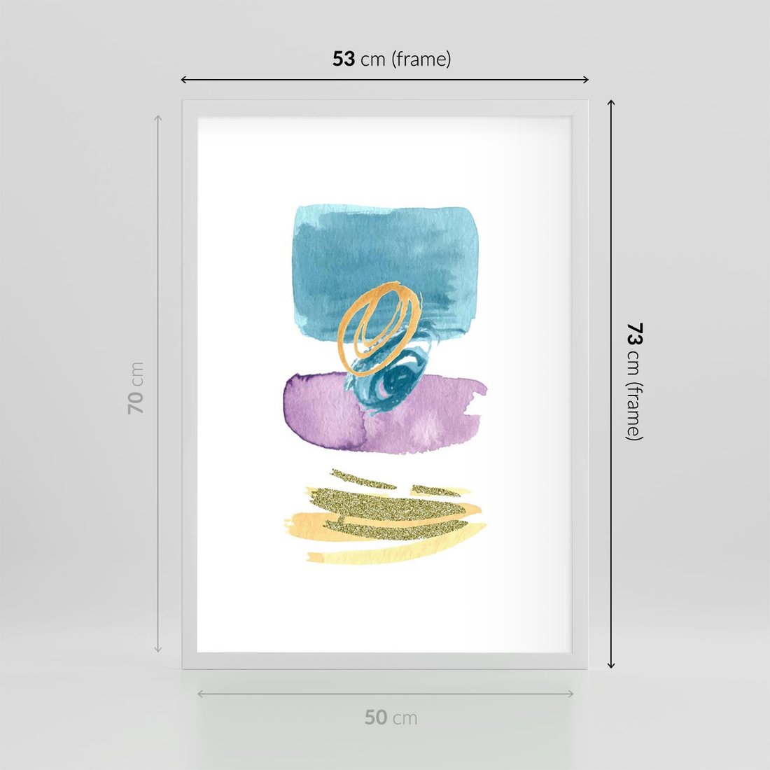 Plakat w ramie 50x70 - Taniec Akwarelowych Kresek - akwarelowe plamy w odcieniach błękitu, złote kreski - rama biała